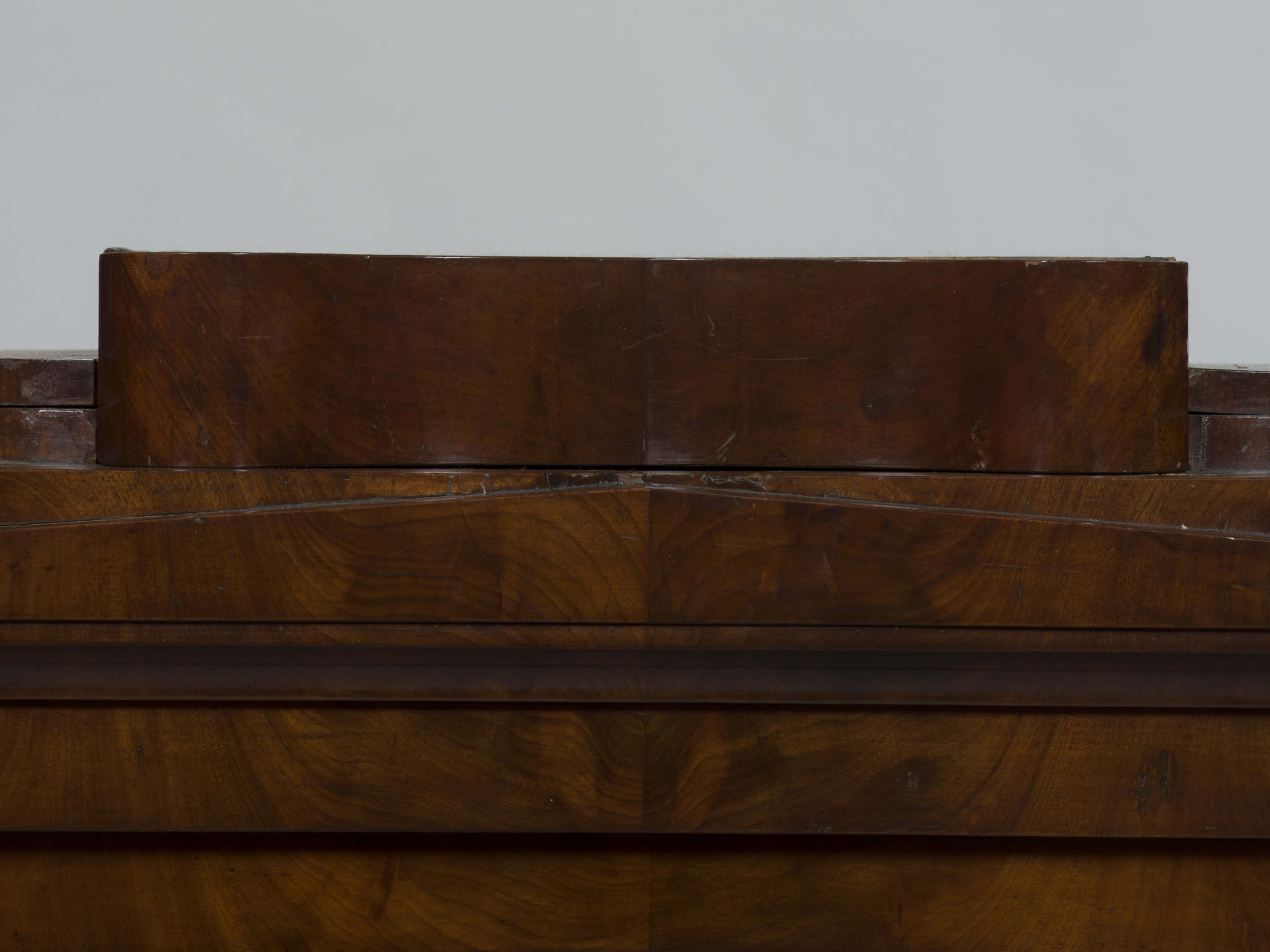 Serwantka prostopadłościenna z zaokrąglonymi rogami przednimi, na czterech płaskich nóżkach, wystających nieco poza lico ścianek. W dolnej części znajduje się pojedyncza wysoka zamykana na zamek szuflada. Część zasadnicza serwantki jest oszklona, zawiera dwie proste półki. W ściance przedniej znajdują się zamykane na zamek przeszklone drzwi podzielone na trzy poziome prostokątne kwatery, z których górna jest zamknięta płaskim łukiem. Listwy podziałowe znajdują się na wysokości półek, maskując ich krawędzie. Podobnie podzielone zostały ścianki boczne, z tą różnicą, że górne kwatery są w kształcie prostokąta. Wewnątrz na tylnej ścianie zamontowane jest lustro. Całość mebla u góry obiega bogato profilowany gzyms w środkowej partii rozszerzający w kształt płaskiego łuku, nad którym znajduje się zwieńczenie w formie płyty prostokątnej na której w części środkowej umieszczony został niski prostopadłościenny postument o ścianie czołowej w formie rozłożonej księgi, kryjący w sobie szufladkę. Po bokach postumentu znajdują się dwa niższe, wąskie, uformowane schodkowo każdy z dwóch płyt o zaokrąglonych przednich rogach i wklęsłych przednich krawędziach.
