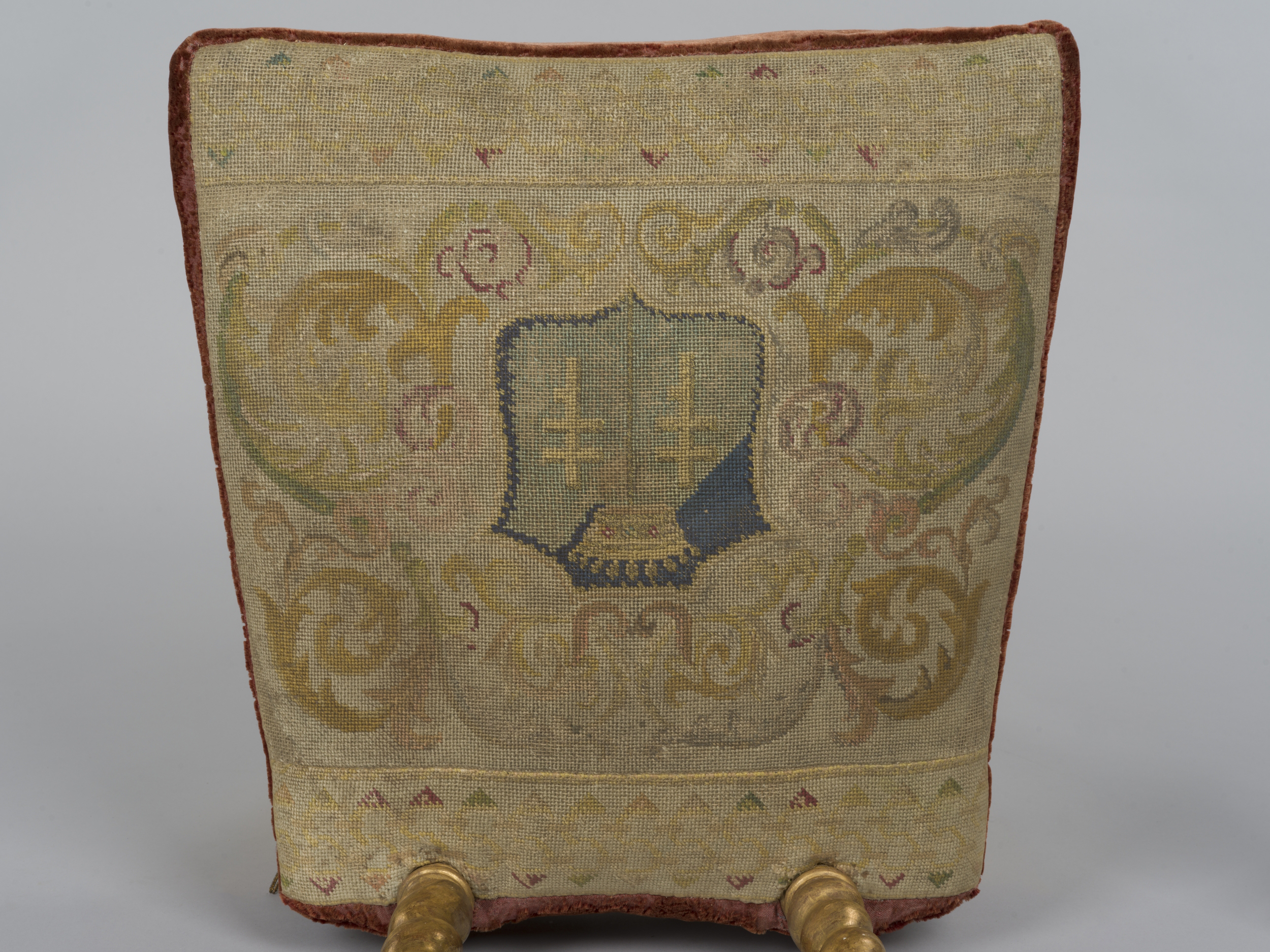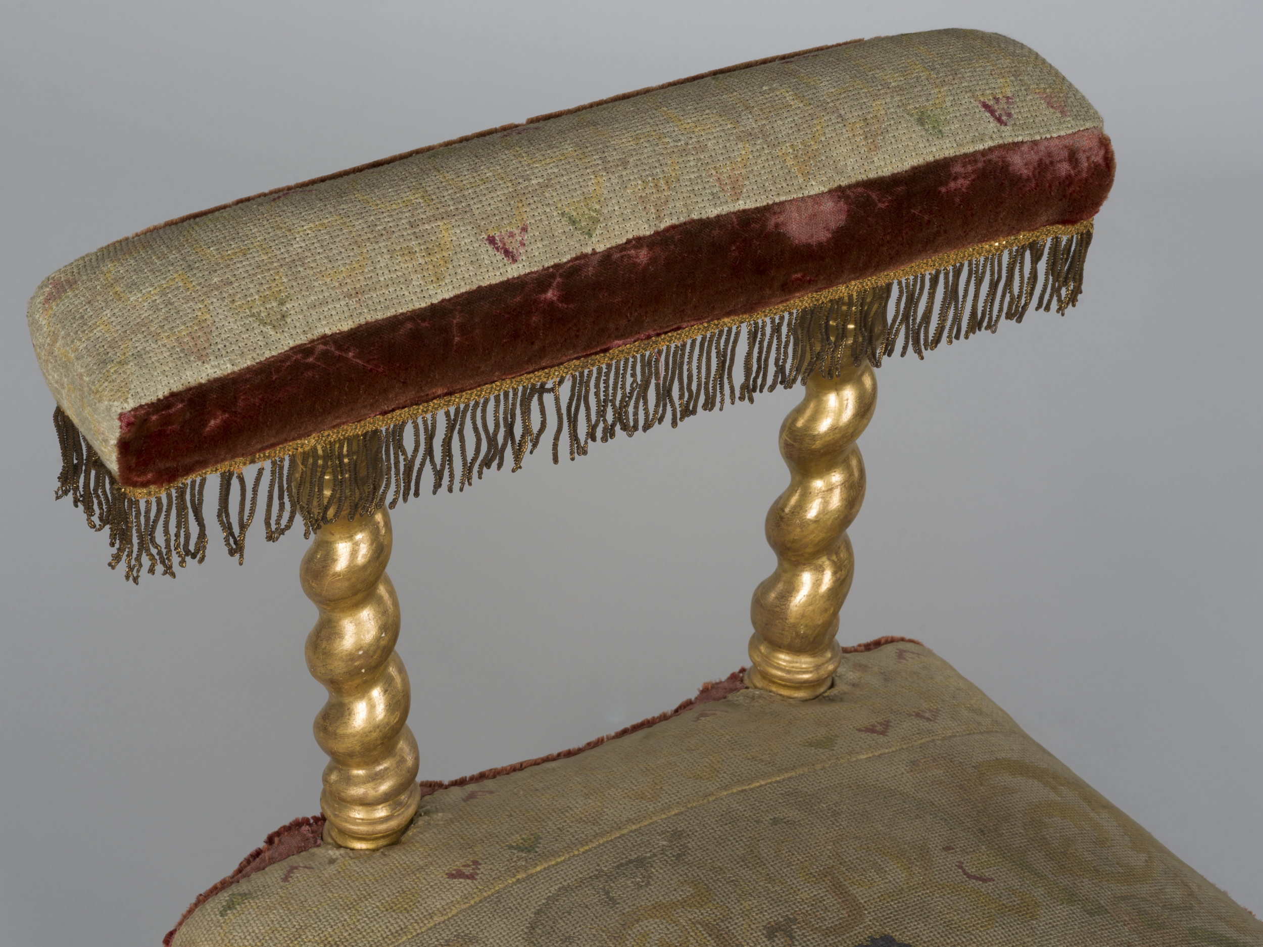 Niskie krzesełko z siedziskiem w kształcie trapezu z wysoką poduszką, wsparte jest na czterech spiralnie toczonych nóżkach. Do krótszego boku siedziska przymocowane są dwie toczone spiralnie podpórki połączone poziomą deseczką stanowiącą podparcie wyposażone w tapicerowaną poduszkę. Części drewniane konstrukcji są złocone i polerowane. Siedzisko i podparcie pokryte jest tkaniną kanwową z szczątkowo zachowanym haftem krzyżykowym obszytym dookoła brązowym aksamitem i frędzlami. Haft na siedzisku przedstawia tarczę herbową Potockich Pilawa pod dziewięciopałkową koroną, w otoczeniu labrów.