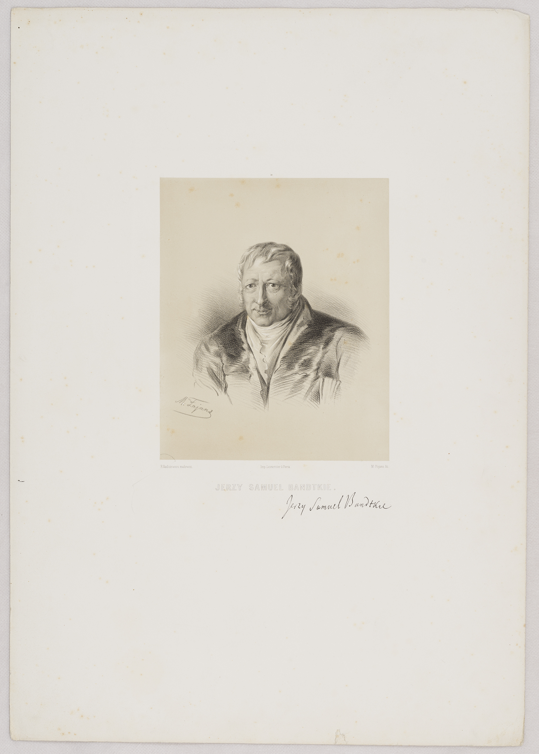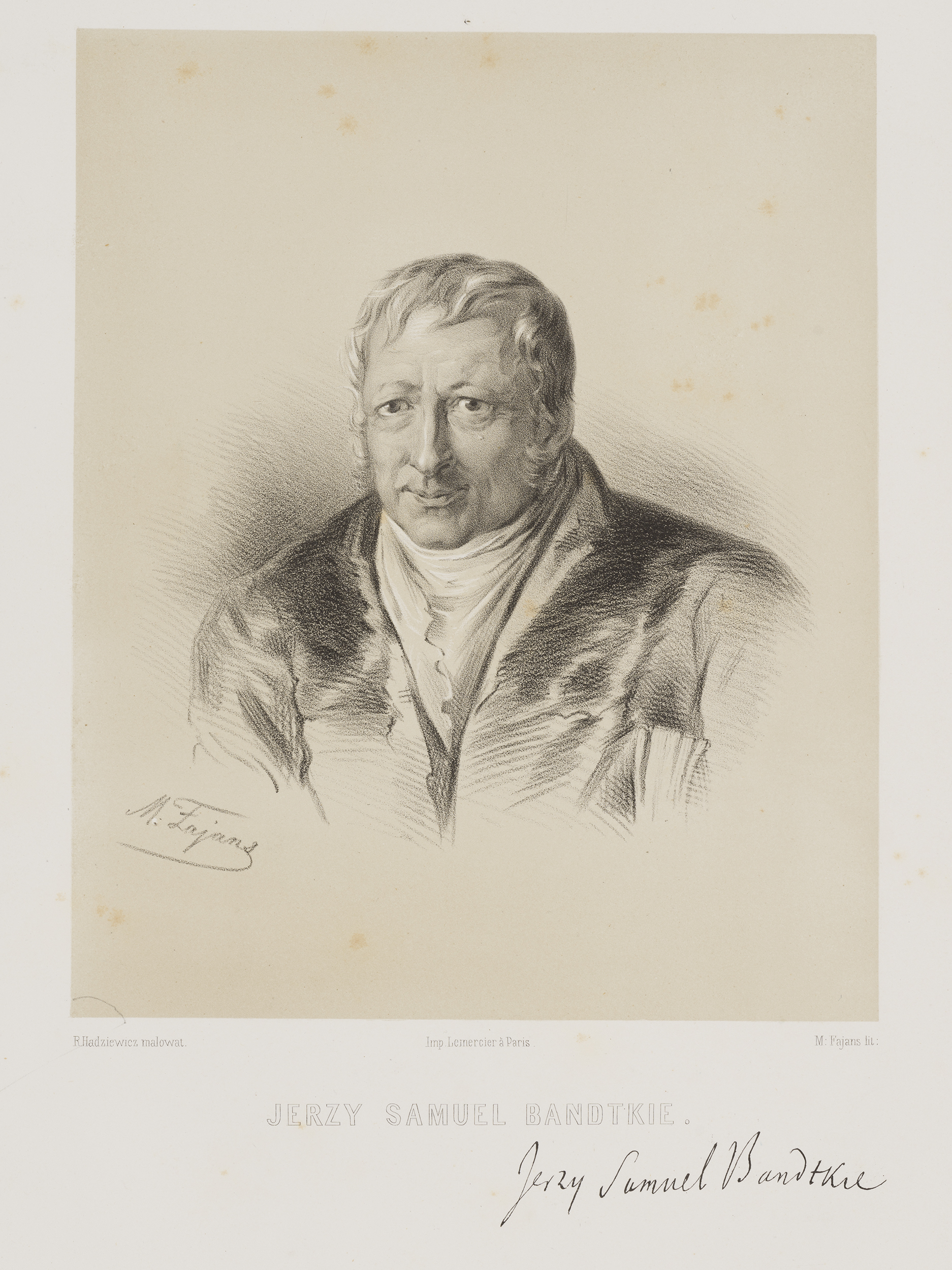 Jerzy Samuel Bandtkie to postać szczególna w zbiorze Fajansa w świetle badań z kręgu Wilanowa i jego dawnych mieszkańców. Filolog, księgoznawca, wieloletni dyrektor biblioteki Uniwersytetu Jagiellońskiego, której zbiory wzbogacił, uporządkował i usystematyzował, przyczynił się do upowszechnienia wyjątkowej pamiątki rękopiśmiennej – listów Jana Sobieskiego, hetmana, marszałka a potem króla pisanych do Marii Kazimiery, popularnie zwanych listami do Marysieńki. Trudno wyobrazić sobie badania nad Janem III, stroną obyczajową jego czasów, ale także nad polityką i historią jego dokonań militarnych bez tego niezwykle zasobnego w informacje źródła, które przez wiele lat uważano za zaginione. Inaczej niż w wielu pozostałych odbitkach z serii „Wizerunków”, rysunek wykonany przez Fajansa nie powstał „z natury”, ponieważ Bandtkie wówczas już nie żył. Podstawą dla litografii był obraz autorstwa Rafała Hadziewicza, malarza związanego z Krakowem oraz Warszawą, profesora w Szkole Sztuk Pięknych (niestety, nie udało się ustalić, czy oryginał się zachował). Pod portretem starszego, życzliwie uśmiechniętego starszego mężczyzny znalazł się podpis, który go identyfikuje, jak również faksymile jego autografu oraz informacja o autorstwie (mal. Hadziewicz, lit. Fajans) jak i samym druku (warsztat Rosé-Josepha Lemerciera w Paryżu).