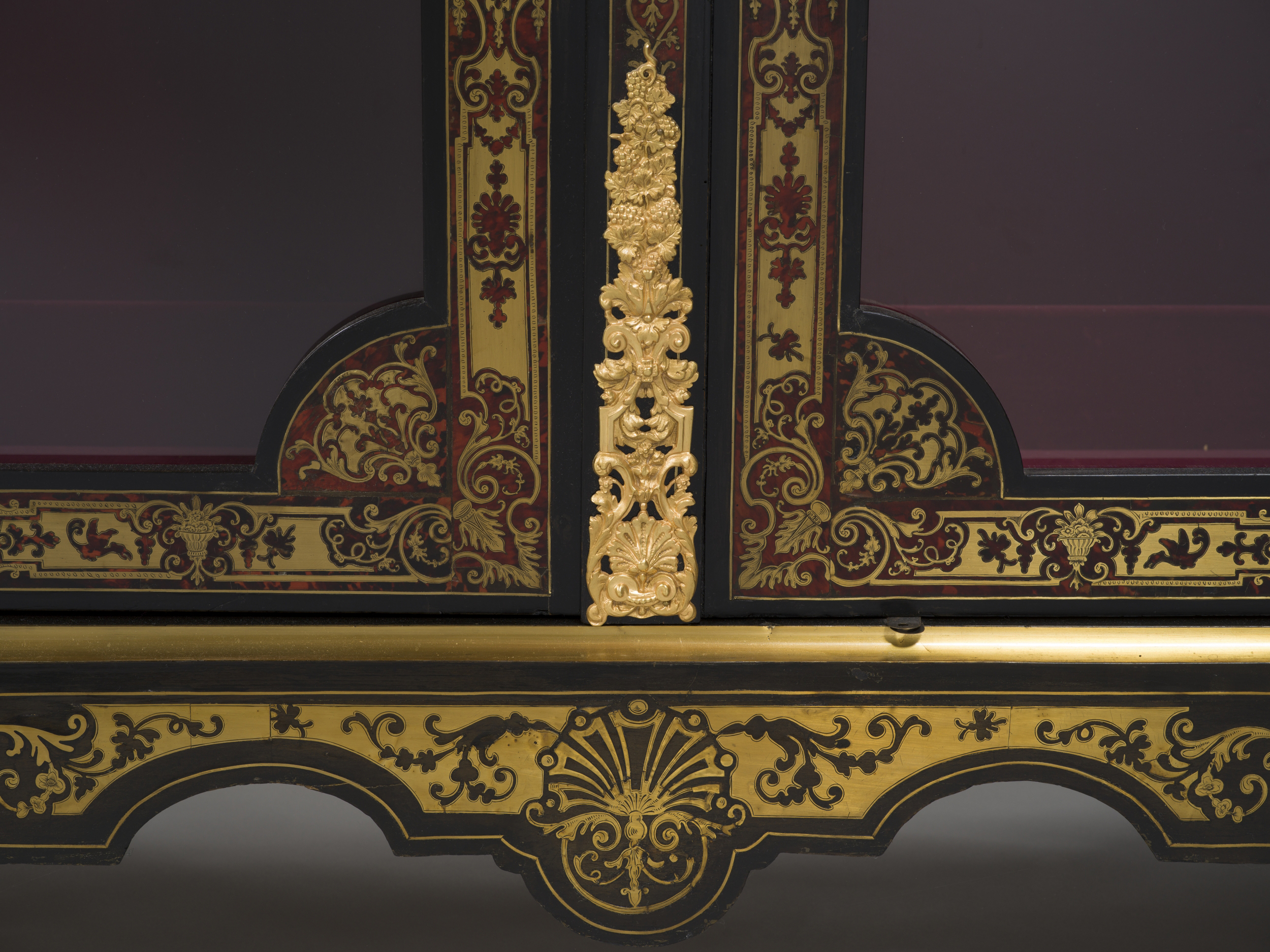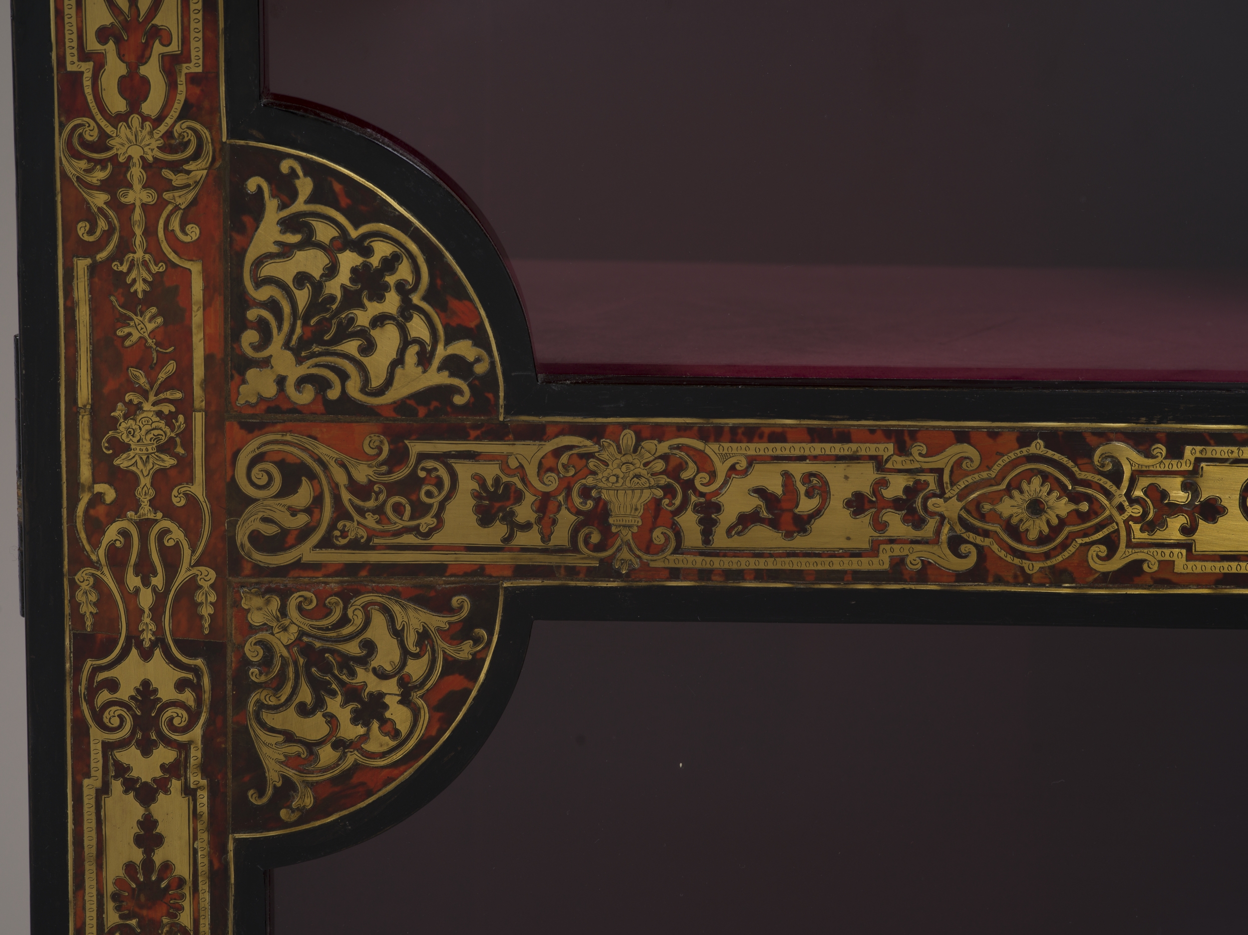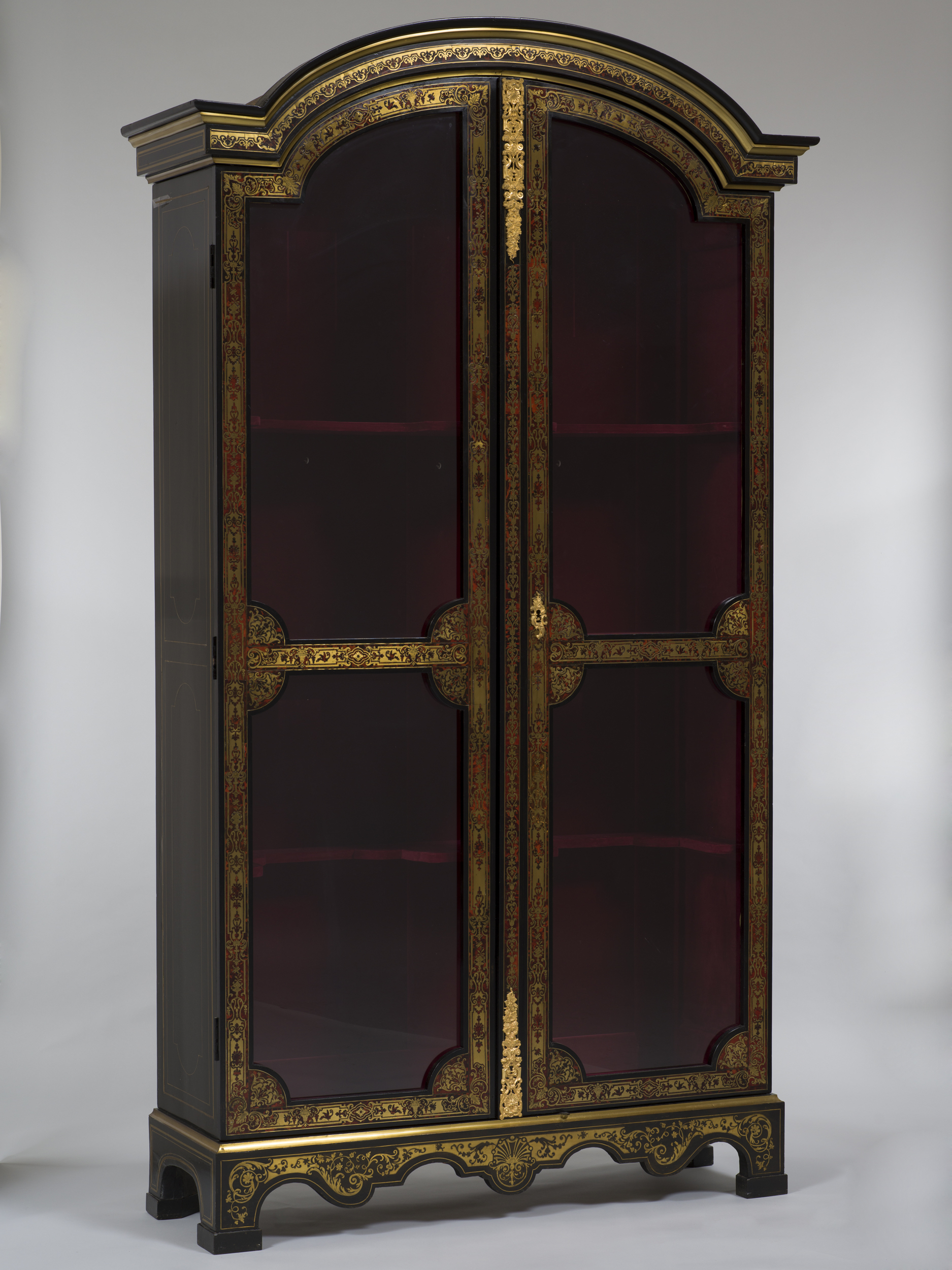 Jedna z pary (Wil.3093, Wil.3094) szczególnie cennych bibliotecznych szaf witrynowych z epoki Ludwika XIV przypisanych ebeniście paryskiemu Nicolas Sageot. Obok najwyższej klasy mistrza markieterii André-Charlesa Boulle’a dzieła Sageot cieszyły się najwyższym uznaniem dworskiej klienteli. Prostopadłościenna forma mebla z wystającym gzymsem wieńczącym w kształcie łuku, ustawiona na niskim cokole przechodzącym w cztery nogi zachwyca prostotą i proporcjami. Dwuskrzydłowe drzwi są w całości przeszklone czterema taflami przedzielonymi listewkami. Główny walor mebla stanowi inkrustowana dekoracja w zestawieniu czerni hebanu, brunatnej czerwieni szylkretu i złoconego mosiądzu pokrywająca powierzchnie fasadowe. Ramy dwuskrzydłowych witrynowych drzwi zdobi bordiura rytmicznie powtarzającej się sekwencji motywów arabeskowych misternie wyciętych z mosiężnej blachy i szylkretu, inspirowanych wzorcami Jeana Béraina (1640-1711). Technologia markieterii polegająca na równoczesnym wycinaniu rysunku ornametu ze złożonych warstwowo arkuszy, w tym wypadku szylkretu i mosiądzu, pozwala na pełne wykorzystanie użytego materiału przy wyrobie pary bliźniaczych szaf, w których w jednej z nich tłem jest brunatno-czerwony szylkret ze złotym ornamentem (premier partie), w drugiej złocony metal jest tłem dla brunatno-czerwony szylkretowego ornamentu (contre partie). Ozdobne okucia listwy drzwiowej to pozostałości nie zachowanej dekoracji plakietami z mosiądzu złoconego. Omawiana szafa reprezentuje wilanowską kolekcję wyjątkowej jakości mebli markietowanych, które stanowią chlubę najbardziej prestiżowych kolekcji. W muzeum Potockich były miejscem ekspozycji pamiątek narodowych w apartamentach królewskich.
