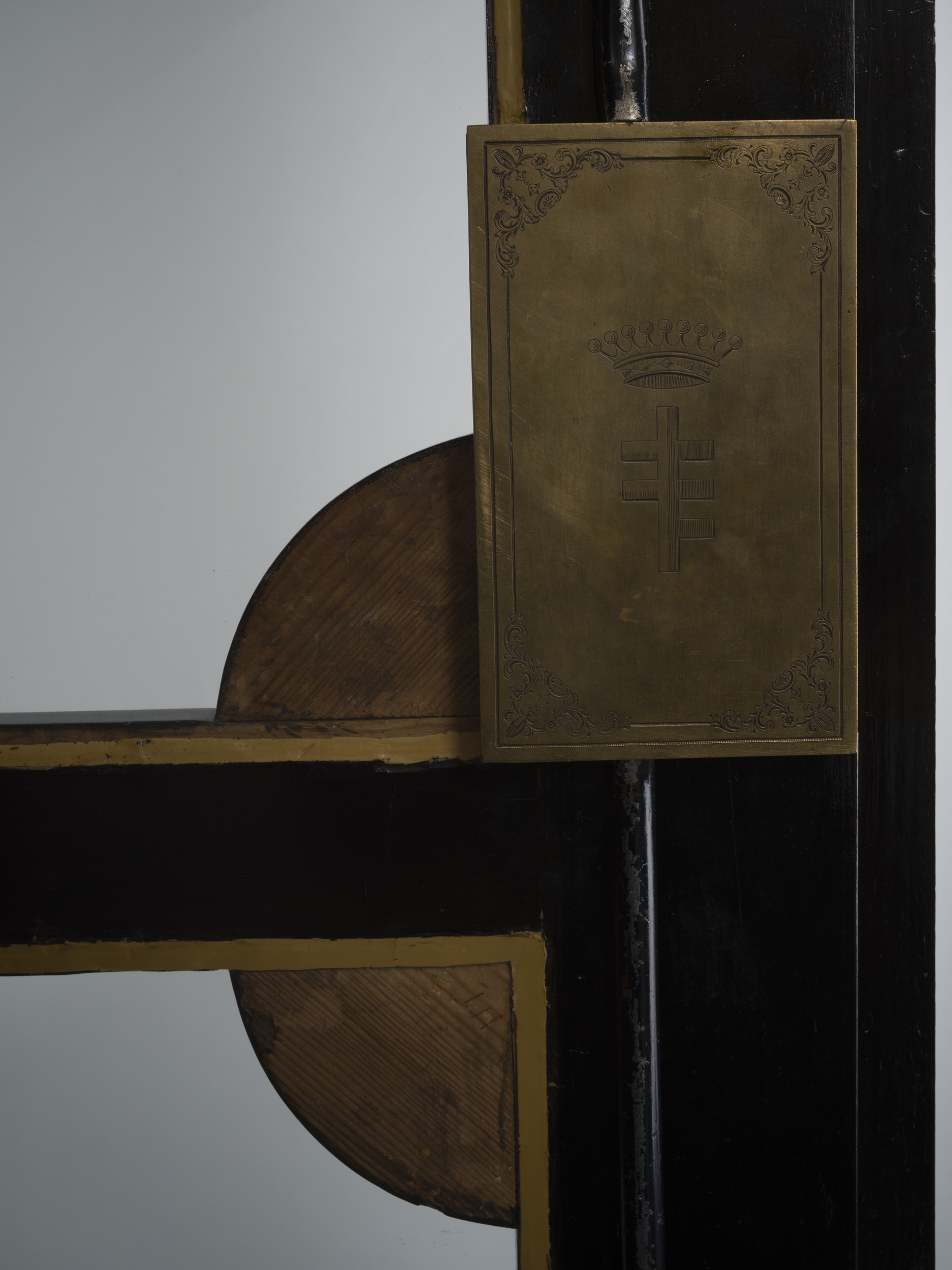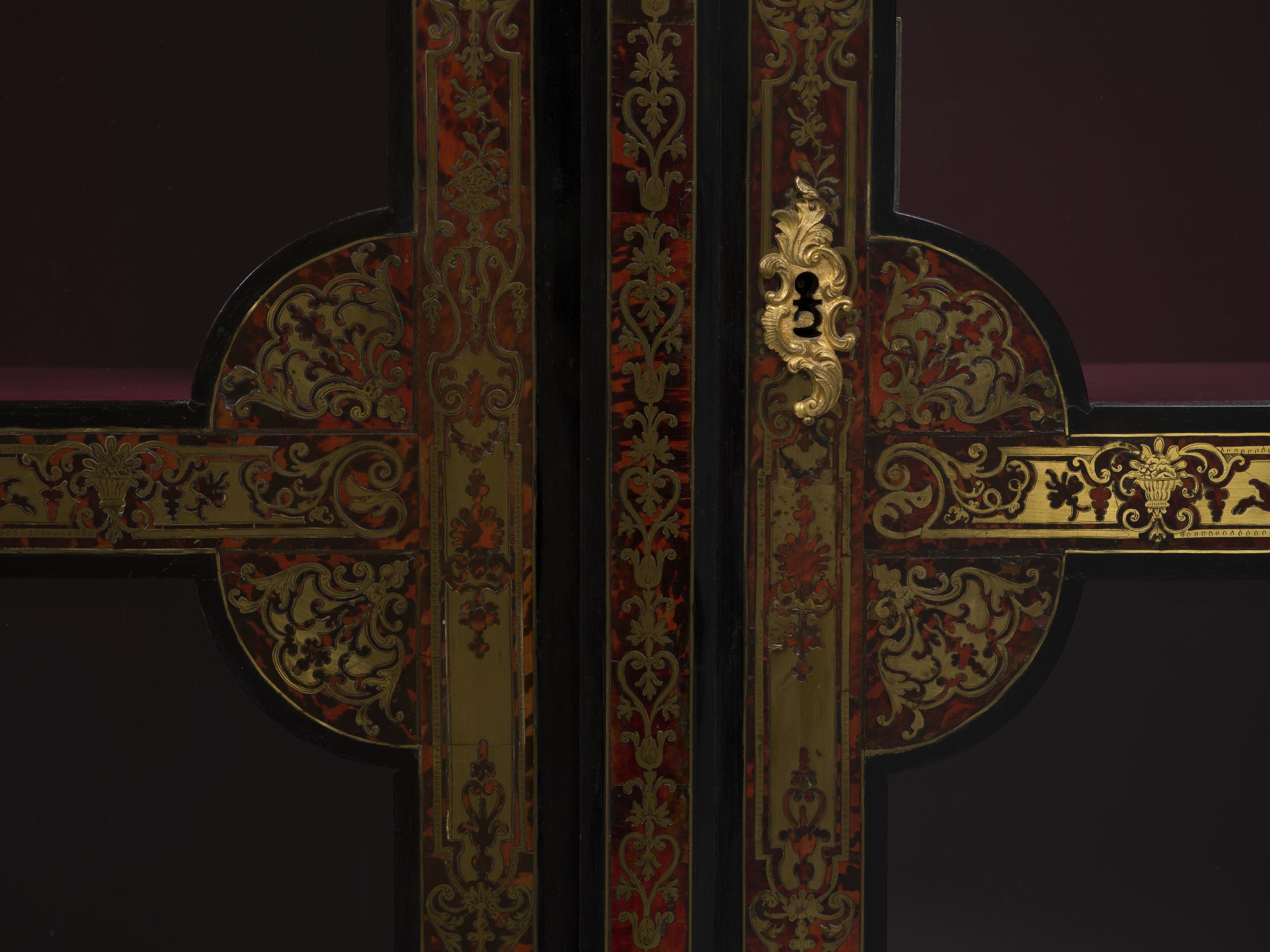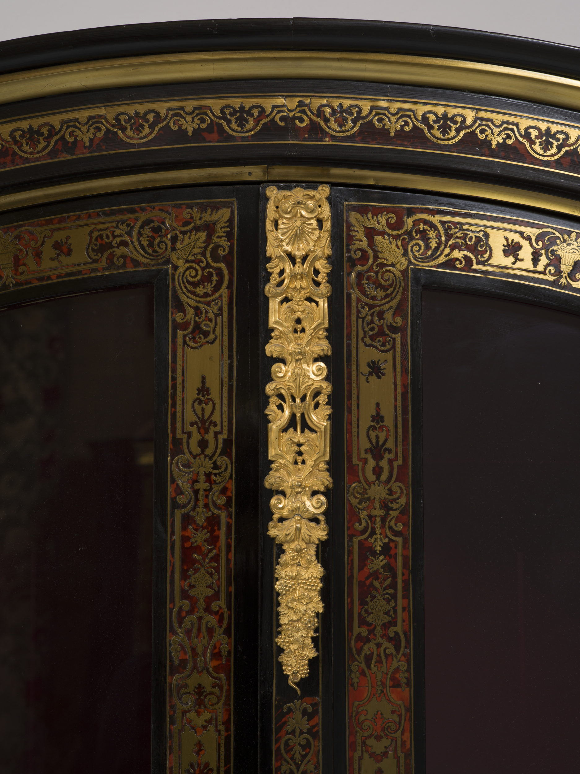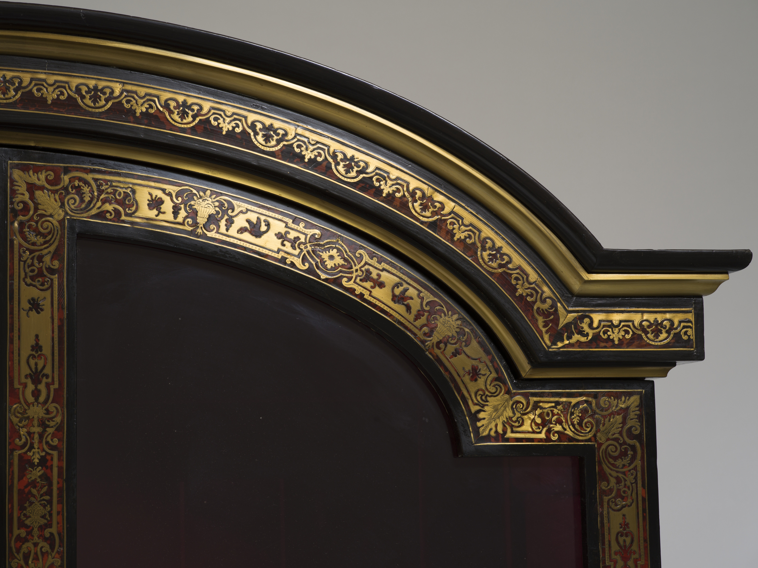 Jedna z pary (Wil.3093, Wil.3094) szczególnie cennych bibliotecznych szaf witrynowych z epoki Ludwika XIV przypisanych ebeniście paryskiemu Nicolas Sageot. Obok najwyższej klasy mistrza markieterii André-Charlesa Boulle’a dzieła Sageot cieszyły się najwyższym uznaniem dworskiej klienteli. Prostopadłościenna forma mebla z wystającym gzymsem wieńczącym w kształcie łuku, ustawiona na niskim cokole przechodzącym w cztery nogi zachwyca prostotą i proporcjami. Dwuskrzydłowe drzwi są w całości przeszklone czterema taflami przedzielonymi listewkami. Główny walor mebla stanowi inkrustowana dekoracja w zestawieniu czerni hebanu, brunatnej czerwieni szylkretu i złoconego mosiądzu pokrywająca powierzchnie fasadowe. Ramy dwuskrzydłowych witrynowych drzwi zdobi bordiura rytmicznie powtarzającej się sekwencji motywów arabeskowych misternie wyciętych z mosiężnej blachy i szylkretu, inspirowanych wzorcami Jeana Béraina (1640-1711). Technologia markieterii polegająca na równoczesnym wycinaniu rysunku ornametu ze złożonych warstwowo arkuszy, w tym wypadku szylkretu i mosiądzu, pozwala na pełne wykorzystanie użytego materiału przy wyrobie pary bliźniaczych szaf, w których w jednej z nich tłem jest brunatno-czerwony szylkret ze złotym ornamentem (premier partie), w drugiej złocony metal jest tłem dla brunatno-czerwony szylkretowego ornamentu (contre partie). Ozdobne okucia listwy drzwiowej to pozostałości nie zachowanej dekoracji plakietami z mosiądzu złoconego. Omawiana szafa reprezentuje wilanowską kolekcję wyjątkowej jakości mebli markietowanych, które stanowią chlubę najbardziej prestiżowych kolekcji. W muzeum Potockich były miejscem ekspozycji pamiątek narodowych w apartamentach królewskich.