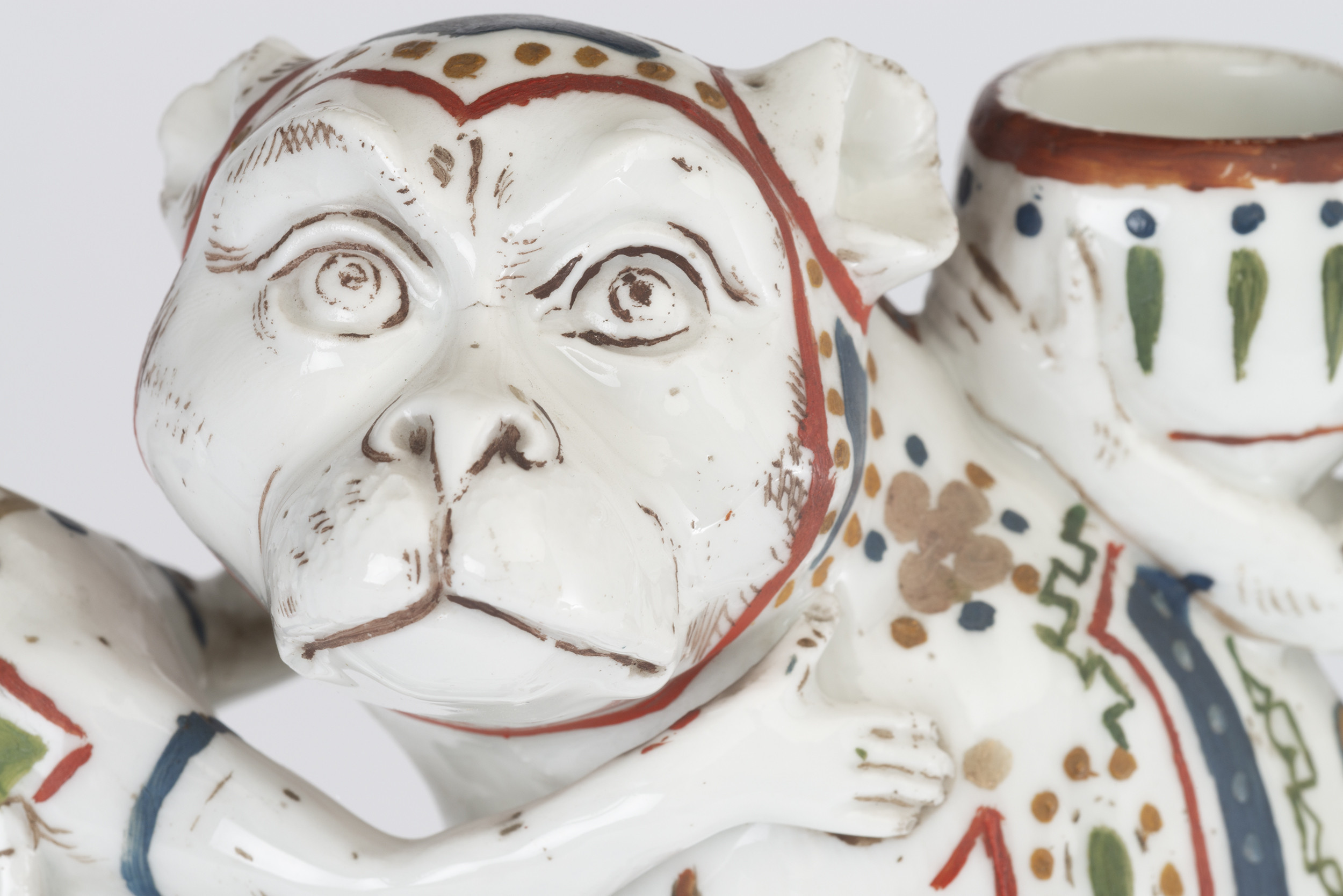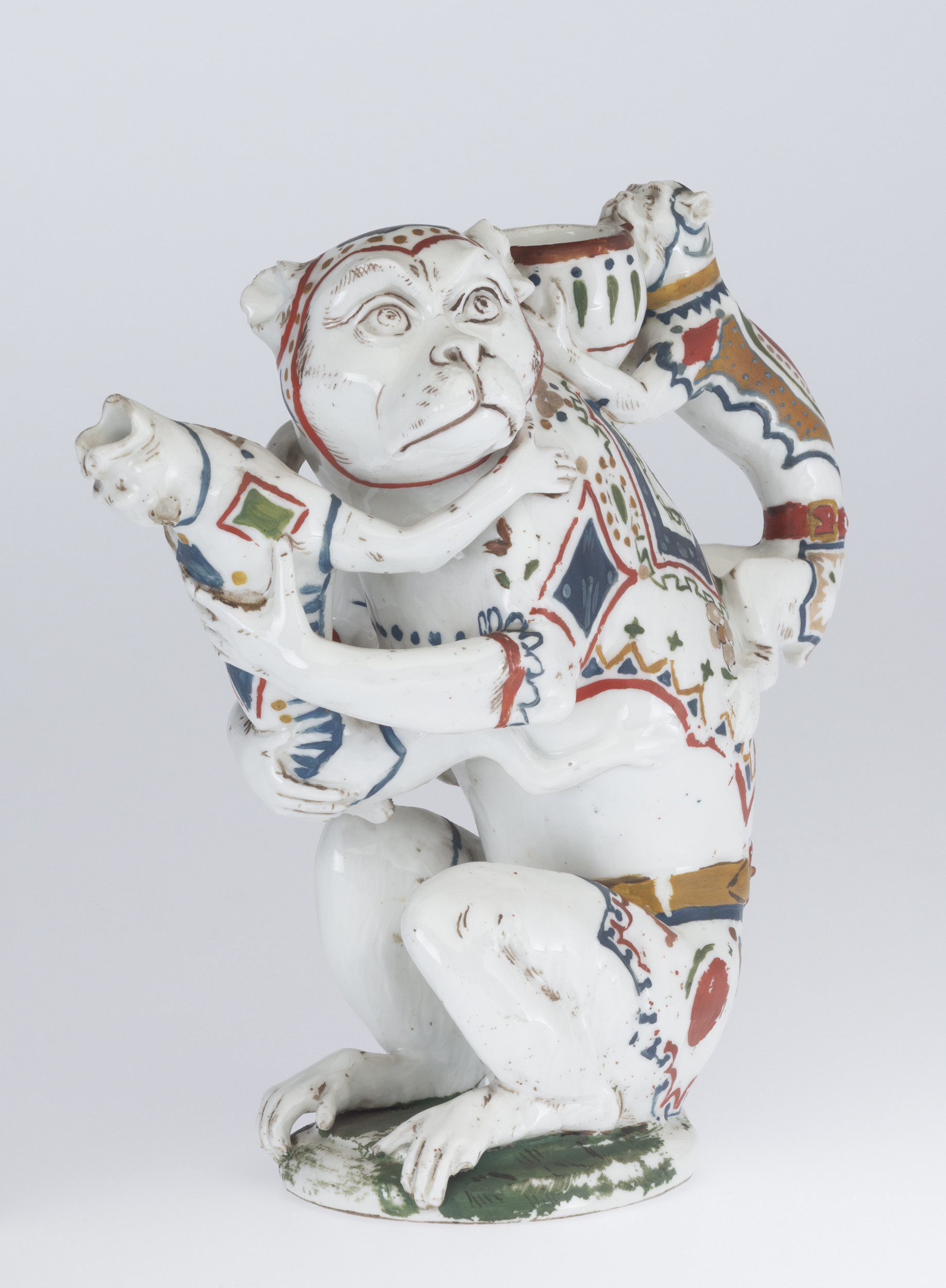 Dzbanek w kształcie siedzącej małpy z dwójką młodych, jednym na jej plecach, a drugim trzymanym w łapkach z przodu. Małpiątka tworzą ucho i dziobek dzbanka. Autorem tego fantazyjnego modelu jest Johann Joachim Kaendler (1706-1775) – jeden z najsłynniejszych modelerów w miśnieńskiej wytwórni porcelany. Artysta prowadził dokładny dziennik dotyczący swojej pracy – w lipcu 1735 roku pojawia się w nim zapis: Imbryk w formie małpy, która trzyma jedno młode na plecach, i jedno przed sobą w rękach, zmienionej i doprowadzonej do należytego kształtu, siedzącej na małej podstawie, do której jest zamocowana łańcuchem i założonym zamkiem. Dzięki tej notatce dokładnie wiemy kiedy powstał ten wyjątkowy model. Jednak naczynia w kształcie zwierząt pojawiały się na europejskich stołach dużo wcześniej. Już od średniowiecza miały za zadanie przede wszystkim wzbudzać podziw i zaskakiwać biesiadników. Wzorem dla porcelanowego naczynia mogła być niemalże identyczna w formie małpka-dzbanek wykonana ze srebra złoconego około 1600 roku w Augsburgu.