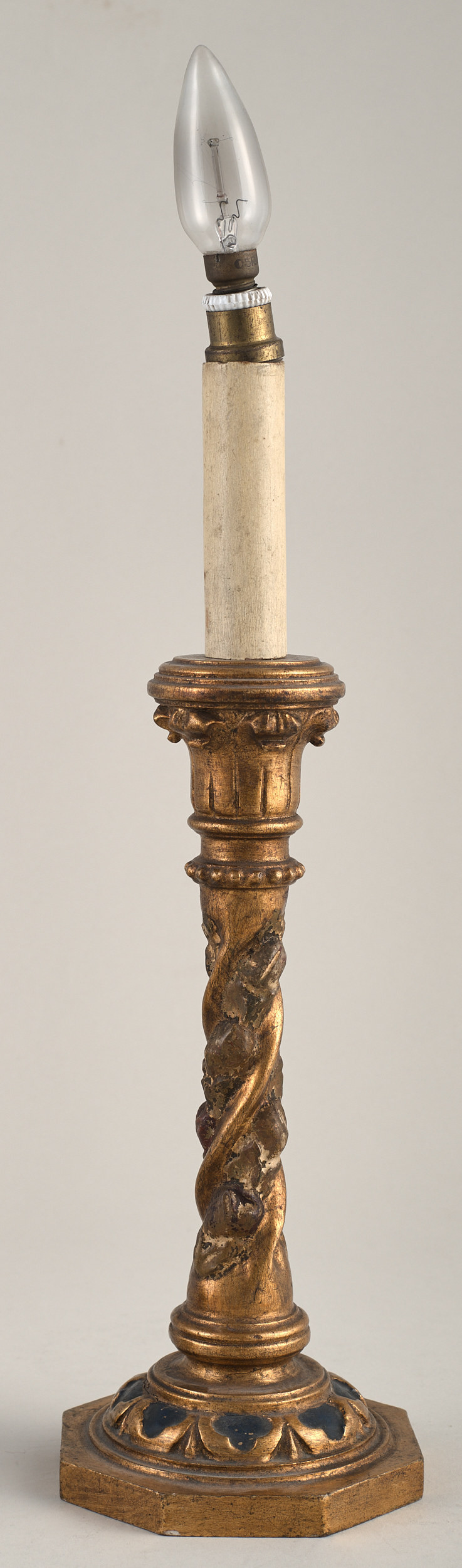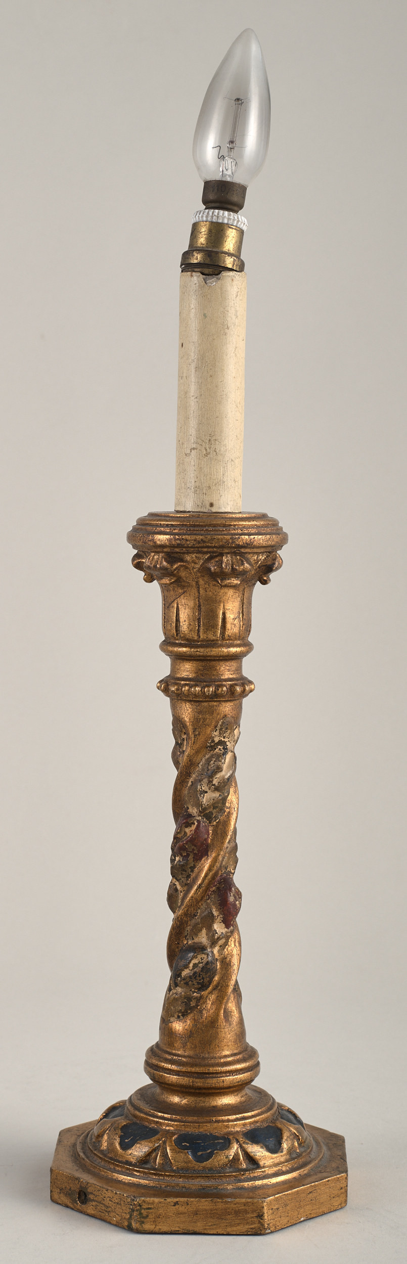 Świecznik stojący jednoświecowy, zelektryfikowany z początku XX wieku, jeden z dwóch dekorujących kominek w Gabinecie Ordynata na parterze zamku. W żarówkach światło jest emitowane przez rozgrzany żarnik wolframowy. Mimo obecnie szerokiego stosowania żarówek, nie są one tak wydajnym źródłem światła jak by się mogło wydać, ponieważ tylko koło 5% powstałej energii (wynik przepływu prądu przez żarnik) zamienione jest w światło a aż 95% jest emitowane przez żarnik w postaci ciepła. Omawiany świecznik wykonany jest z drewna rzeźbionego, malowanego i złoconego. Stopa okrągła zdobiona stylizowanymi liśćmi, wsparta jest na ośmiobocznej podstawie i przechodzi w trzon spiralnie żebrowany z dekoracją z kwiatów i liści. Trzon górą zakończony nasadką, zdobioną liśćmi akantu, na której spoczywa okrągła profilowana profitka, zakończona tulejką z białego szkła mieszczącą żarówkę. Ornament kwiatowo – liściasty zdobiący trzon świecznika jest malowany w kolorach czerwonym i ciemno zielonym, Całość świecznika jest wykonana z jednego kawałka drewna złoconego.