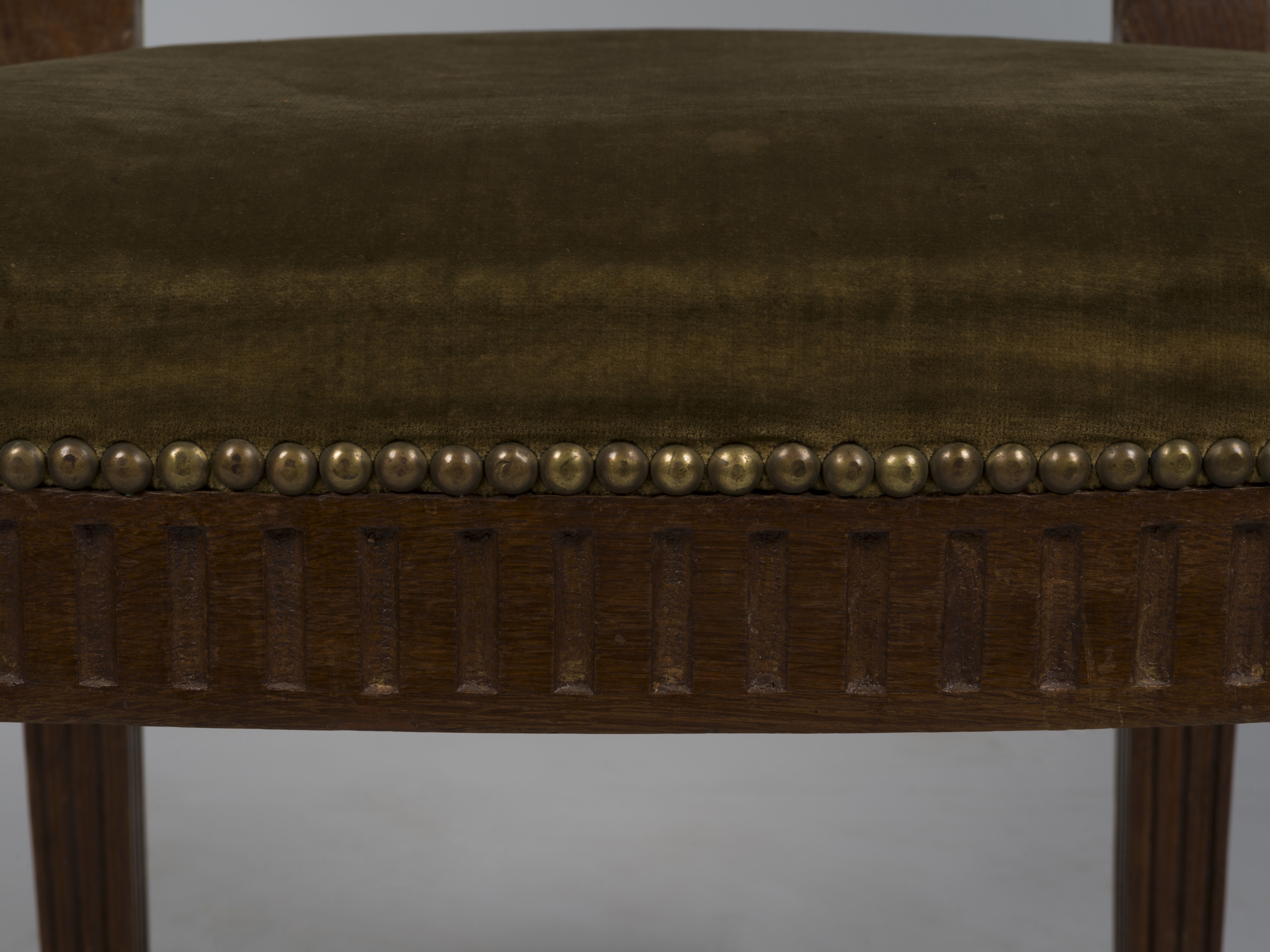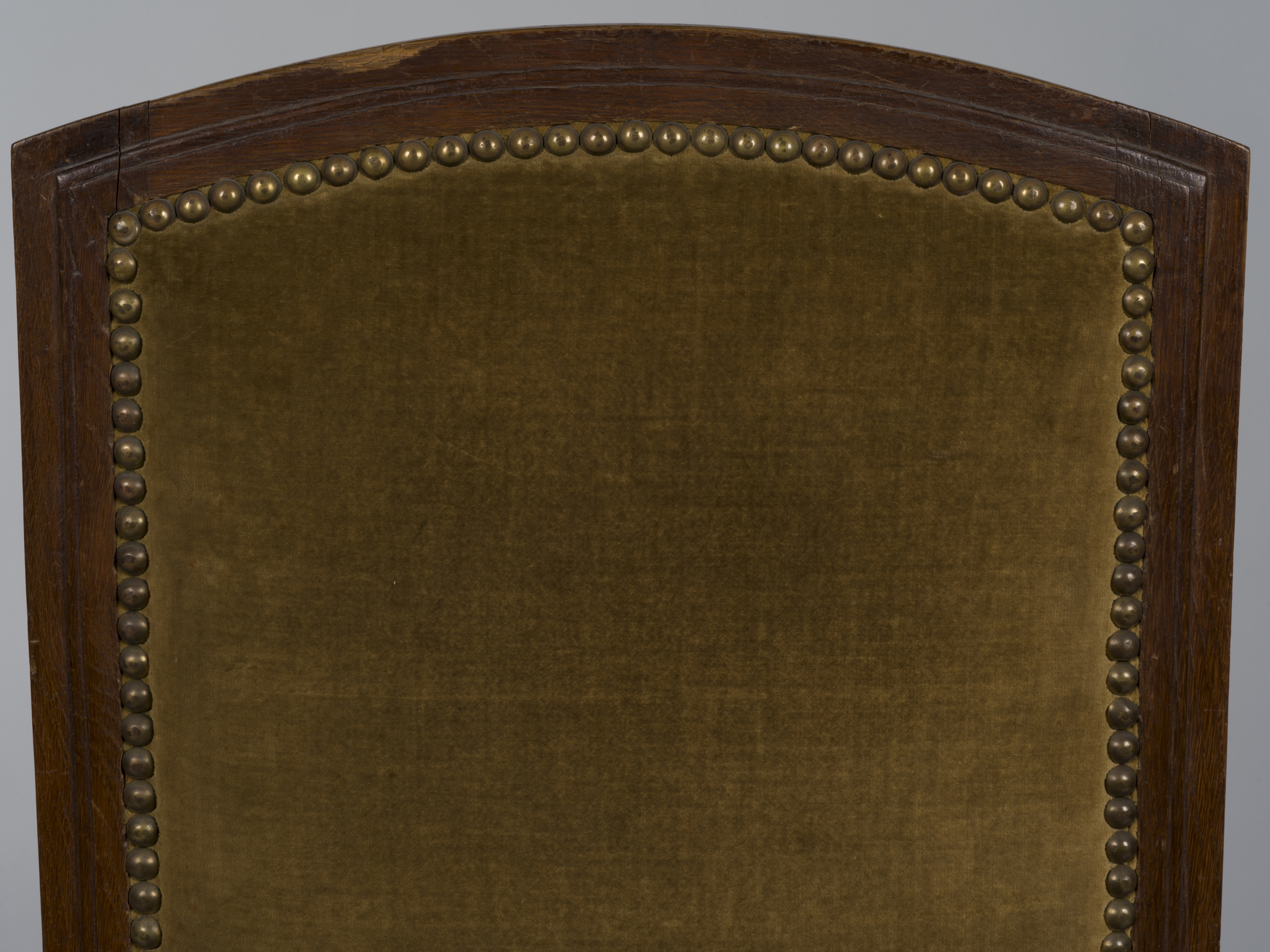 Krzesło o siedzisku trapezoidalnym, na czterech nogach o przekroju kwadratowym, lekko zbieżnych, zdobionych kanelowaniem, u dołu opatrzonych prostymi przewiązkami, a na wysokości cargi – kostkami dekorowanymi pośrodku ścianek pojedynczymi cekinami. Tylne nogi poprzez wysokie gładkie kostki przechodzą w ramiaki boczne oparcia, lekko odchylonego do tyłu. Oparcie w kształcie prostokąta zamkniętego od góry spłaszczonym łukiem, o prostych, stosunkowo szerokich ramiakach, zdobionych pojedynczym płytkim żłobieniem biegnącym wzdłuż przez środek. Poniżej płyciny oparcia znajduje się wąski prześwit ponad siedziskiem. Oskrzynienie jest proste, zdobione kanelowaniem. Siedzisko i płycina oparcia są tapicerowane, obite zgniłozielonym aksamitem tłoczonym we wzory roślinne.