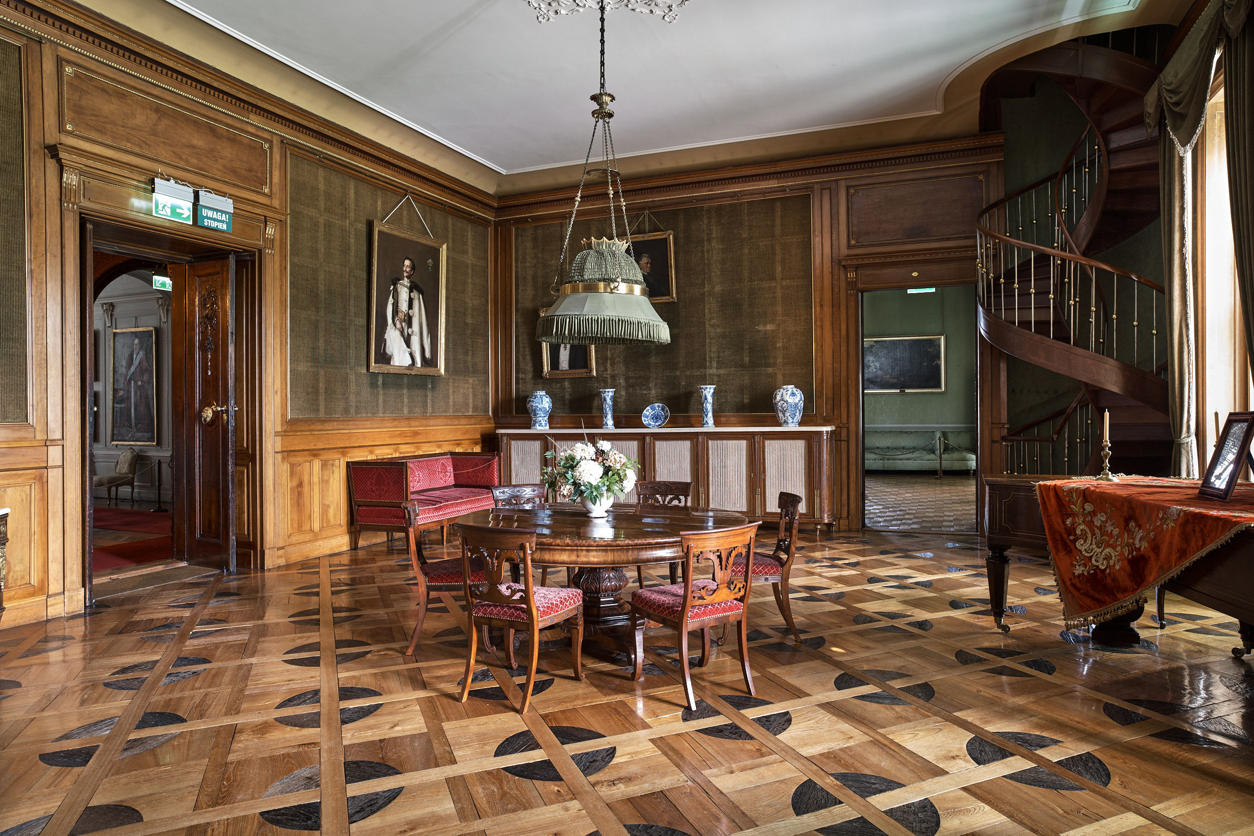 Z opisu pomieszczenia wynika, że w 1854 r. „W tym salonie, sufit i ściany malowane, posadzka dębowa w tafle ułożona. Piec ogrzewalny, w kształcie Lutni, murowany. […] prócz tego, znajduje się w tym Salonie, przepierzenie z desek politurowanych, ozdobionych malowidłem pod politurą, na którym galeryjka umieszczona; schody drewniane w ślimak kręcone, z poręczami po obu bokach […], prowadzącemi na wyższe piętro.” Były tu także drzwi „mahoniem fornirowane, podwójne […] ozdobione malowidłem, pod politurą”. Przejście do korytarza zamykało dwoje drzwi – jednoskrzydłowe „do pół szklone” i pełne dwuskrzydłowe. Z lat 30 XIX w. pochodzi istniejąca do dziś posadzka projektu Karola Chodzińskiego, wykonana z dwóch gatunków dębu przez stolarza Jana Ciążyńskiego.