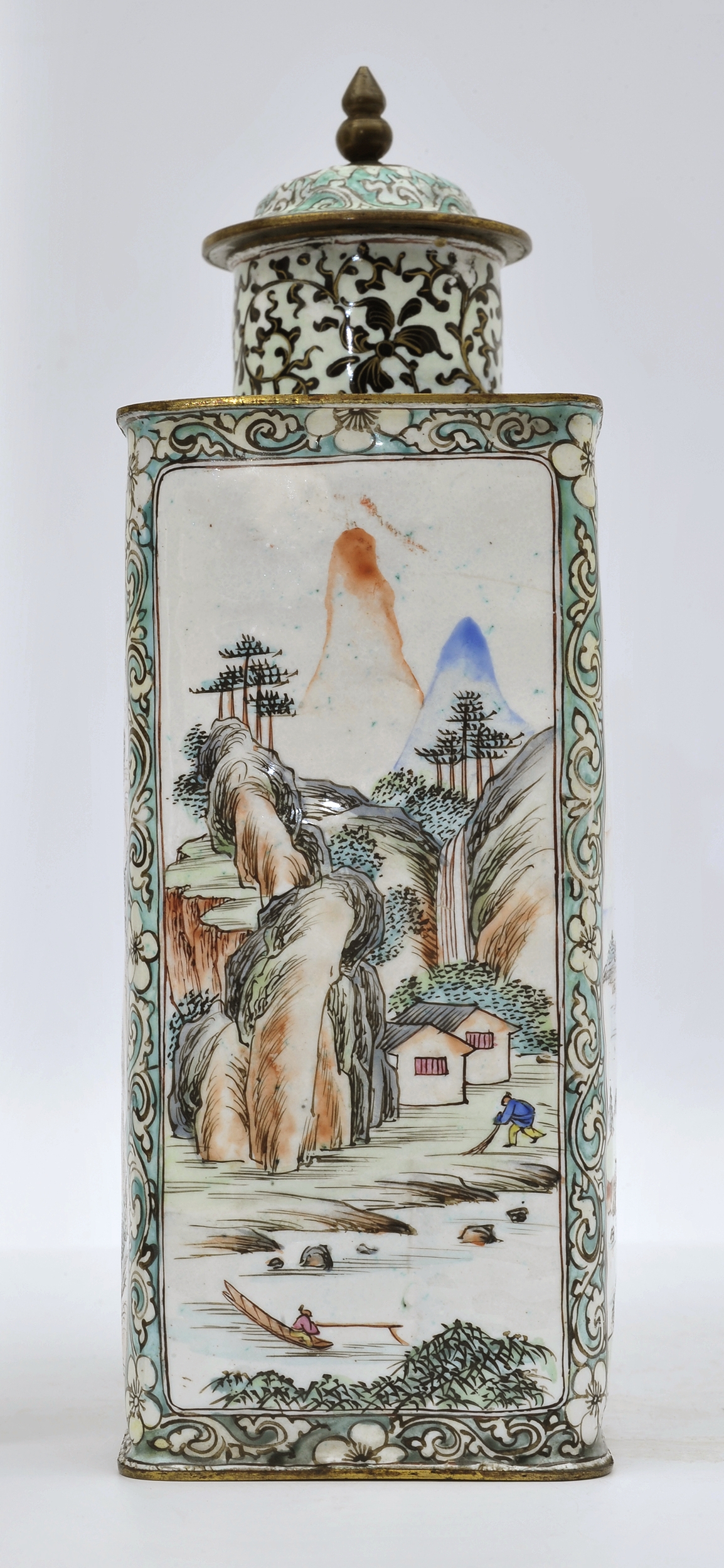 Miedziane czworoboczne naczynie z cylindryczną, wysklepioną pokrywą zwieńczoną dwudzielną gałeczką. Brzusiec naczynia zdobią cztery rozległe rezerwy, czyli pola wyodrębnione krawędzią, wypełnione dekoracją. Wszystkie rezerwy prezentują sceny przedstawiające typowe chińskie krajobrazy – z wysokimi górami, z drzewami, skałami, z akwenami wodnymi, z elementami architektury, i majaczącymi drobnymi postaciami ludzkimi. Pozostała powierzchnia została pokryta gęstymi, mocno stylizowanymi wiciami roślinnymi. Cylindryczna pokrywka została ozdobiona ornamentem nawiązującymi do bordiur obiegających rezerwy.