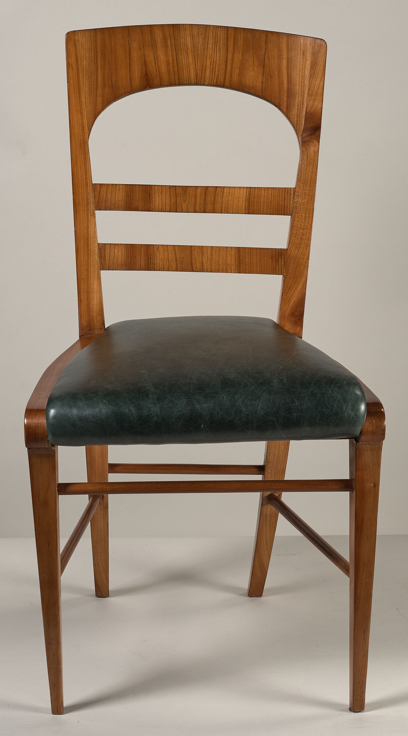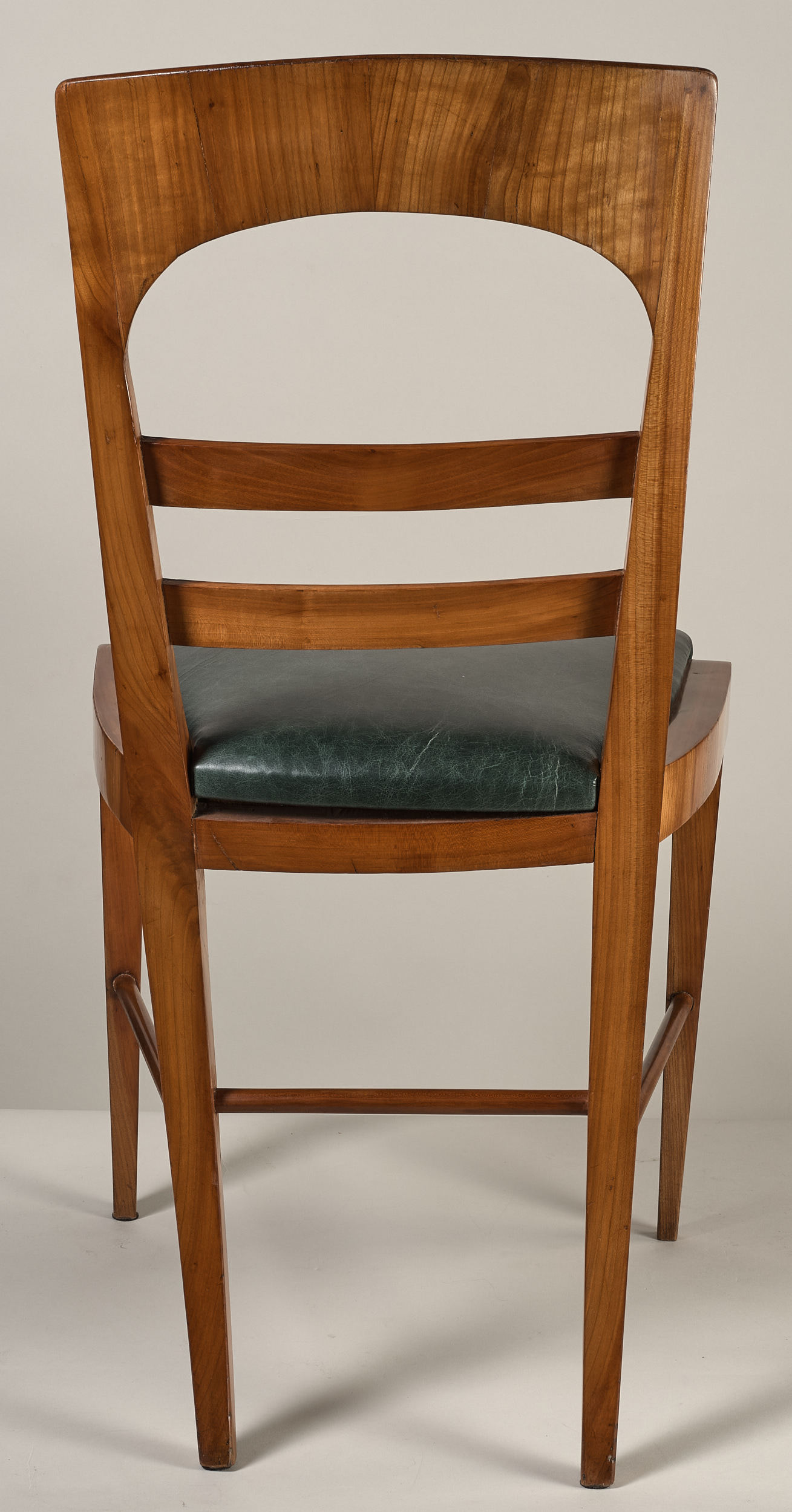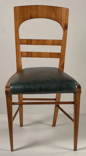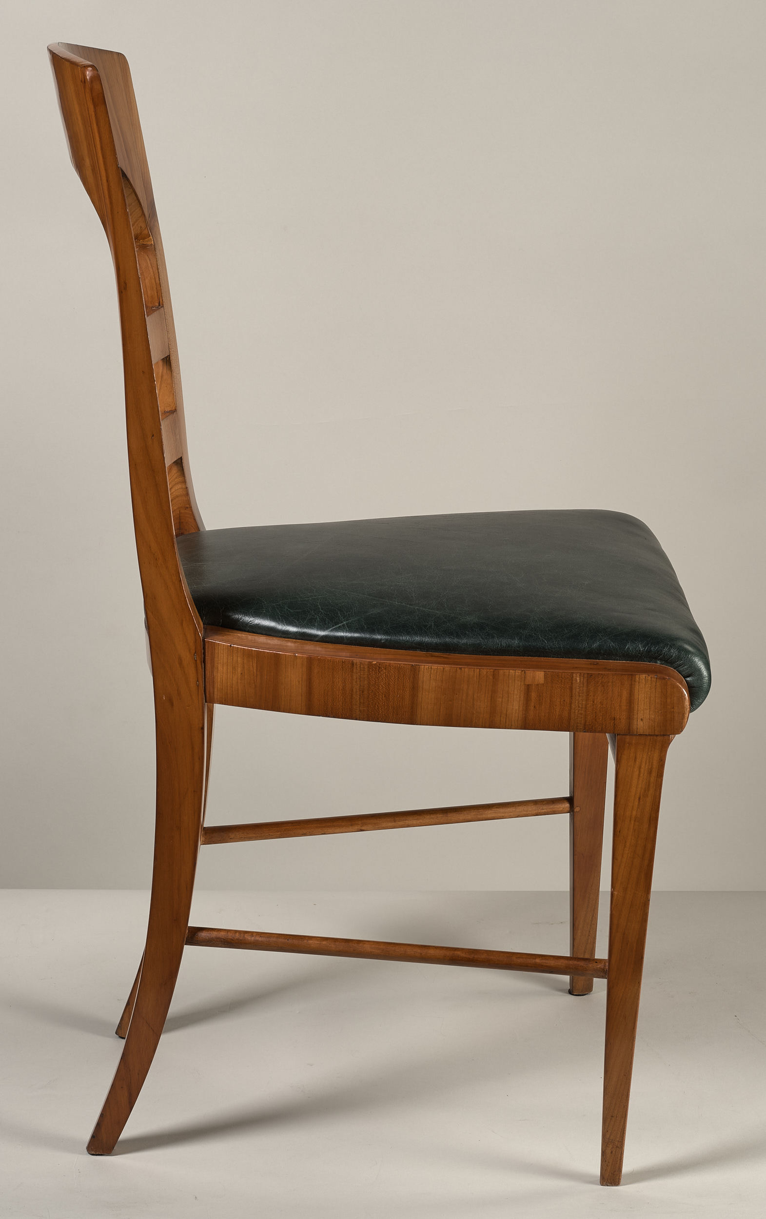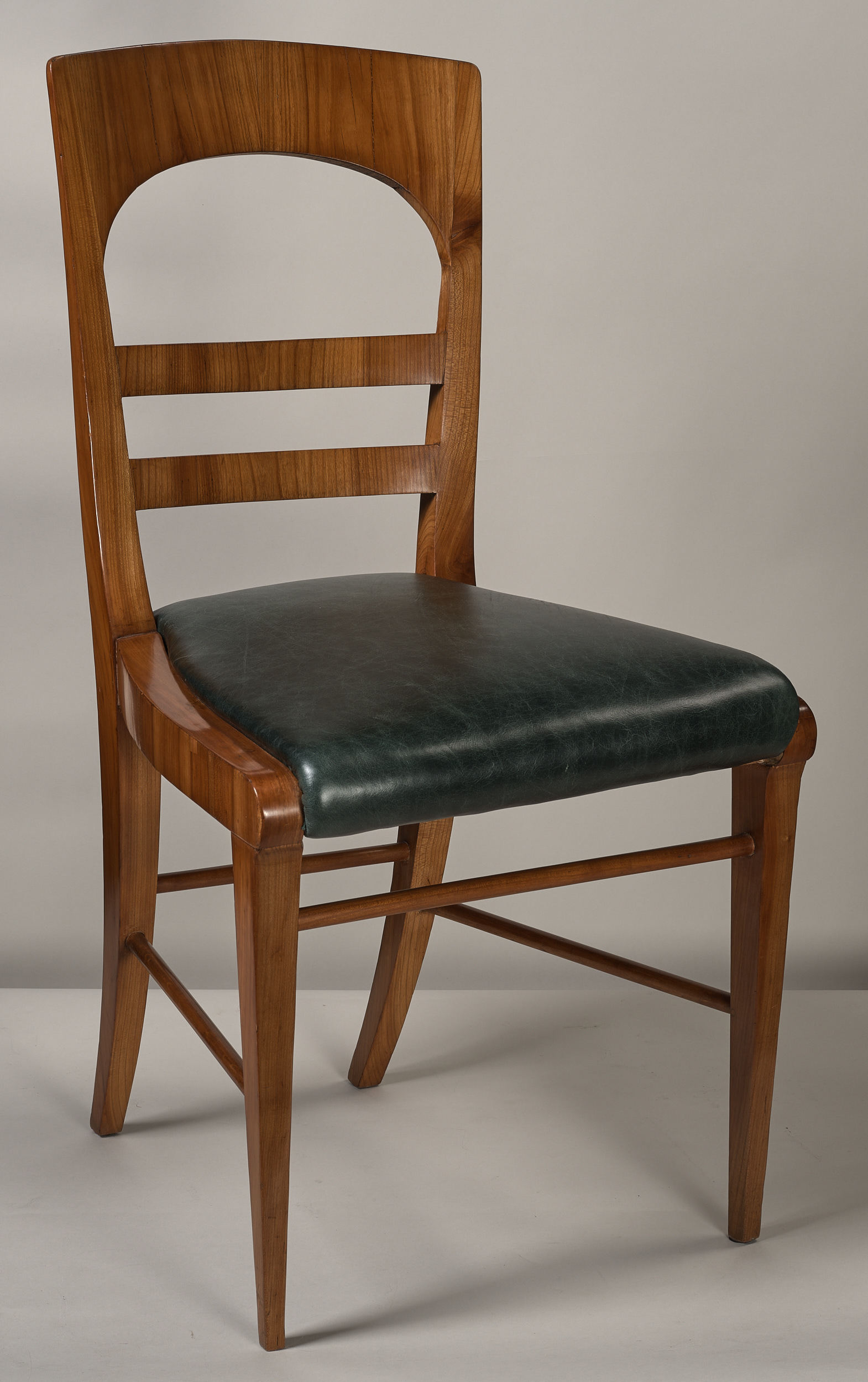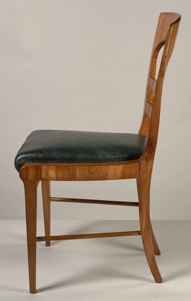 Prezentowany mebel pochodzi z kompletu krzeseł należących do dawnego wyposażenia wnętrz łańcuckiego zamku (S.7882MŁ; S.7883MŁ; S.7884MŁ; S.7888MŁ). Krzesło zakupiono zapewne pod koniec XIX w. w czasach Elżbiety i Romana Potockich, gdy urządzano odnowione i zmodernizowane wnętrza. Prostota kształtu mebla, czytelna konstrukcja oraz estetyka starannie dobranych słojów jasnego czereśniowego forniru wskazują na korelacje do mebli w stylu biedermeier. Takim terminem zaczęto w 90 latach XIX w. nazywać modę rozwijającą się w wyposażeniu wnętrz na terenie Austrii, Niemiec i na obszarach wpływów kultury niemieckiej w okresie od Kongresu Wiedeńskiego 1815 r. do wydarzeń Wiosny Ludów 1848 r. Określenie „Biedermeier” zapożyczono z satyrycznej postaci zacnego, solidnego, ale ograniczonego mieszczanina. Styl biedermeier pojawił się jako odpowiedz na wyróżniający się monumentalnością klasycyzm i francuski empire. Biedermeier cechował się praktycznością i prostotą. Rezygnując z nadinterpretacji sztuki antyku, nadmiaru ozdób czy odlewów z brązu złoconego w meblarstwie postawiono na solidną konstrukcję. Na dużą skalę zaczęto stosować rodzime gatunki drewna, jak orzech, klon, brzoza, jesion, a także drzew owocowych. W okleinach eksponowano słoje drewna traktując naturalne jego walory jako element zdobniczy. Meble przeznaczone do wnętrz mieszkalnych nie odznaczały się reprezentacyjnością, służyły wygodzie życia codziennego. Biedermeier, postrzegany niechętnie w drugiej połowie XIX w., został doceniony u progu modernizmu i stał się inspiracją dla meblarstwa XX w.
