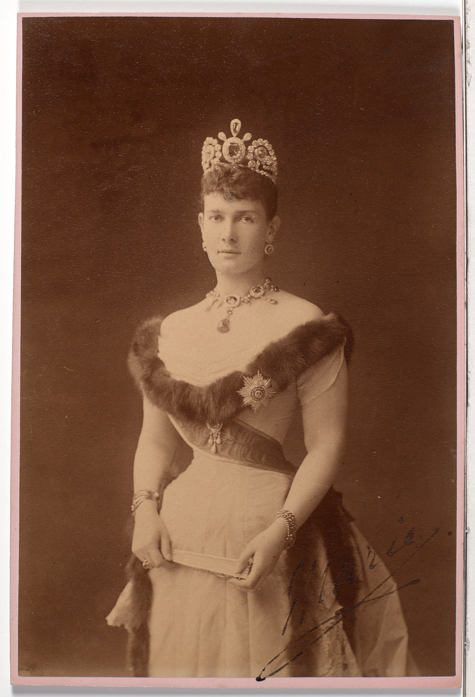 Fotografia w kształcie prostokąta przedstawia młodą kobietę ukazaną do kolan. Obydwie ręce opuszczone wzdłuż ciała. W dłoniach trzyma wachlarz. Włosy upięte w tyle głowy, na czole ufryzowana grzywka. Na głowie bogato zdobiony brylantami diadem. W uszach kolczyki z brylantów. Kobieta ubrana jest w jasną długą, suknię ozdobioną ciemnym futerkiem przy dekolcie. Na szyi naszyjnik ze szlachetnych kamieni. Na przegubach obu rąk bransolety. Przez prawe ramię kobiety przebiega wielka wstęga. Przy lewej piersi gwiazda orderowa. W prawym dolnym rogu czarnym atramentem napis: „Marie”. Odwrocie zaklejone tekturą. Pośrodku odwrocia umocowana podpórka do stawiania fotografii. Przejęto ze zbiorów Potockich z Łańcuta w 1944r.