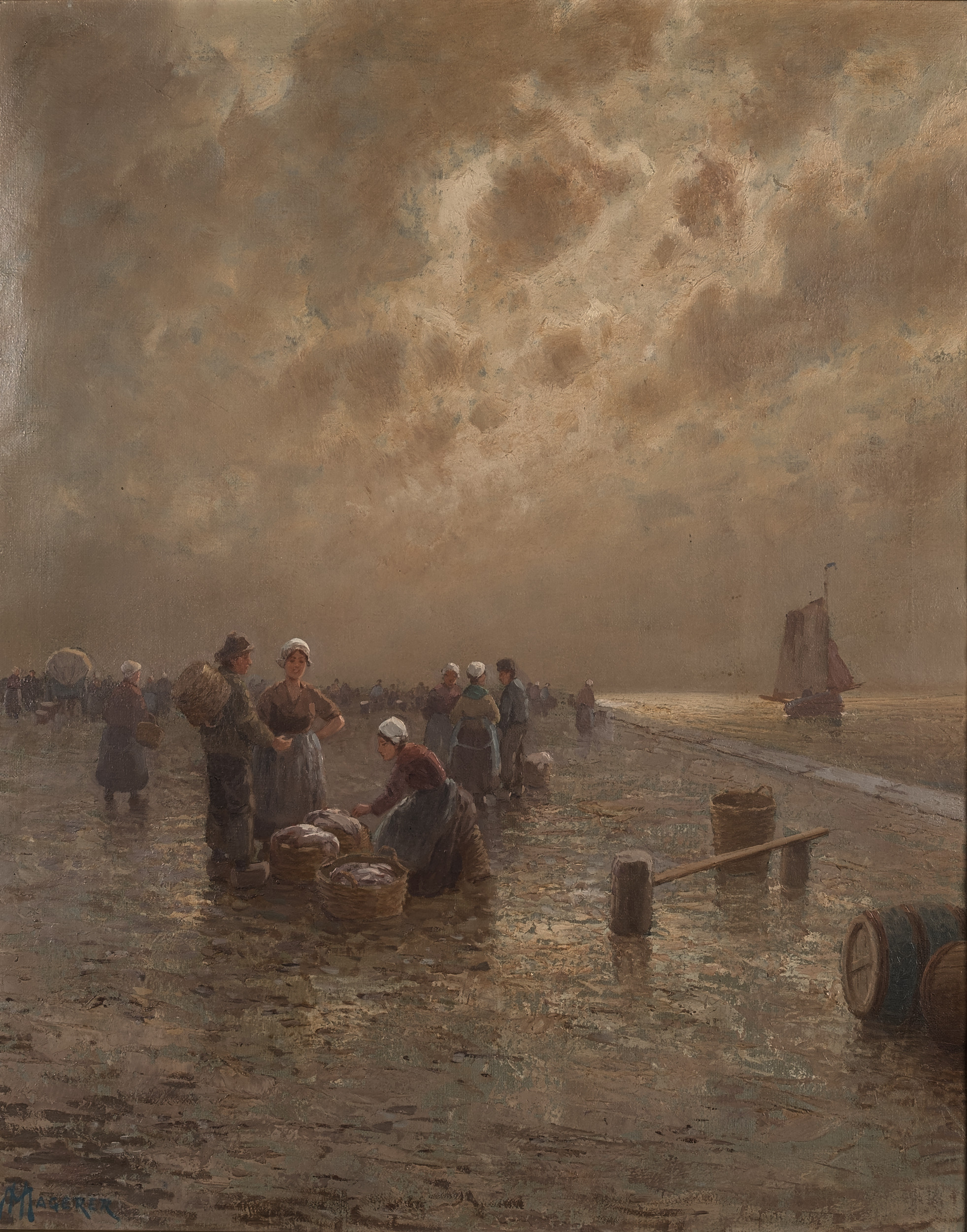 Obraz z kolekcji Potockich, dawnych właścicieli zamku łańcuckiego, przedstawia scenę sprzedaży ryb na nabrzeżu. Kolorystyka obrazu jasna, szaro – złotawo – różowa, , spokojna, barwy przygaszone. Faktura płótna chropowata, widać wyraźne uderzenia pędzla. Lewą stronę obrazu zajmuje nabrzeże, na którym odbywa się targ, prawą skrawek morza z płynącym po nim żaglowcem. Na nabrzeżu grupki ludzi. Najbliżej widza siedząca kobieta wskazująca ręką na ryby w koszach stojących przed nią, obok niej mężczyzna i kobieta pogrążeni w rozmowie dotyczącej handlu, gdyż oboje wskazują na pełne ryb kosze. Za nimi inne grupki również zajęte handlem. W tłumie wyróżniają się białe chusty kobiet. Scena rozgrywa się pod niebem zasnutym chmurami, pejzaż jakby przed lub po burzy. Zza chmur wygląda słońce oświetlając morze, na którego powierzchni tworzy się srebrna, z leciutkim złotym odcieniem poświata. Chmury szare, z prześwitami błękitu, lekko różowiejące na horyzoncie. Nabrzeże w kolorze szaro – niebiesko – różowawym, mokre, gdyż odbija się w nim niebo po burzy. Obraz sygnowany w lewym dolnym rogu „H. Magerer”. Niestety niewiele wiemy o tym malarzu. Był prawdopodobnie Austriakiem, żyjącym na przełomie XIX /XX w, specjalizował się w krajobrazach i scenkach rodzajowych, wile razy powtarzał ten sam temat (targi z kwiatami, warzywami i owocami morza) w różnych ustawieniach – na aukcjach pojawiają się tego typu obrazy jego pędzla jak Kwiaciarki na molo, Kwiaciarki na nabrzeżu itp. Omawiamy obraz ujęty w podwójną ramę: wewnętrzną wąską, srebrzoną dekorowaną stylizowanym astragalem i zewnętrzną szeroką, profilowaną, czarną jest eksponowany na Korytarzu Północnym II p zamku.