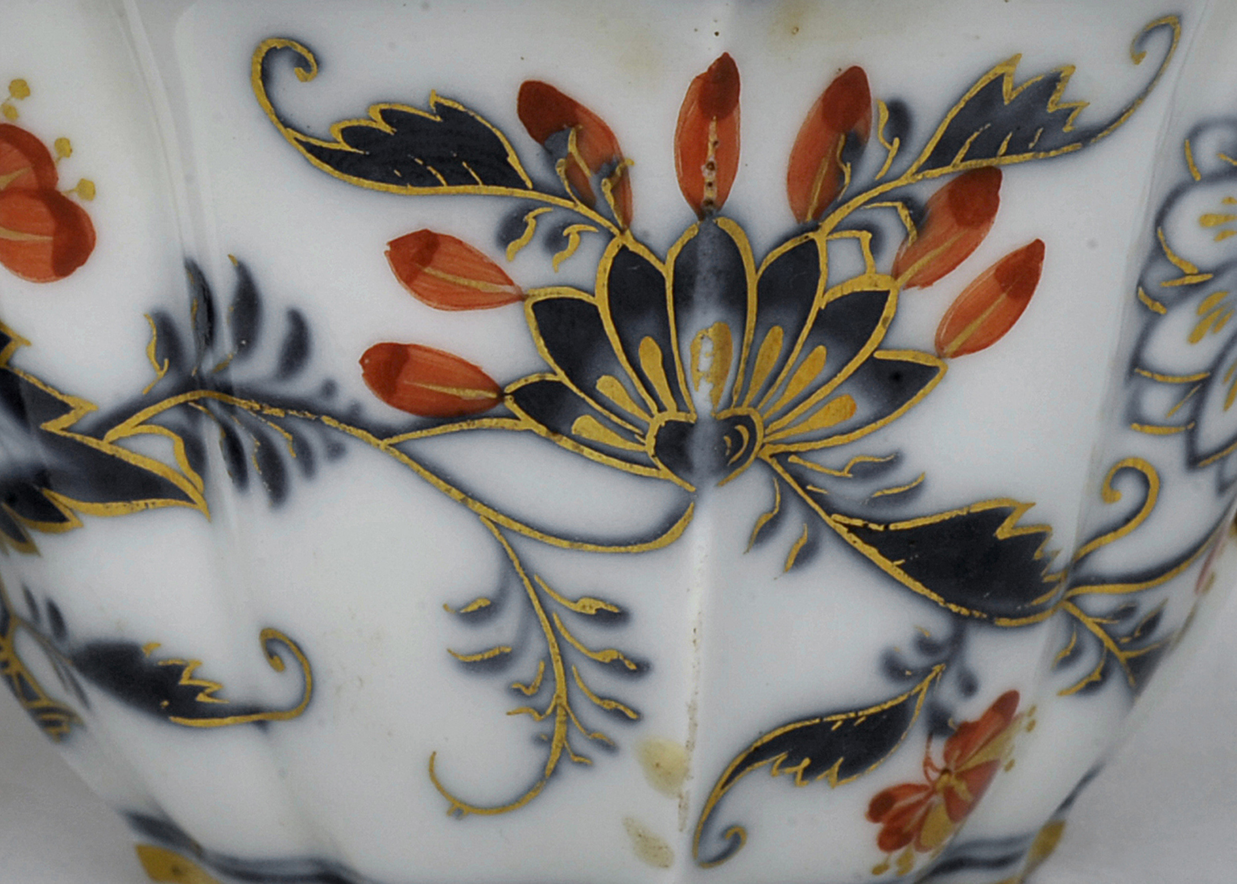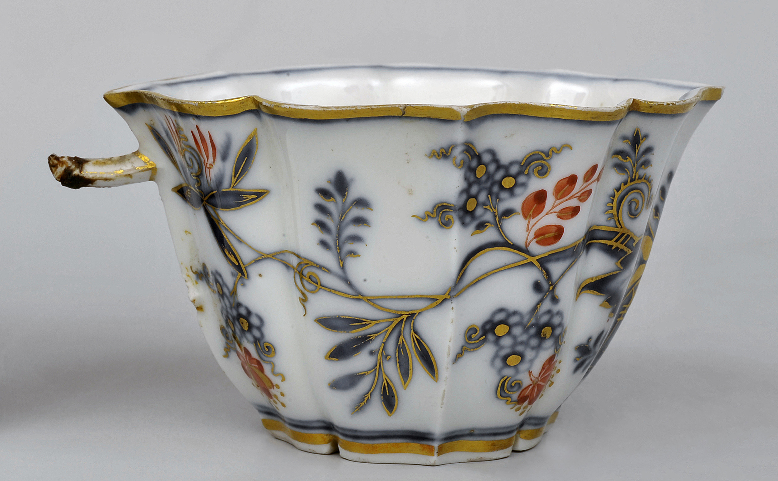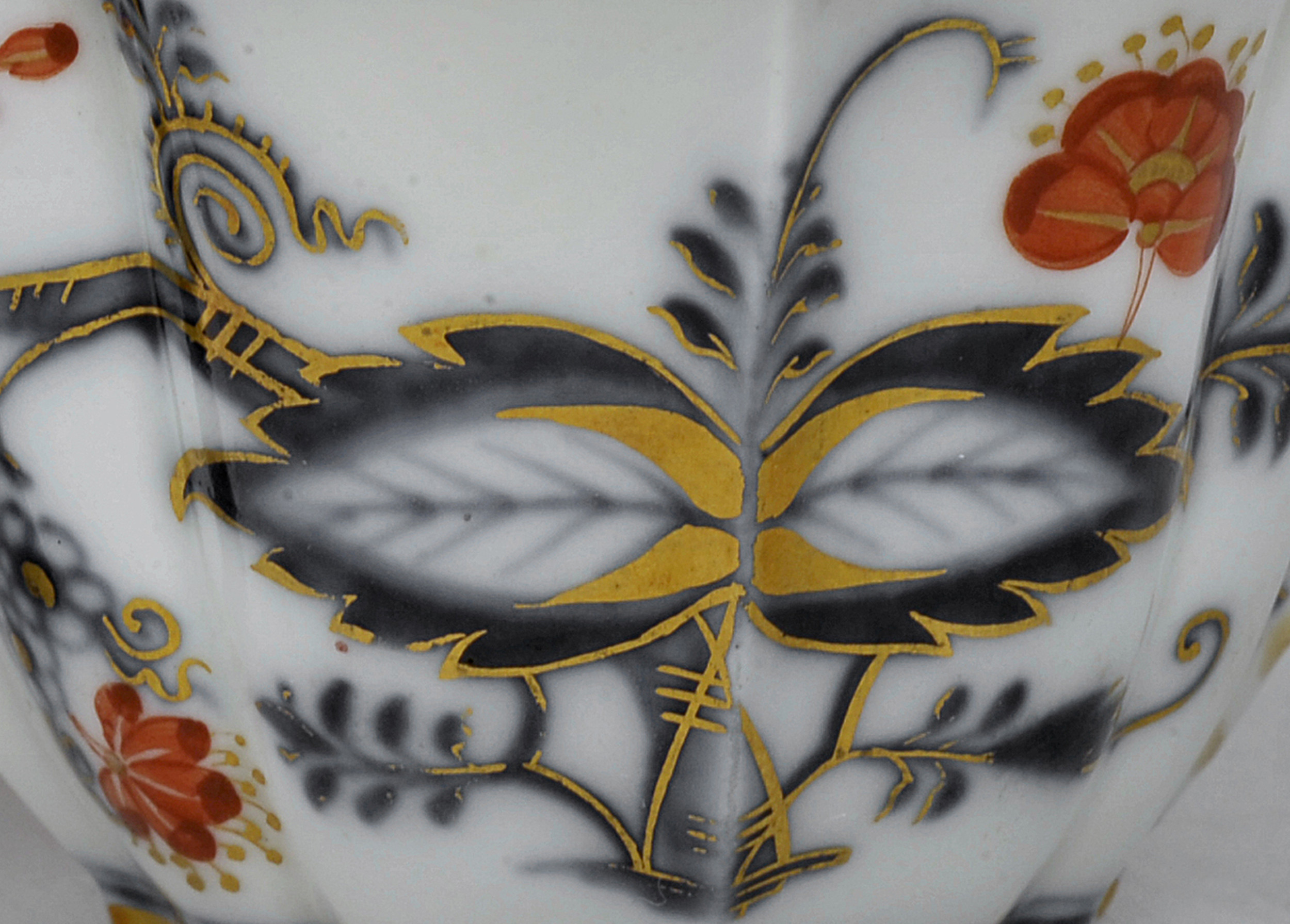 Naczynko zostało ozdobione wariantem tzw. wzoru cebulowego, powstałego w wytwórni miśnieńskiej około 1730 roku. Artyści wzorowali się na porcelanie dalekowschodniej zdobionej motywami roślinnymi w technice kobaltu podszkliwnego. We wzorze pojawiają się kwiaty związane z kulturą Chin takie jak astry, piwonie czy chryzantemy, przekształcone jednak przez europejskich malarzy. W skład motywu wchodzą także owoce – inspirowane granatami lub brzoskwiniami. Jednak wychodzące spod pędzla malarzy kobaltem pracujących w Miśni stylizowane wzory stawały się z biegiem lat coraz bardziej uproszczone i przypominające dobrze znane… cebule. Wzór zaczęto nazywać „cebulowym,” a naczynia zdobione nim wytwórnia w Miśni produkuje do dzisiaj. Można zaryzykować stwierdzenie, że to najpopularniejszy w historii europejskiej porcelany motyw zdobniczy. Jego najczęściej stosowanym wariantem jest ten malowany wyłącznie w technice kobaltu podszkliwnego, na wilanowskiej filiżance został on jednak uzupełniony o dodatkowe elementy malowane naszkliwnie i złocone.