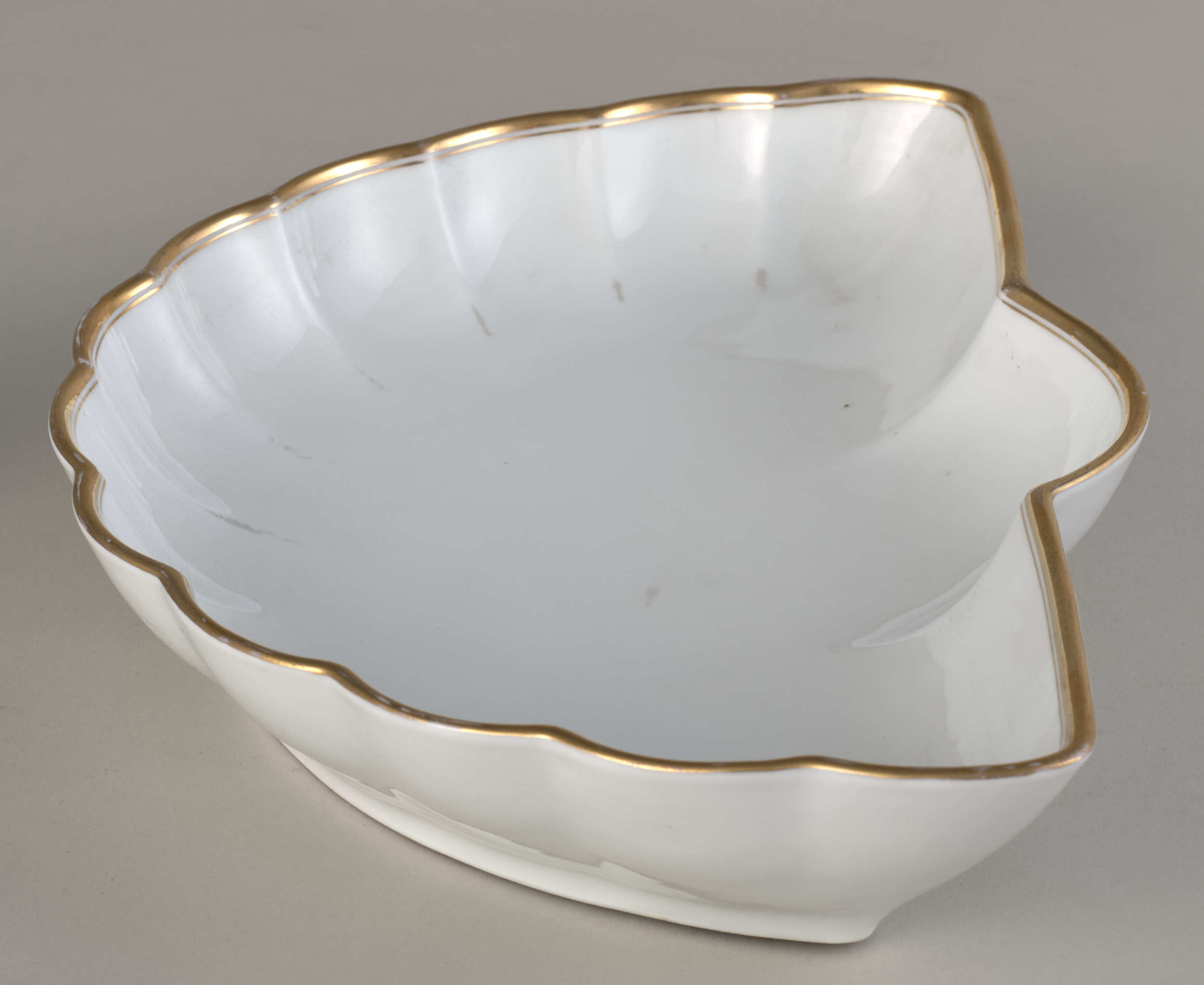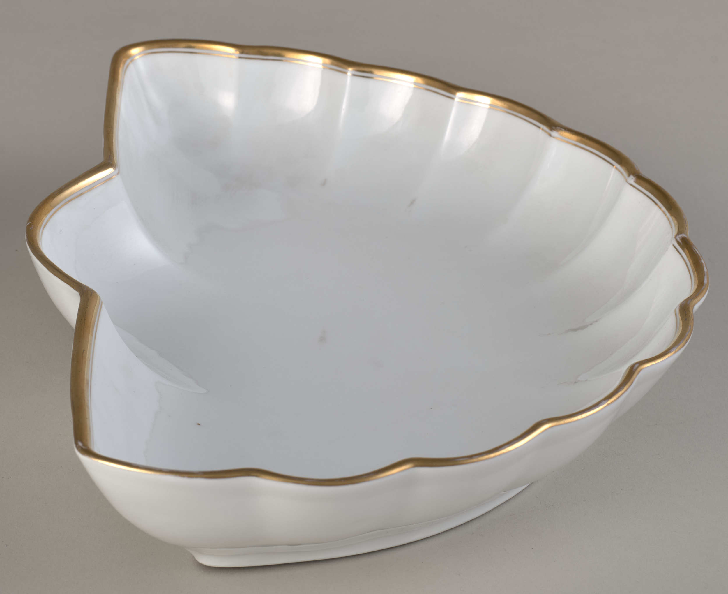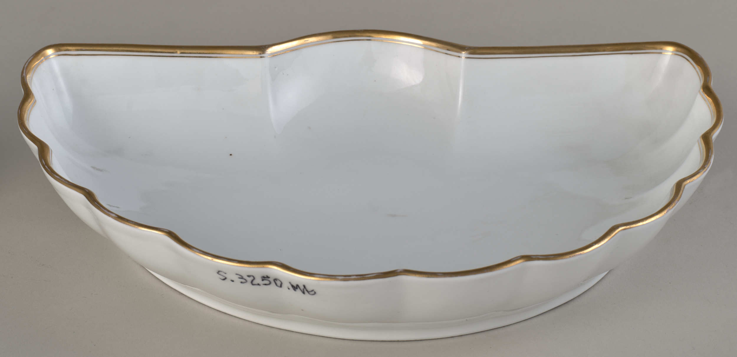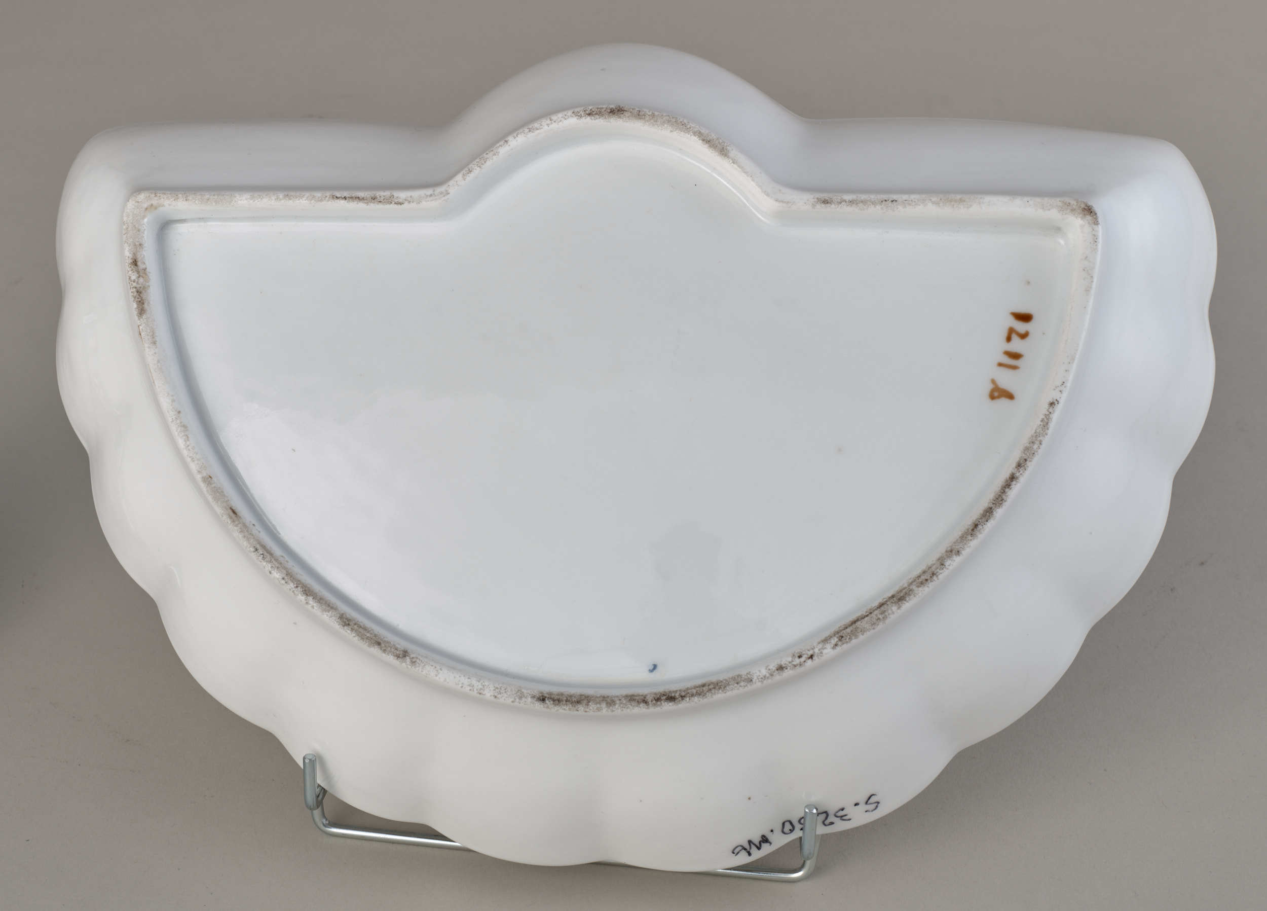 Salaterka z białej porcelany o kształcie półkolistym przypominającym część muszli lub otwarty wachlarz o dwunastu promieniach. Brzeg naczynia lamowany złotym paskiem. Salaterka posiada niewielką stopkę. W świetle stopki widoczna sygnatura fabryczna „F M” wyciśnięta stemplem w masie. Porcelana kształtowana w formie, lata produkcji 1853-1875, Czechy, Brezowa / Pirkenhammer/, fabryka Fishera i Miega.