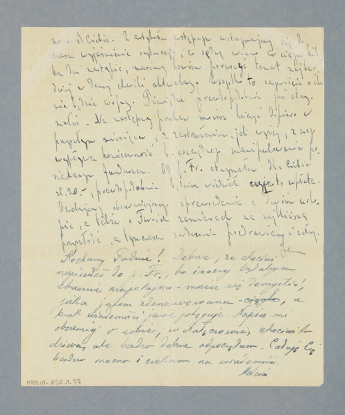 Kochany Tadziu! Dobrze, że chociaż napisałeś do p. Fr[ydlender], bo inaczej byłabym strasznie niespokojna – możesz się domyślić, jaka jestem zdenerwowana, a brak wiadomości jeszcze potęguje. Napisz mi obszerniej o sobie; w Nałęczowie, chociaż to dziwne, ale bardzo dobrze odpoczęłam. Całuję Cię bardzo mocno i czekam na wiadomości.