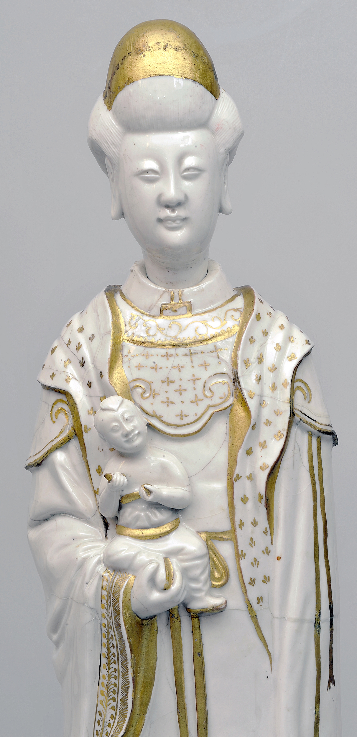 Figura przedstawiająca „songzi Guanyin”, czyli „przynoszącą dziecko”. Rzeźba wykonana jest z pięknej białej porcelany, później ozdobionej polichromią. Guanyin, przedstawiana jako kobieta, jest w buddyzmie chińskim odpowiednikiem buddyjskiej Awalokiteśwary – bodhisattwy uosabiającej współczucie. Postać ta była szczególnie popularna w Chinach i często przedstawiana w sztuce chińskiej.