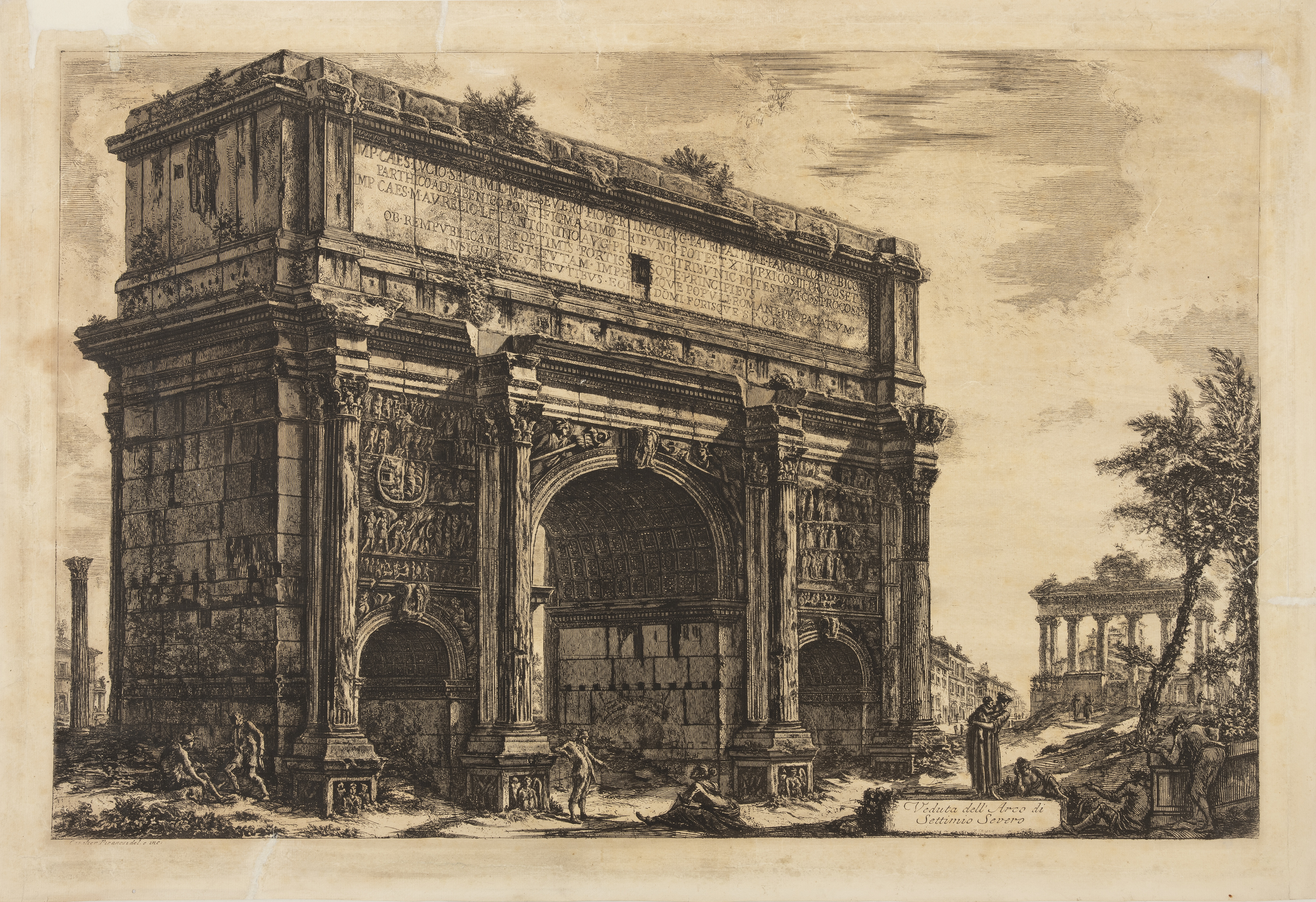 Rycina Veduta dell’Arco di Settimio Severo pierwotnie ukazała się w dziele G.P. Piranesiego Vedute di Roma w 1772. Natomiast niniejsza grafika wydana została w 1783 roku lub późnej. Piranesi czynny był w Neapolu i Wenecji, ale głównie w Rzymie, gdzie początkowo pracował jako agent i sprzedawca rycin Josepha Wagnera (1706–1780), a następnie założył własną pracownię rytowniczą przy Via del Corso. Interesował się starożytnością i badaniami archeologicznymi sam będąc archeologiem, co potwierdza tytuł honorowego członka Royal Society of Antiquarians w Londynie, który otrzymał w 1757. Gdy był już uznanym artystą, w 1761 roku, w swoje zaszczytne grono przyjęła go także Akademii św. Łukasza w Rzymie, a w 1767 papież Klemens XIII nadał mu szlachectwo.