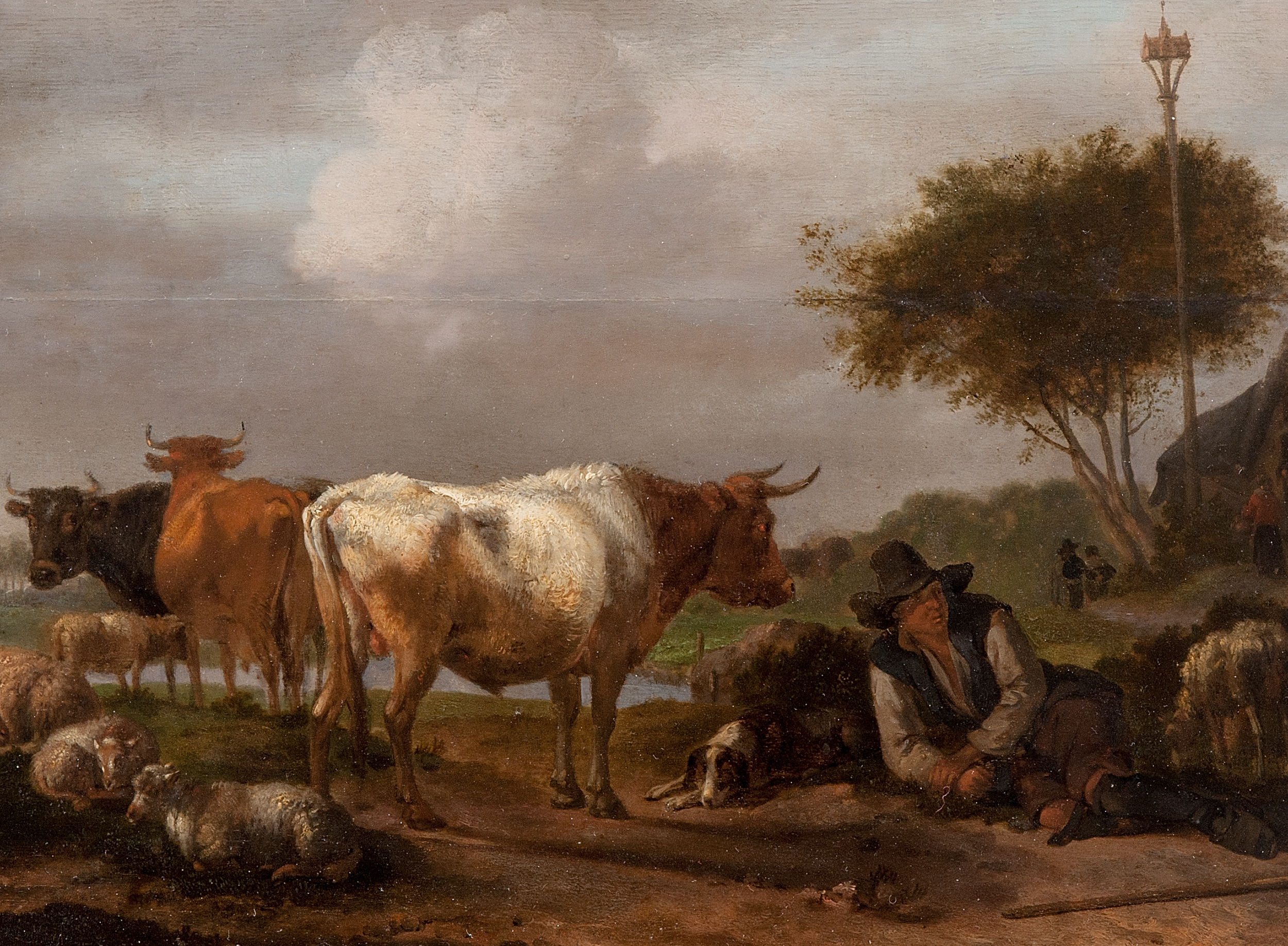 Z kolekcji Stanisława Kostki Potockiego. Na odwrocie obrazu znajduje się nalepka z pieczęcią hrabiego i odręcznym napisem: „Paysage avec betail de Klomb – éleve de Potter”. Wiązany jest również z zapisem w Spisie obrazów z 1821 r., nr 154” „Krajowid Pastuch z bydłem na drzewie maloewany – Klomp eleve de Paul Pautre”.
