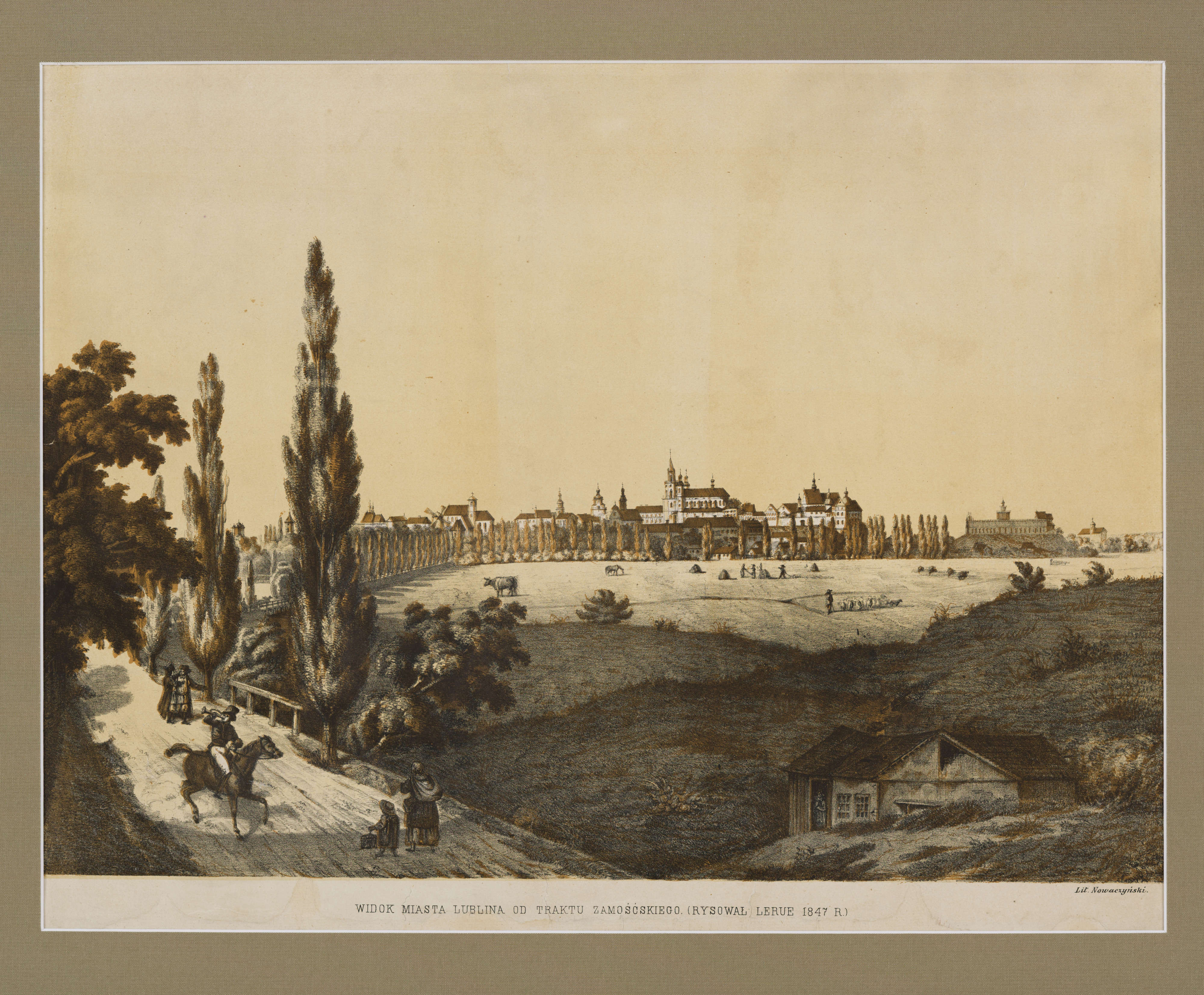 Litografia pokazuje ujęty od południa XIX-wieczny Lublin oraz trakt zamojski, zwany początkowo piaseckim (dziś ulice Kardynała Stefana Wyszyńskiego i Zamojska). Został on wytyczony w 1815 roku na drodze „na Piaski”, powstał w ramach odbudowy miasta po wojnach napoleońskich. Wychodził na wprost kościoła pojezuickiego i zastąpił dotychczasowy, stary wyjazd z miasta w kierunku Zamościa z ulicy Bernardyńskiej. Część drogi zbudowano na nasypie utworzonym z gruzów z rozbiórki kolegium jezuickiego. Trakt stał się jedną z trzech głównych dróg prowadzących do Lublina, obok traktu warszawskiego (obecne Aleje Racławickie) oraz traktu na Lubartów, Terespol i Brześć (obecnie ulica Lubartowska).