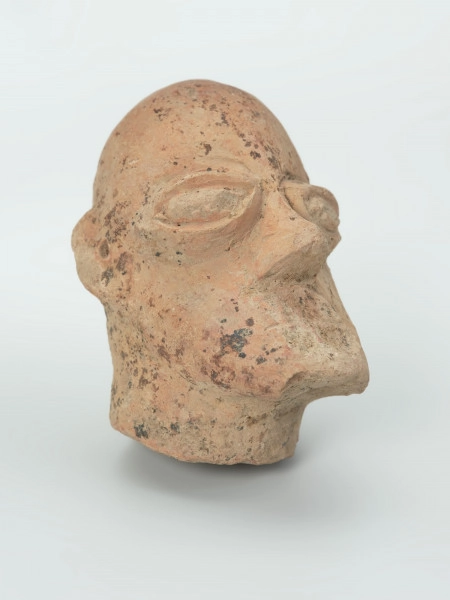 Prezentowana rzeźba przedstawia zadartą ku górze głowę z kwadratową twarzą, którą oparto na masywnej szyi. Prawdopodobnie przedstawia mężczyznę.