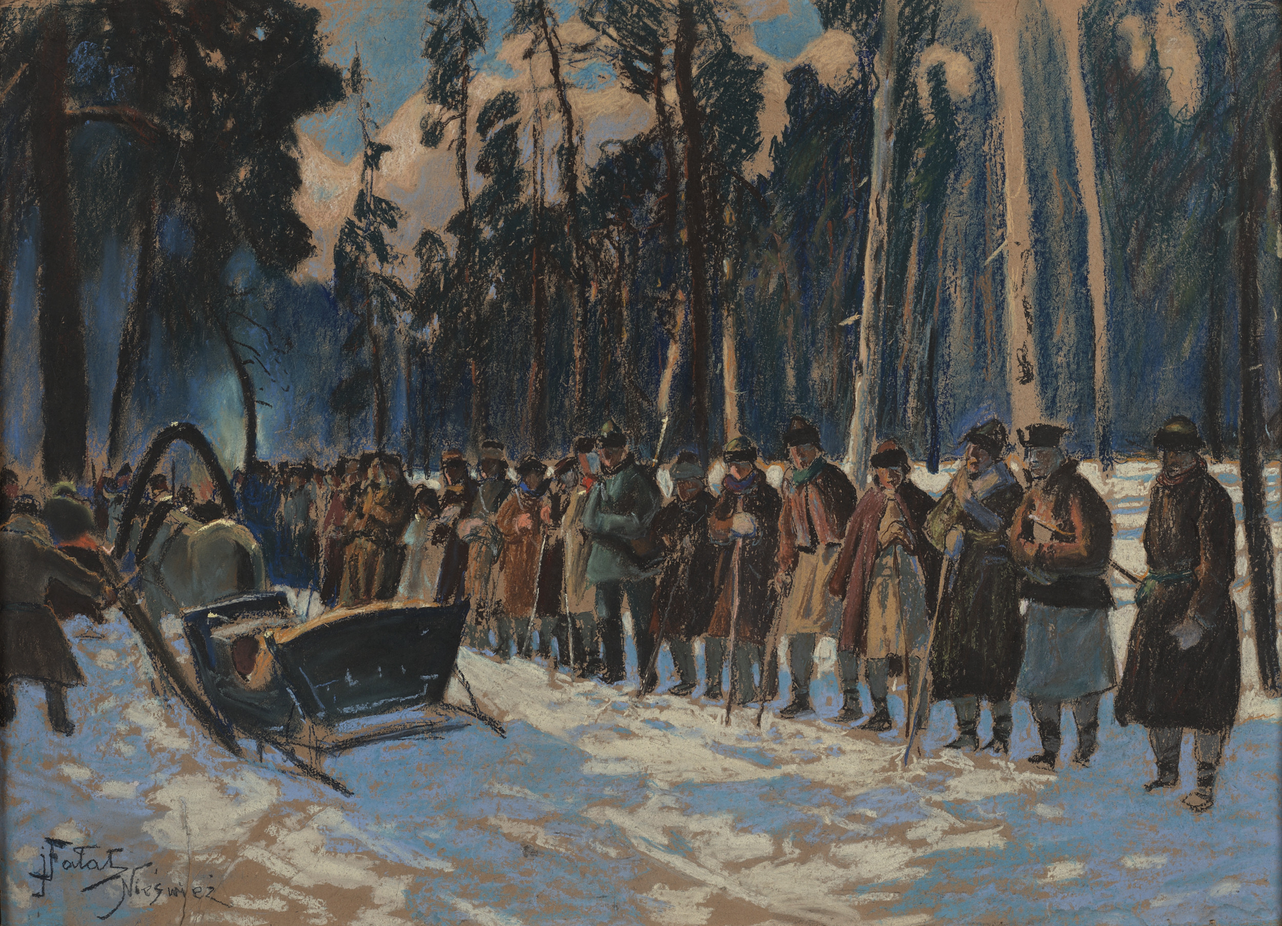 Obraz przedstawiający nagonkę na zwierza w lesie, zimą, przed wschodem słońca. Autorem obrazu jest Julian Fałat, słynny polski malarz akwarelista. Nieśwież należący do rodu Radziwiłłów często był miejscem organizowanych tu polowań na grubego zwierza. Jedno z takich polowań odbyło się w lutym 1886 roku, na które został zaproszony Fałat i gdzie spotkał się księciem pruskim Wilhelmem Hohenzollernem, późniejszym cesarzem Wilhelmem II. Spotkanie zaowocowało zaproszeniem artysty do Berlina, gdzie został nadwornym malarzem cesarza (do 1895 roku). Nie był to jedyny owoc tego polowania, gdyż od tej pory Fałat stał się mistrzem w scenach z polowań przedstawianych zawsze zimą, ale w kilku wariantach - nagonka, trębacze, wypłoszenie niedźwiedzia z barłogu, oszczepnicy (polujący na niedźwiedzia), obozowisko, powrót z polowania. To właśnie do tego typu obrazów należy obraz łańcucki, którego bardzo podobna wersja znajduje się w Muzeum Narodowym w Warszawie. Obraz malowany pastelami, z bardzo zróżnicowaną kolorystyką ciemnych drzew, na które kładą się granatowe cienie, białego śniegu z niebieskimi refleksami i kolorowych strojów naganiaczy. W tych scenach ujawniają się główne cechy impresjonistycznego widzenia pejzażu, w różnych porach dniach, różnym oświetleniu i charakterystycznym kładzeniu farby (czy to akwareli, czy gwaszy, czy jak w tym przypadku pasteli). Obrazy te cieszyły się wielką popularnością.