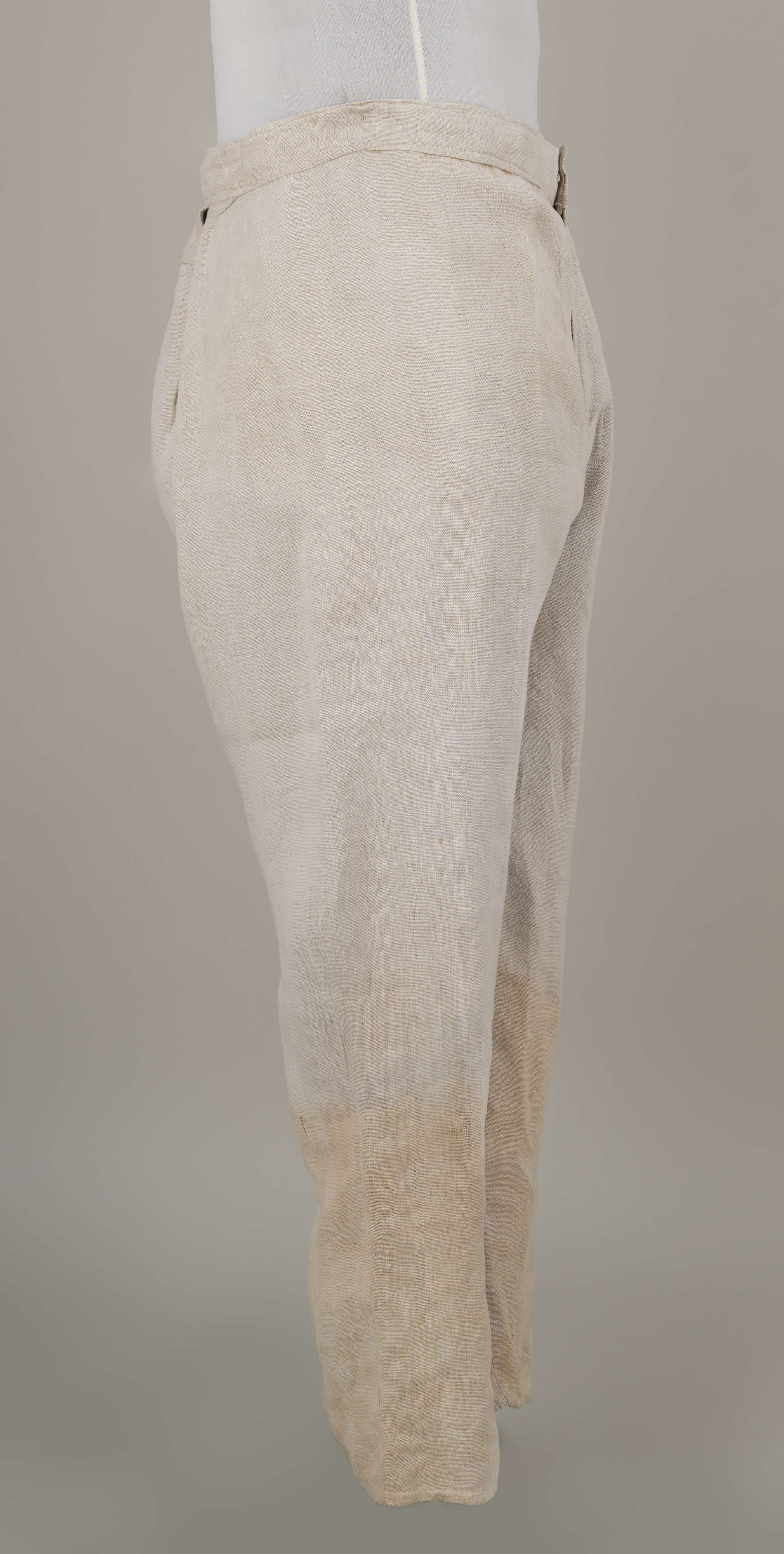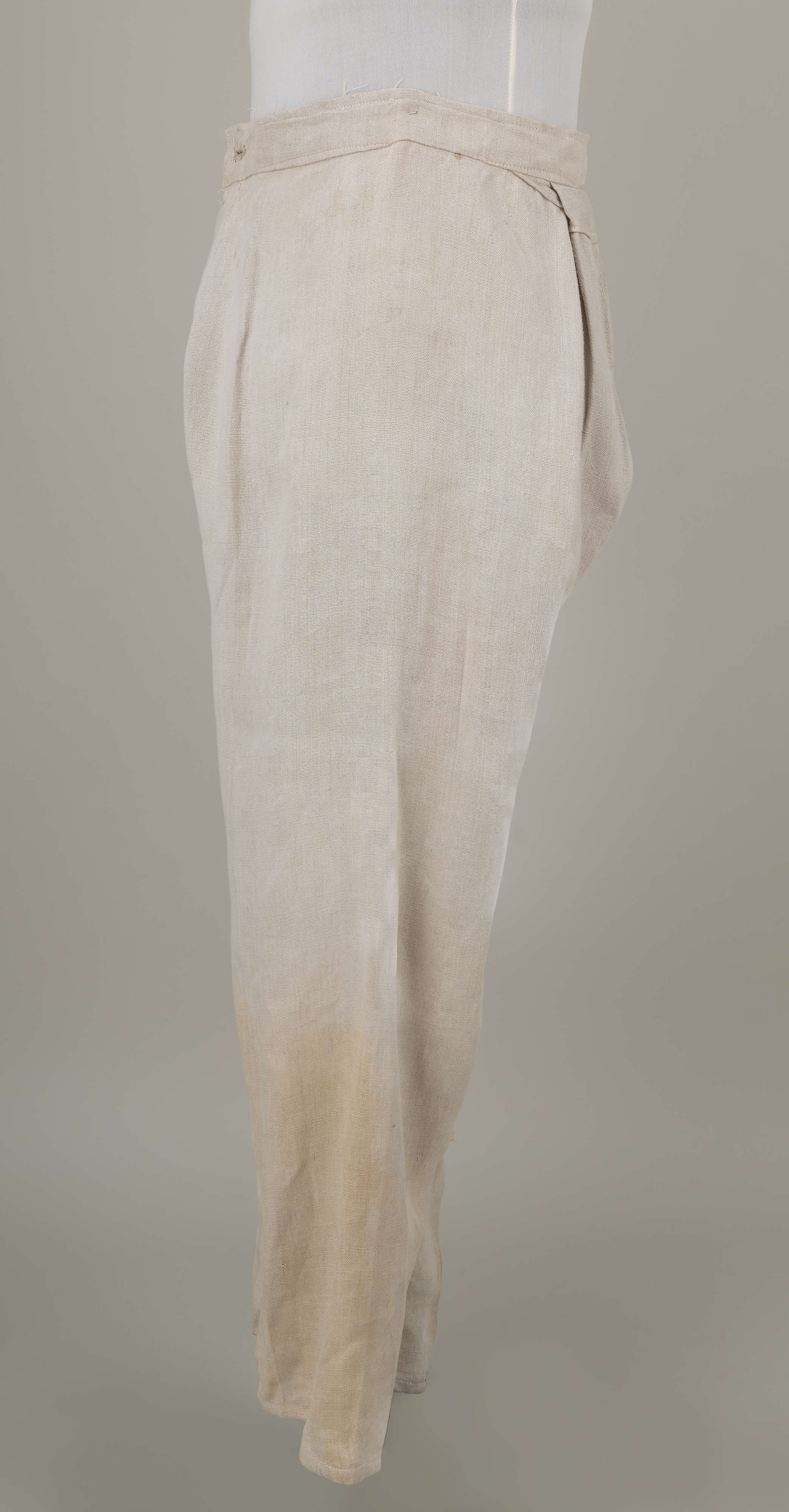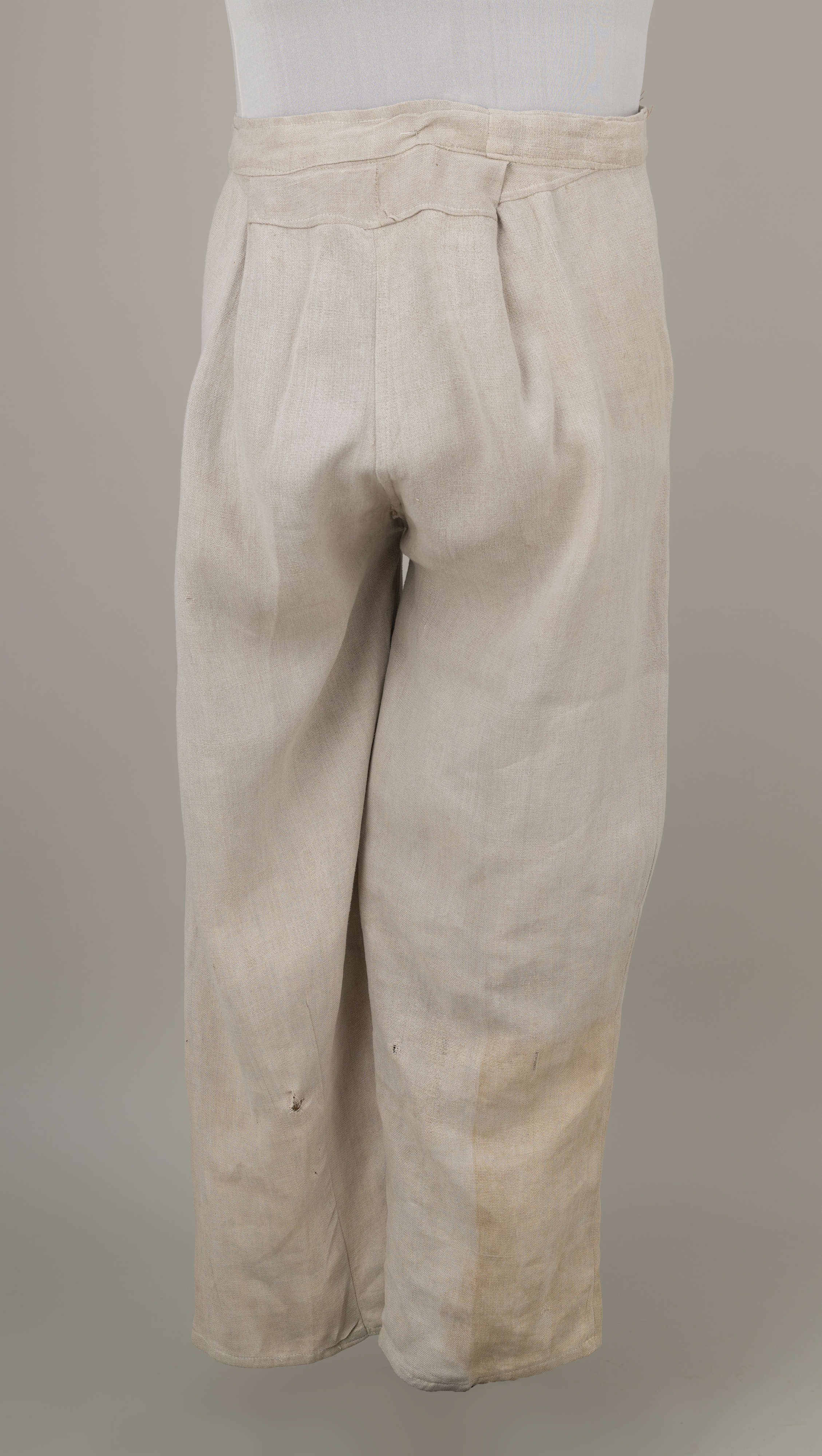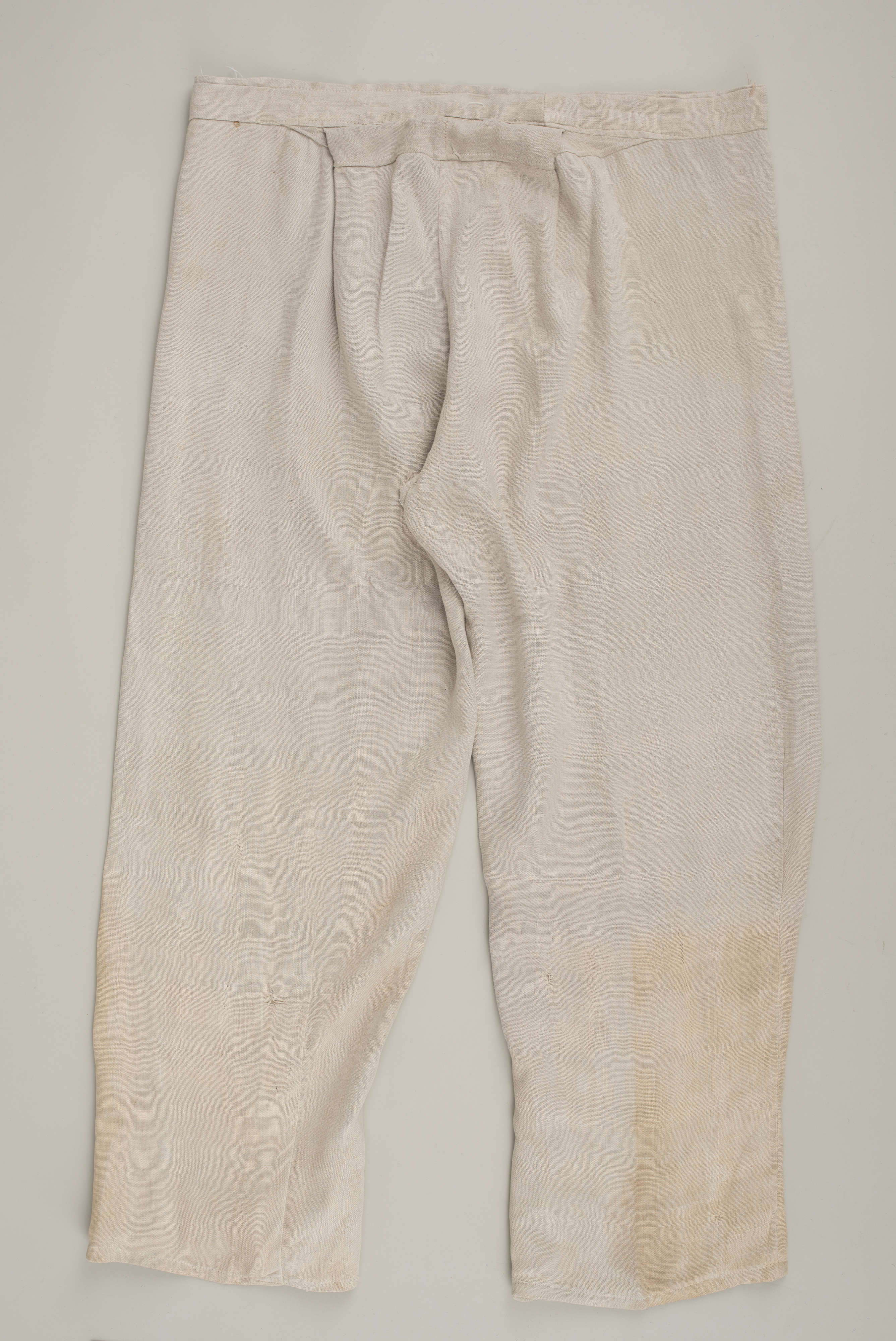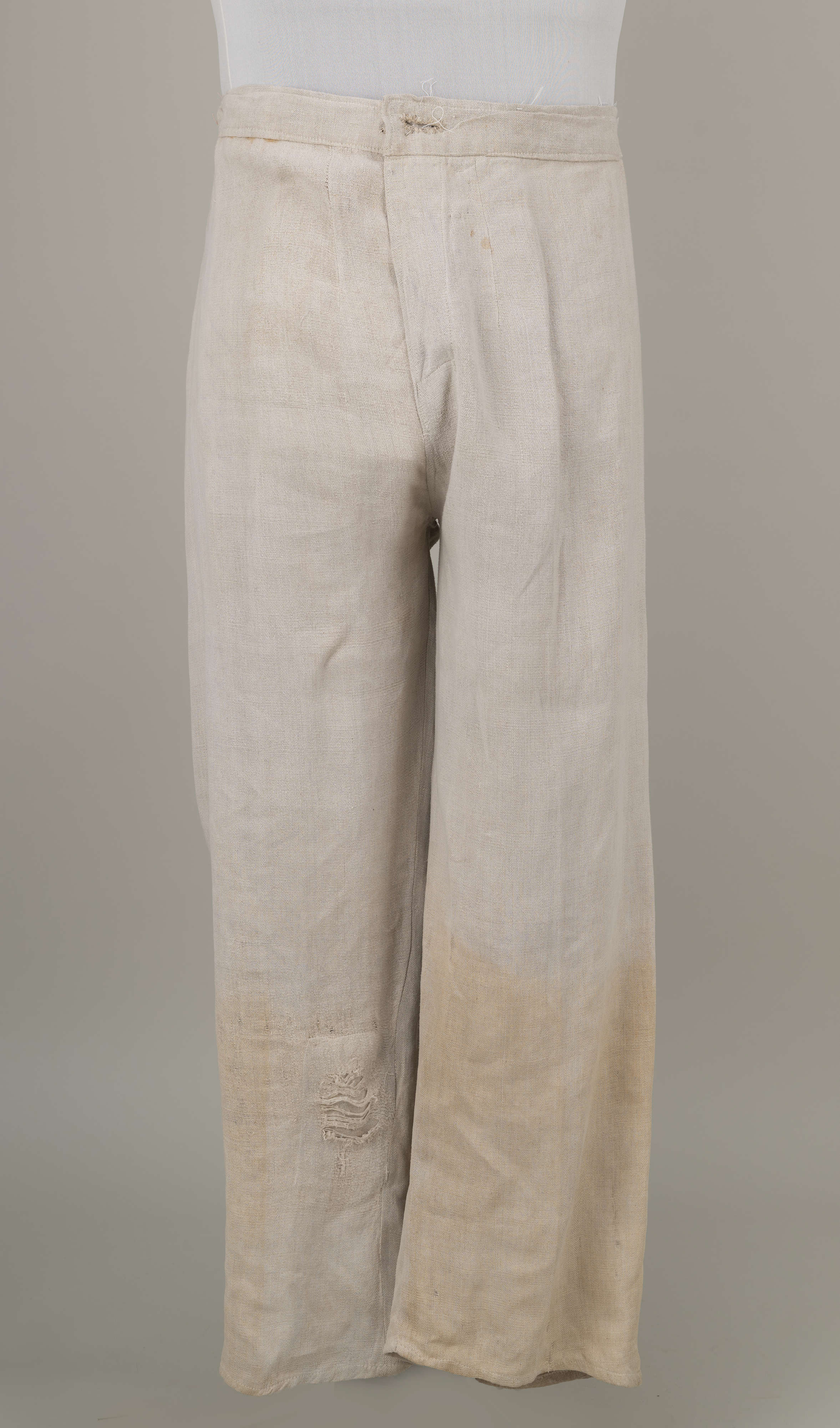 Spodnie lniane męskie z szerokimi nogawkami (z łatą na jednej nogawce) pochodzą z początku XX wieku z miejscowości Drelów w powiecie bialskim. Zostały uszyte maszynowo. Skrojono je z czterech części: z dwóch nogawek zszytych po wewnętrznej stronie (długość 96 cm, szerokość 24,5 cm), paska (długość 96 cm, szerokość 3,5 cm) i pasa prostokątnego materiału doszytego w tylnej części pod paskiem. Są zapinane w pasie na guzik (rozporek z przodu ma długość 15 cm). Tego typu spodnie noszono najczęściej w lecie do stroju świątecznego, a gdy były już podniszczone, przeznaczano je do używania na co dzień. Uszyte są z płótna samodziałowego wykonanego na warsztacie tkackim, we własnym zakresie w gospodarstwie domowym. Dla uzyskania jak najjaśniejszego odcienia po ich upraniu, najczęściej w ługu, były suszone na słońcu, co miało zapewnić wybielenie. Na początku minionego stulecia ten typ spodni zakładano głównie w dni powszednie do pracy, a do stroju świątecznego noszono spodnie z materiałów fabrycznych w kolorze czarnym lub granatowym. Ich krój był taki sam. Bardzo często, na modę miejską, zaprasowywano w nich nogawki na kant żelazkiem na węgiel lub duszę, aby dodać im elegancji. W tej części Lubelszczyzny mężczyźni do takich spodni zakładali łapcie z lipowego, brzozowego lub wiązowego łyka, cięte w paski. Przed ich nałożeniem okręcano stopę i łydkę w nogawce kawałkiem materiału, zwanym onucą, i obwiązywano sznurkiem przymocowanym do buta. Taki sposób ich noszenia sprawiał, ze nogawki przylegały ścisłe do nogi i nie podwijały się. Na początku XX wieku w okolicach Białej Podlaskiej mężczyźni nosili coraz częściej do stroju świątecznego wysokie buty z cholewami, do których wpuszczano nogawki.