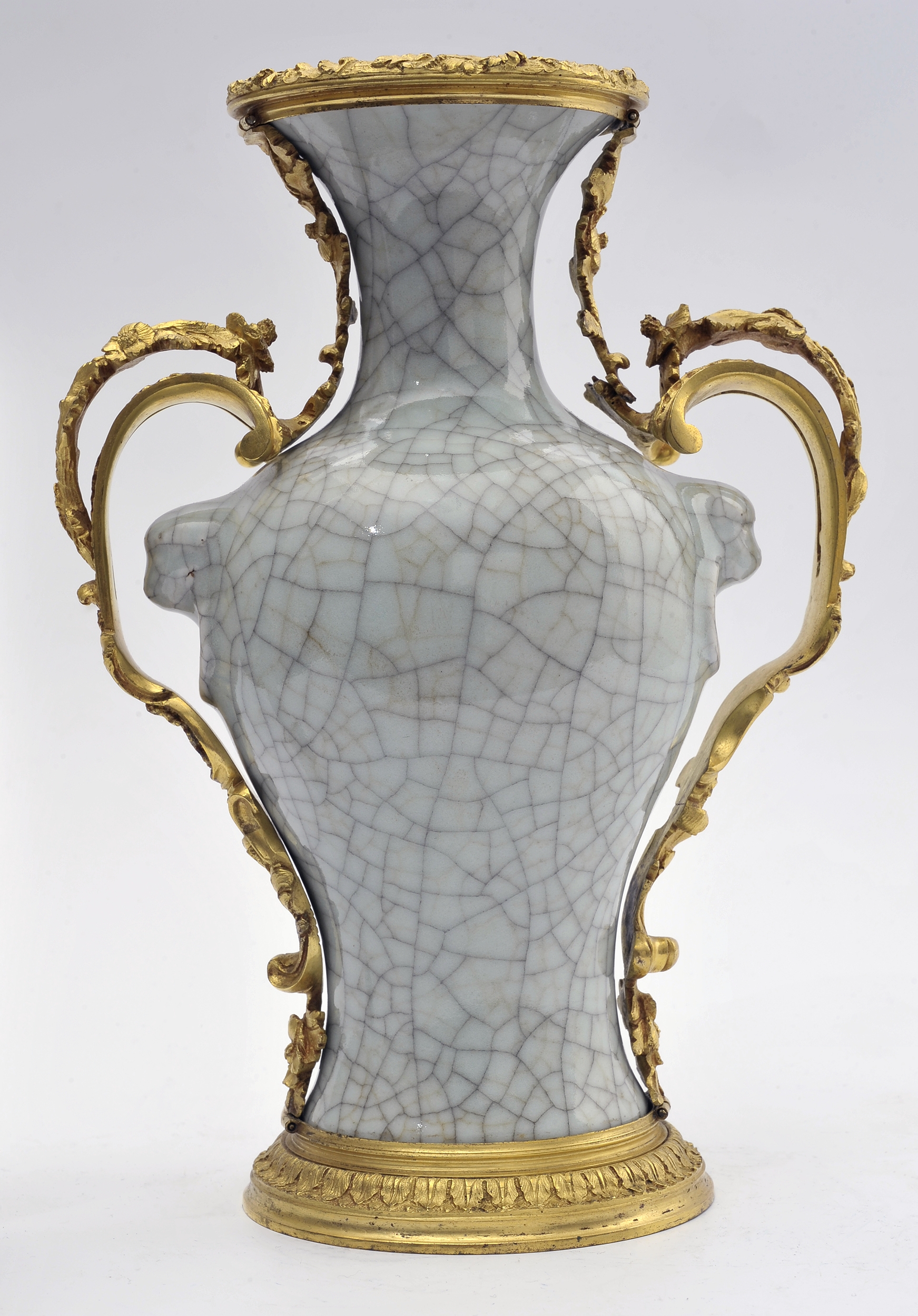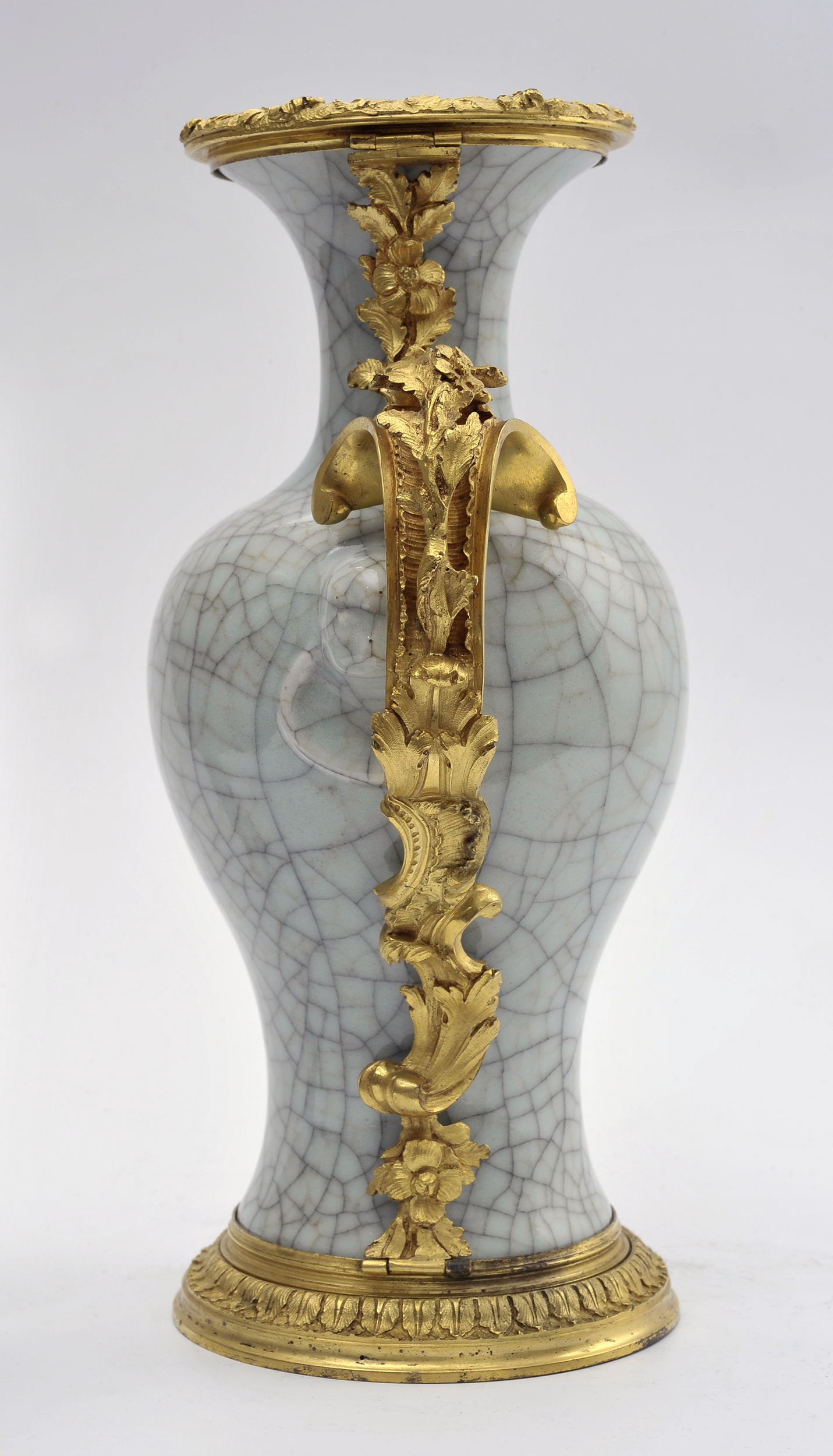 Porcelanowy wazon na stosunkowo wysokiej stopie płynnie przechodzącej w owoidalny brzusiec, dalej miękko przechodzący w stosunkowo wąską szyję z rozszerzającym się wylewem. W górnej części brzuśca po bokach zaznaczone dwa plastyczne uchwyty. Naczynie ozdobiono dekoracją ze złoconego brązu zaczynającą się od cyzelowanej podstawy obejmującej stopę wazonu przez modelowane plastycznie uchwyty łączące się z oprawą obwodu wylewu. Elementy te dodano później, dostosowując wygląd przedmiotu do gustu europejskiego.