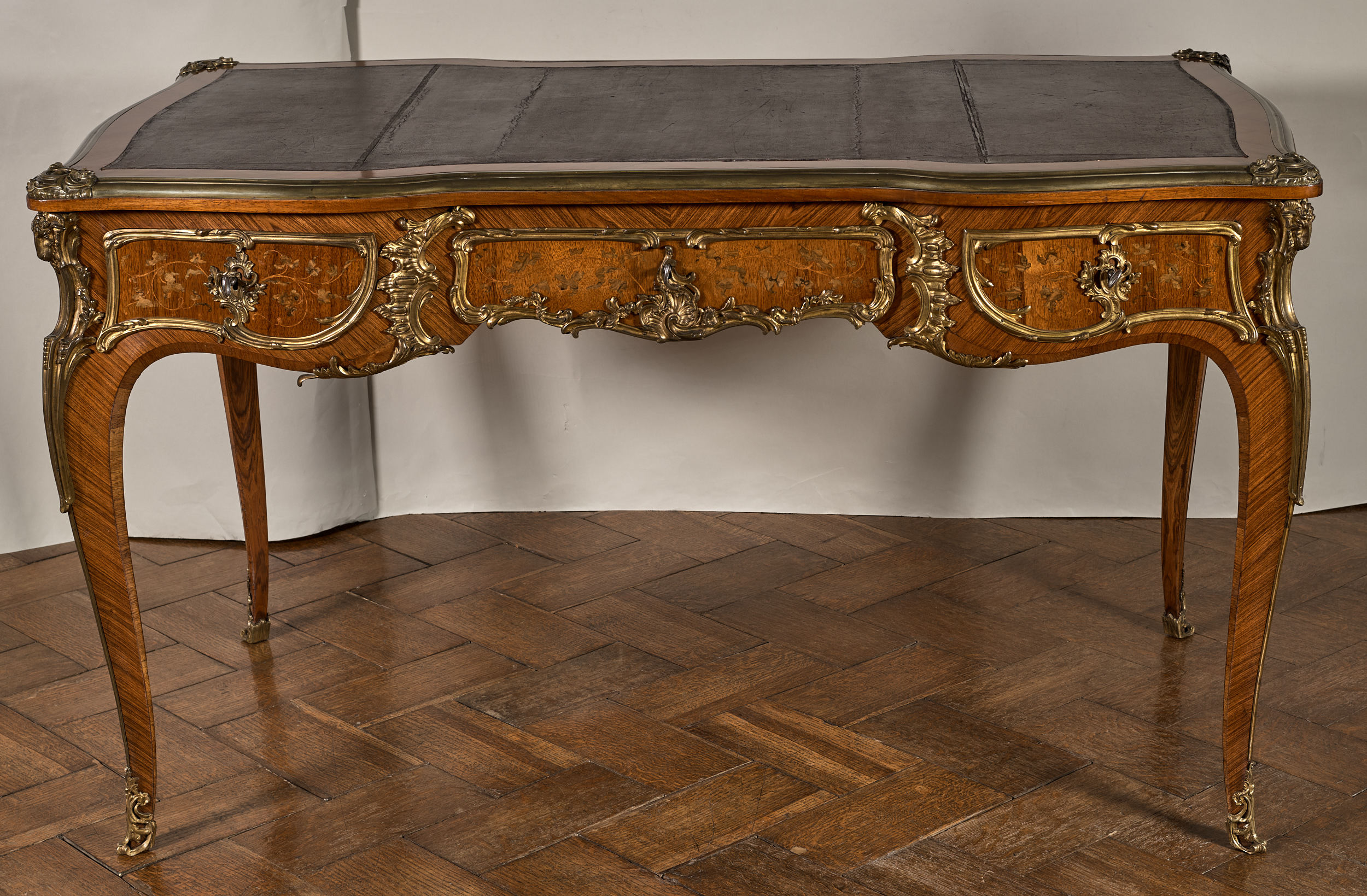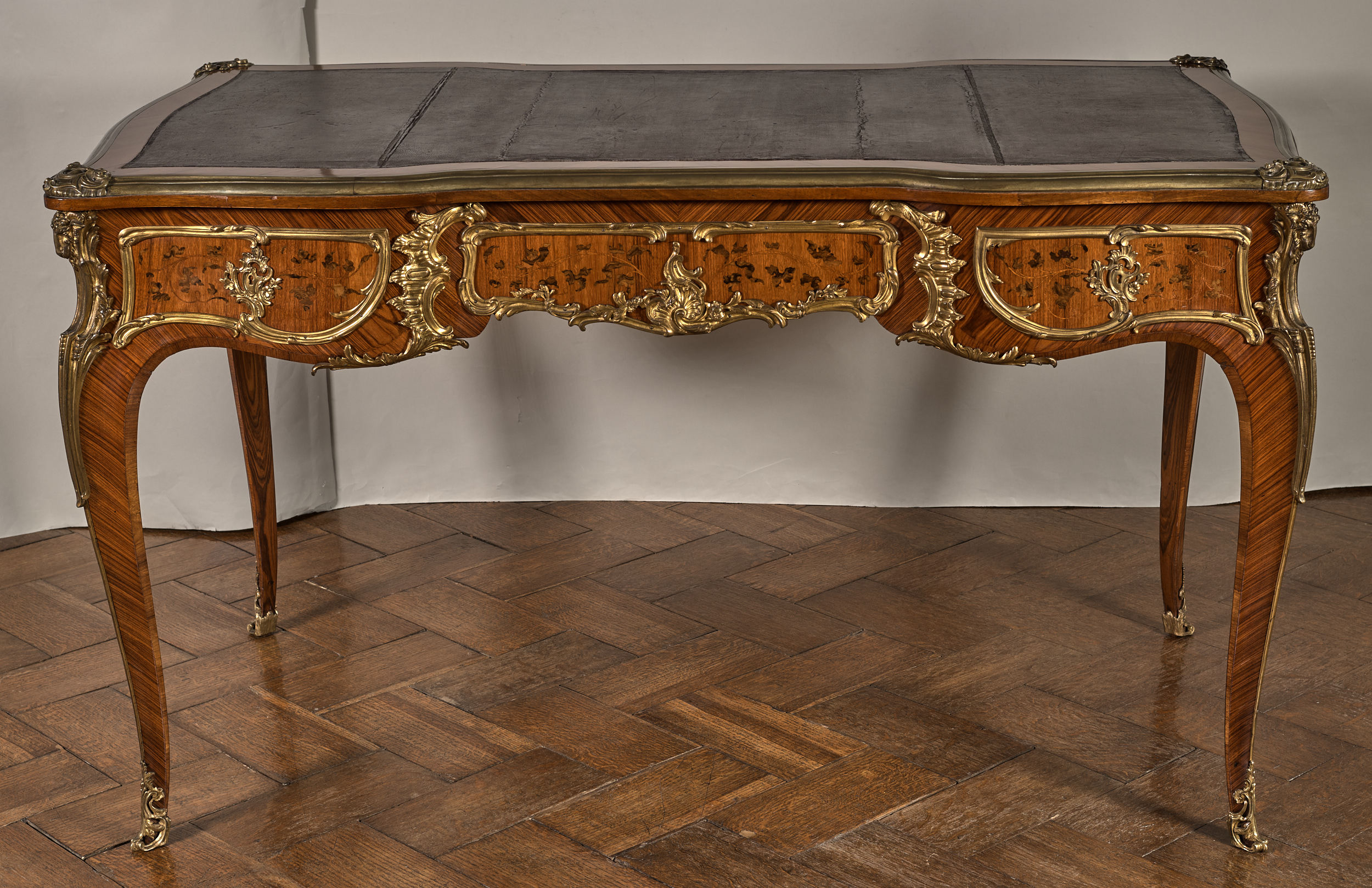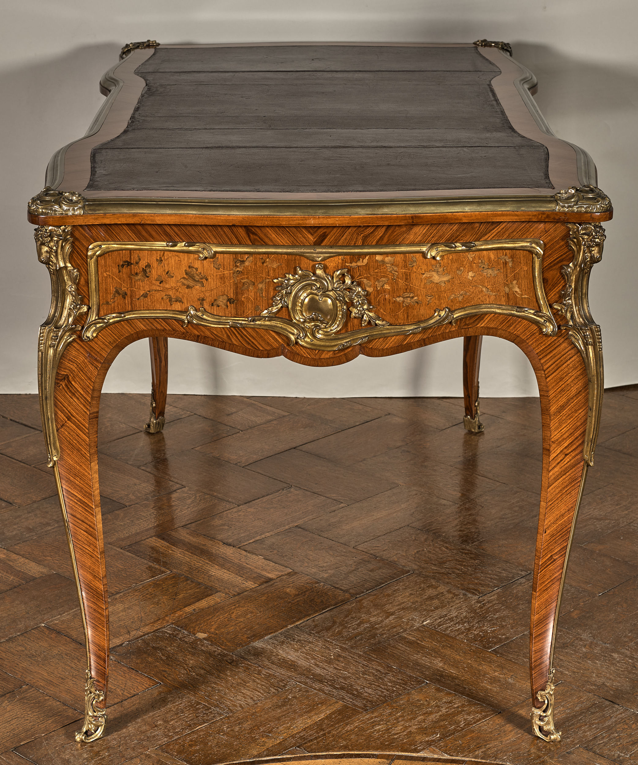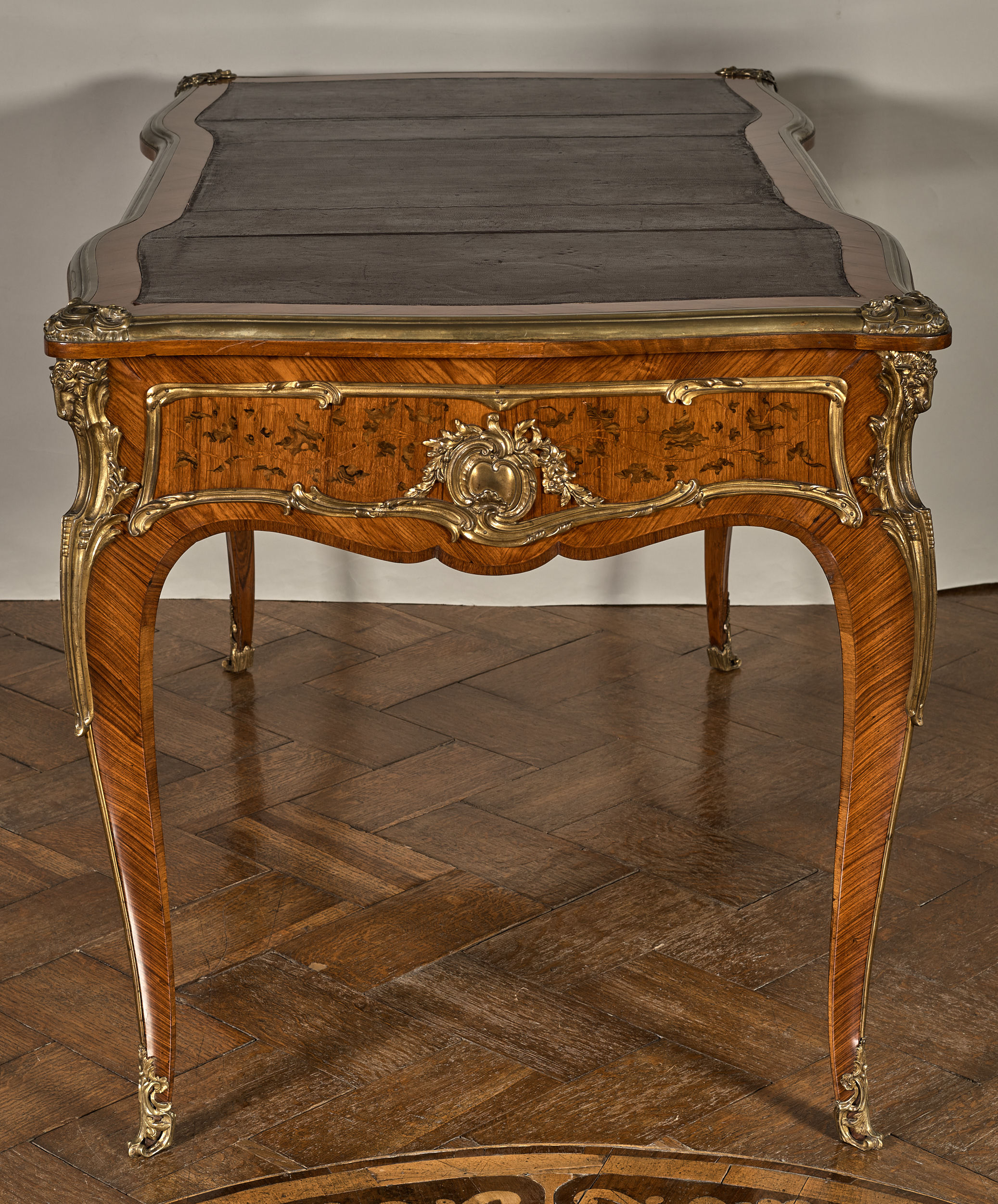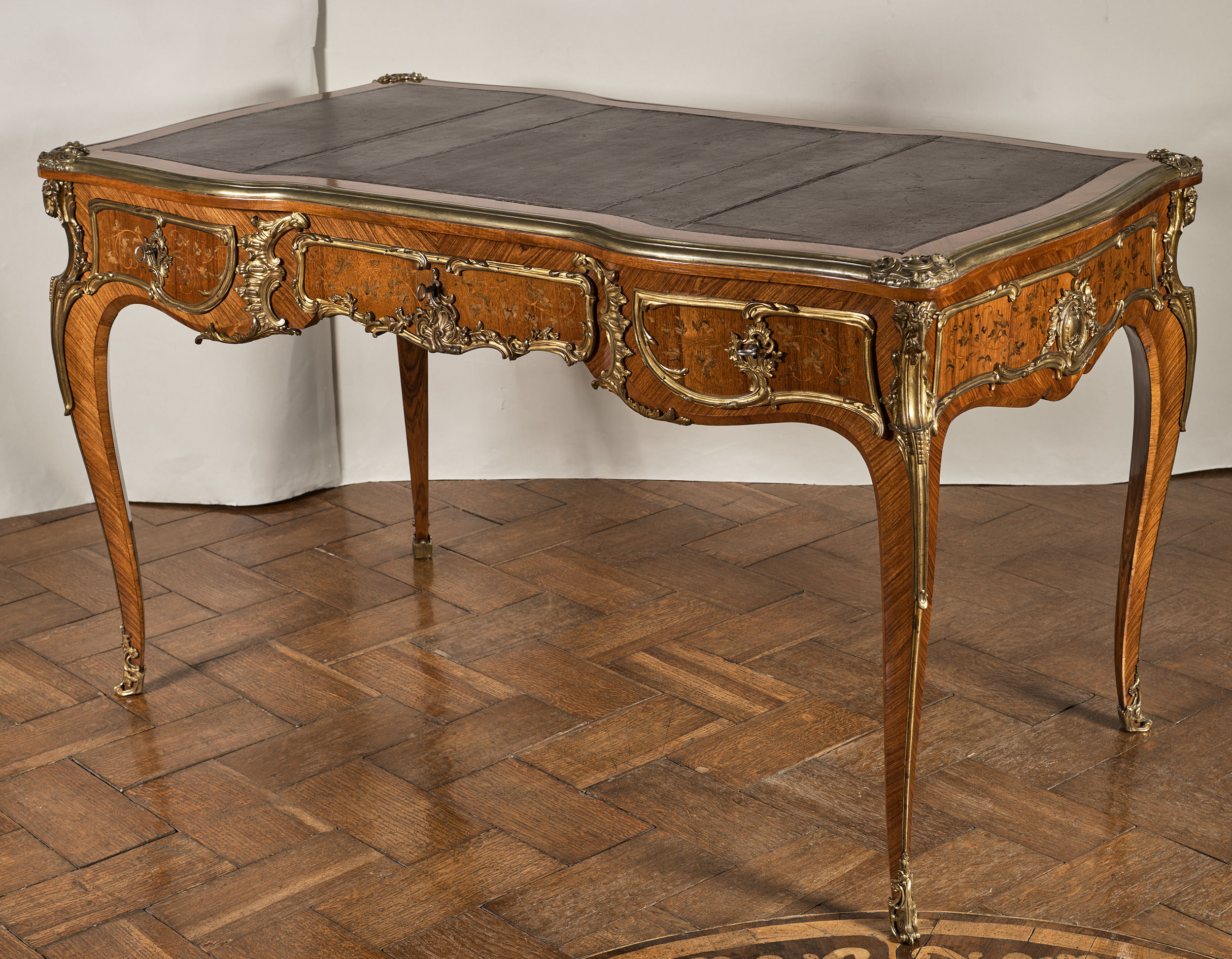 Prezentowane biurko zostało zakupione do zmodernizowanych przed pierwszą wojną światową wnętrz łańcuckiej rezydencji w czasach Elżbiety i Romana. Neorokokowy mebel, oklejony fornirem z drewna „królewskiego” (tropikalna afelia, zwana z francuska „doussie”), ozdobiony wzorzystą intarsją i odlewami z brązu, wykonała znana wiedeńska firma Portois & Fix założona w 1881 r. Wspólnicy poznali się prawdopodobnie w 1873 r. na Wystawie Powszechnej w Wiedniu. August Portois, Francuz z pochodzenia, był doświadczonym w handlu meblami dekoratorem wnętrz, który zapoczątkował w Wiedniu filię paryskiego towarzystwa handlowego „Societé Commerciale de Paris”. Portois realizował zamówienia dla przedstawicieli rodziny cesarskiej. Anton Fix pochodził z wielopokoleniowej rodziny wiedeńskich tapicerów dekoratorów. W 1872 r. przejął po ojcu warsztat. Bazując na zapleczu warsztatowym rodziny Fix spółka Portois & Fix rozpoczęła produkcję jakościowych mebli na potrzeby kompleksowego wyposażenia wnętrz, zyskując znaczną popularność w latach 90 XIX w. Przed 1900 r. produkcja nastawiona była na estetykę modnych wówczas stylów historycznych. Ze szczególnym upodobaniem naśladowano francuską modę minionych epok. Biurko typu „bureau plat” wykonano w stylu Ludwika XV.