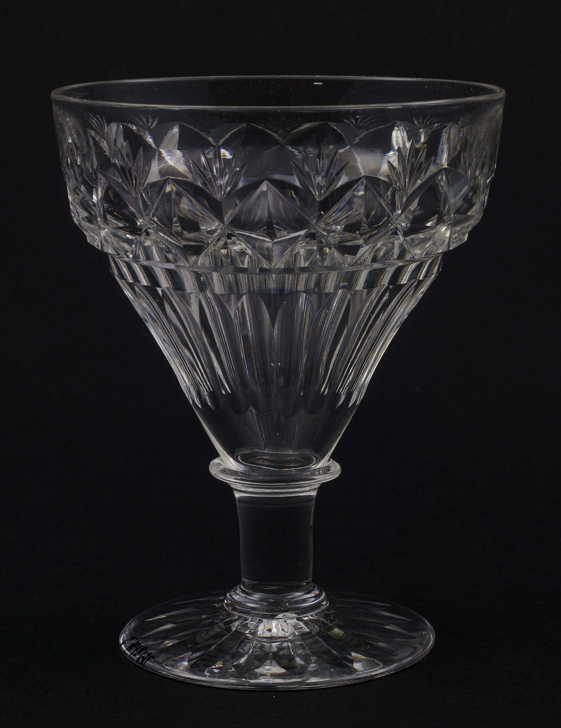 Kieliszek duży, wykonano ze szkła kryształowego. W zbiorach łańcuckich znajduje się także jeszcze pięć takich kieliszków. Zostały wykonane na przełomie XIX-XX wieku w Anglii, w stylu secesyjnym.