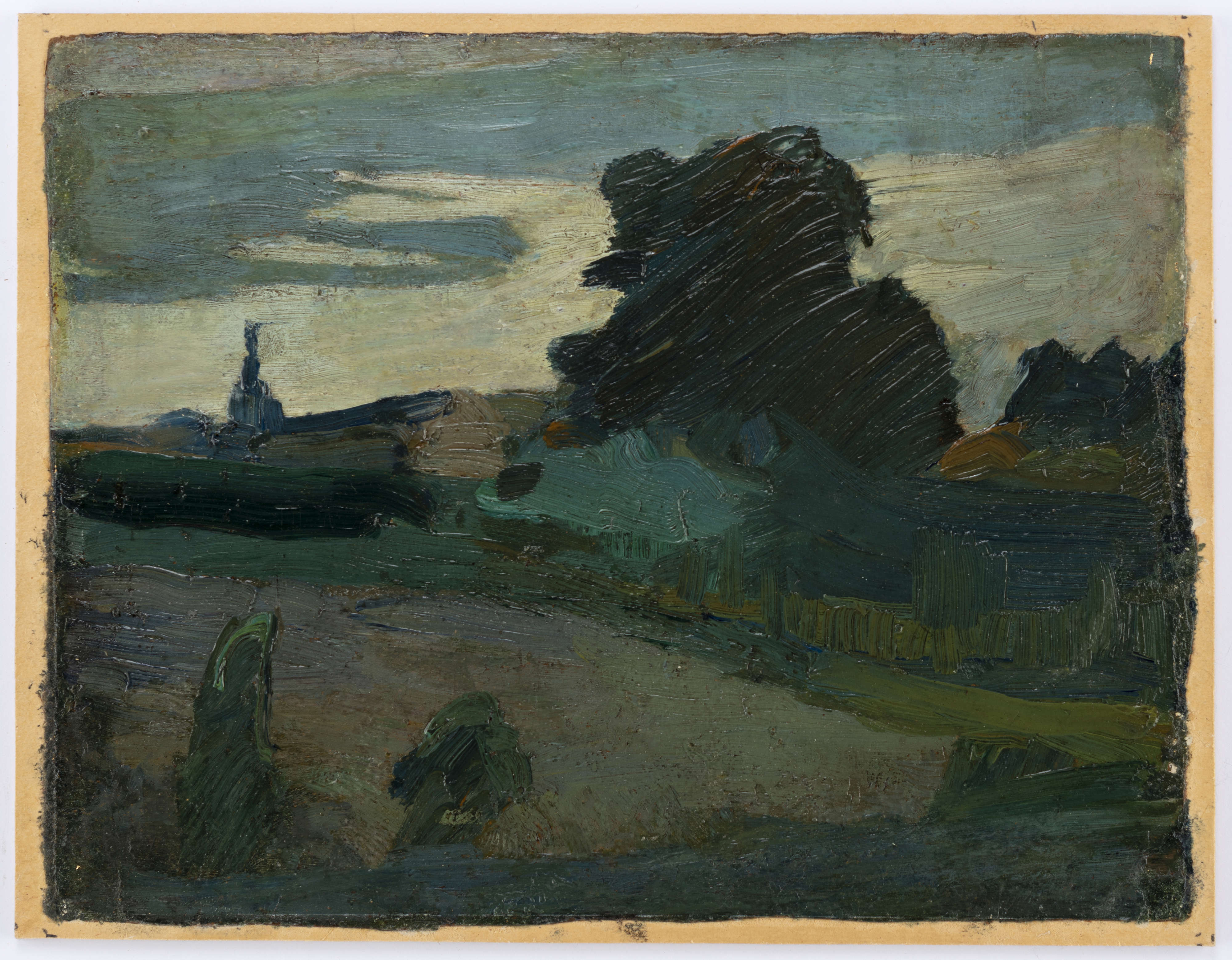 Wizualność krajobrazu tworzą zwarte, mocno wyodrębnione nieregularne formy – ciemne gęste plamy farby w dolnej i jaśniejsze, swobodniej nakładane w górnej części obrazu – oddzielone giętką linią stanowiącą horyzont. W wyobrażenie wkomponowane są masywne, rożnej wielkości sylwety, określone ciemną gęsto nakładaną farbą. Obraz zatem stanowi surowe wyobrażenie, odnoszące się do elementarnego, pierwotnego odczucia natury – horyzontu oddzielającego ziemię od nieba, ciemnych, gęstych brył drzew i krzewów, zgaszonych ugrów gliny i intensywnie zieleniejącej trawy. Operując zróżnicowanym walorem koloru i fakturą – obraz ukazuje dystans i ciężar poszczególnych obiektów. Krajobraz, malowany pośpiesznie, żywiołowo i ekspresyjnie, uwydatnia sposób konstytuowania świata. Na tle twórczości artysty pokazuje postępujące uproszczenie i dezintegrację przedmiotu, sprowadzonego do materialności obrazu, farby, wydobywania wzajemnych relacji. Pokazuje zarazem odczucie natury ograniczonej do podstawowego wyobrażenia i nasyconej podmiotową obecnością. Odsłania obraz świata, który pojawia się w procesie tworzenia i rozpoznawania poszczególnych form jako wzajemnej wymienności gestu malarza, obserwowanego przedmiotu, widzenia – wymienności zawartej w subiektywnej obecności artysty w krajobrazie i cielesności widza obcującego z materią obrazu. Staje się zapisem ekspresyjnego gestu, unieważniającego realistyczne i przedmiotowe odtwarzanie natury.