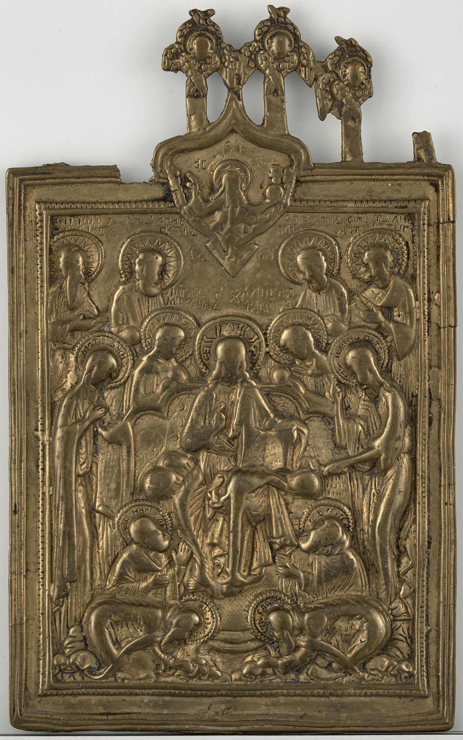 Termin Deesis, oznaczający z greckiego błaganie, prośbę, ukształtował się w oparciu o teksty liturgiczne, w których Kościół ucieka się do orędownictwa Bogurodzicy, Jana Chrzciciela, aniołów, apostołów, świętych. Od VI-VII w. znana jest na wschodzie obrazowa forma Deesis. Oprócz wariantu podstawowego (patrz S.12824MŁ) rozwinęła się Wielka Deesis, w której Chrystus tronujący w Mocach, z otwartą Ewangelią, występuje w otoczeniu Archaniołów, adorowany przez Bogurodzicę i Jana Chrzciciela, apostołów, proroków, męczenników, pustelników, mnichów, w układzie hierarchicznym. W formie odlewanych metalowych ikon przedstawienia Deesis upowszechnili prześladowani w Rosji staroobrzędowcy, którzy sprzeciwiali się wprowadzonej w połowie XVII w. reformie liturgicznej. W środowisku staroobrzędowców, a także wśród wiernych moskiewskiego prawosławia, wizerunki kilkuosobowej Deesis nazywano popularnie „siedmicą”, oznaczającą w istocie siedem dni tygodnia. W życiu chrześcijanina najważniejszym jest tydzień upamiętnienia Męki Pańskiej zwany Wielkim. Z każdym dniem tygodnia roku liturgicznego wiąże się wspomnienie świętego, świętych lub wydarzenia. W ciągu tygodnia każdy dzień służy upamiętnieniu: pierwszy – niedziela jest wspomnieniem Zmartwychwstania, poniedziałek – poświęcony Siłom Niebiańskim, wtorek – dzień Jana Chrzciciela, środa – Bogurodzicy, czwartek – Apostołów i św. Mikołaja Cudotwórcy, piątek – Ukrzyżowania Chrystusa, sobota – wszystkich świętych. Ikony Wielkiej Deesis, ze względu na występujące na nich postacie, utożsamiono z poszczególnymi dniami tygodnia oraz siódmym dniem, w którym Moce Niebiańskie w osobach Archaniołów Michała i Gabriela, z Bogurodzicą i Janem Chrzcicielem oraz innymi świętymi adorują Chrystusa. W prezentowanej ikonie oprócz już wymienionych występują Apostołowie Piotr i Paweł, Jan Ewangelista i Jan Złotousty, klęczą św. Mikołaj i Sergiusz z Radoneża oraz Zozym i Sawacjusz Sołowieccy.