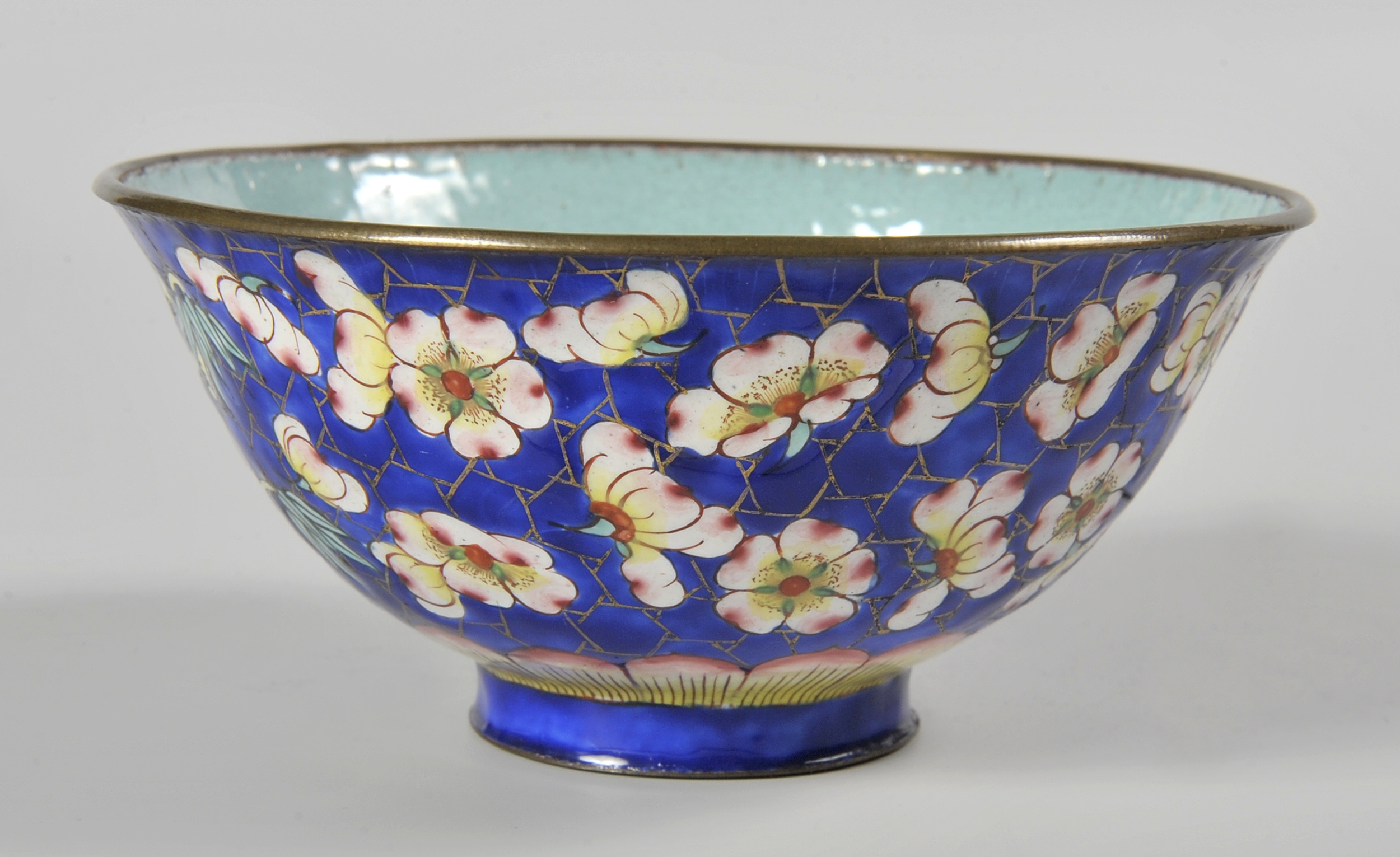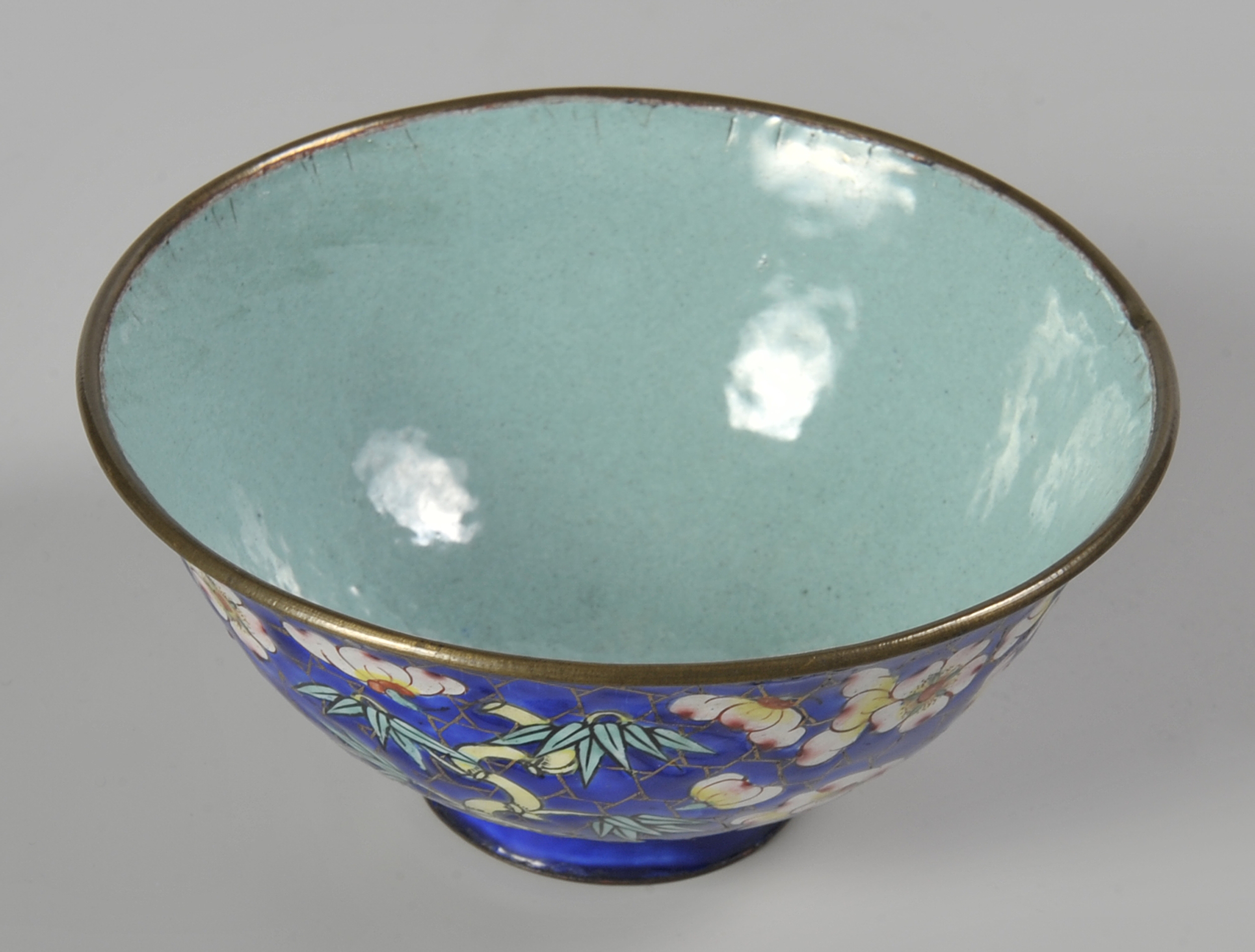 Czarka wykonana w technice emalii na miedzi. Okrągła, rozszerzająca się ku górze, na krótkiej, cylindrycznej stopce. Całą zewnętrzną powierzchnię czarki pokrywa emalia w głębokim kobaltowym kolorze. Zdobią ją gęsto rozmieszczone białoróżowe kwiaty śliwy i gdzieniegdzie zielone gałązki bambusa na tle złotego wzoru przypominającego spękany lód. Powyżej stopki kielich czarki ujęty stylizowanym wzorem z pojedynczych płatków śliwy. Wnętrze naczynia pokryto emalią o barwie turkusowej.