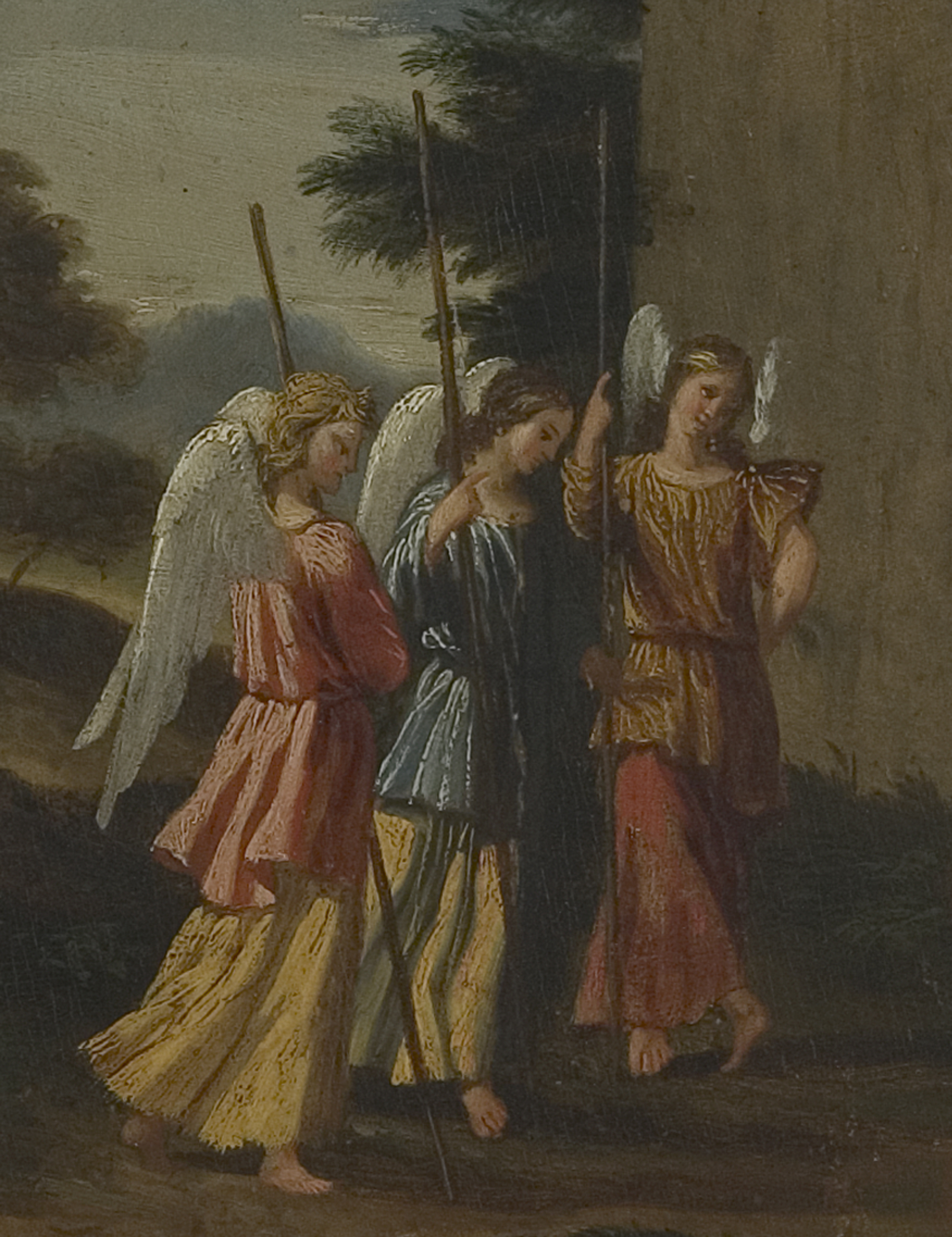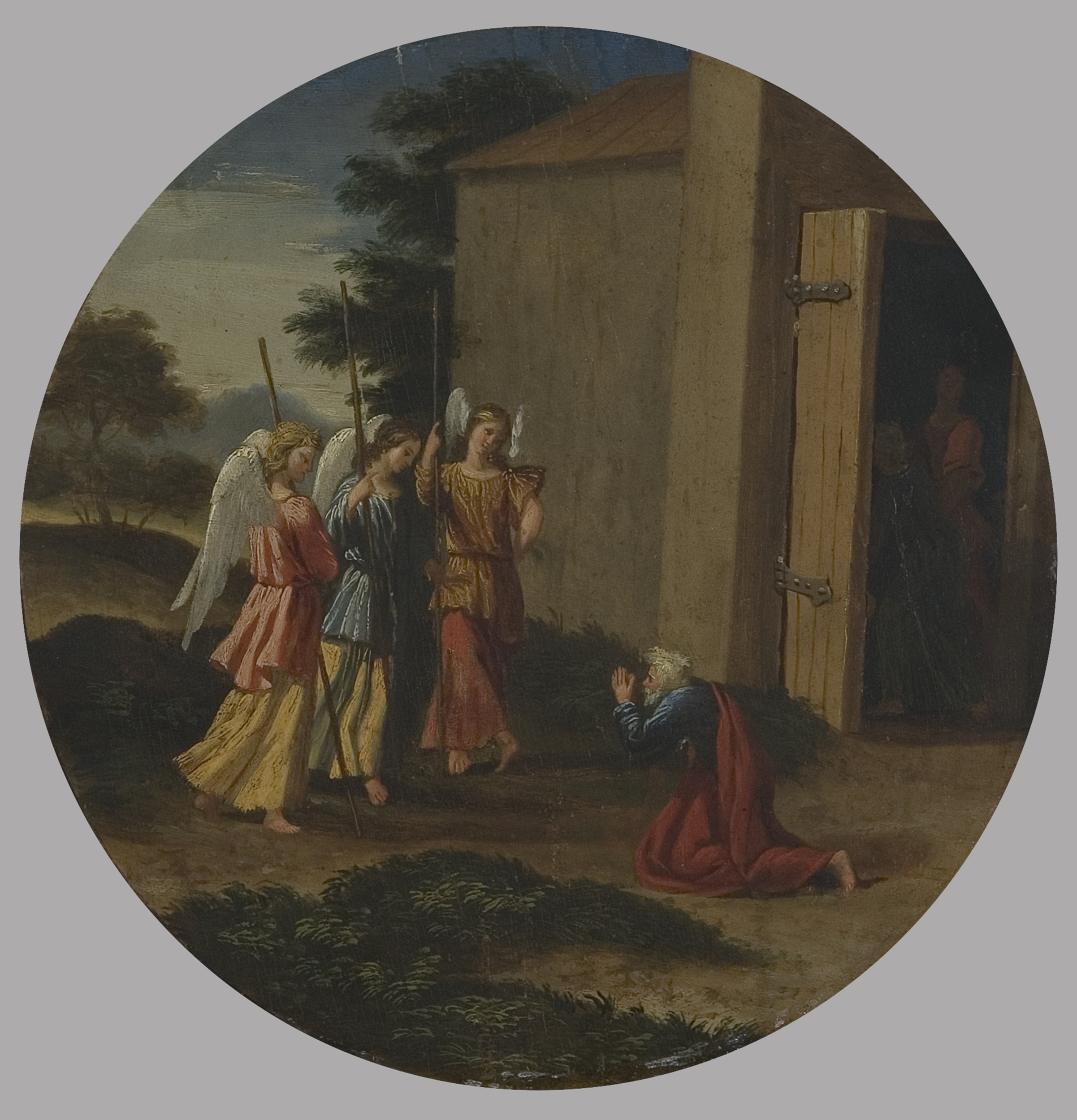 Niewielkie tondo z przedstawieniem gościnności Abrahama (Rdz 18, 1-15) jest najprawdopodobniej nabytkiem Stanisława Kostki Potockiego, o czym świadczy nalepka z pieczęcią hrabiego (l. 1818-1821) i napis odręczny „Abraham visite par le Anges du Dominichin”. Obraz ukazuje patriarchę w doniosłym momencie życia, gdy trzej uskrzydleni wysłannicy Boga zwiastują mu narodziny upragnionego potomka. Abraham klęczy przed nimi, złożywszy ręce do modlitwy, w pobliskich zabudowaniach przez uchylone drzwi majaczy postać Sary, która na wieść o możliwości powicia syna w tak podeszłym wieku zareagowała śmiechem. W tle idealizowany pejzaż.