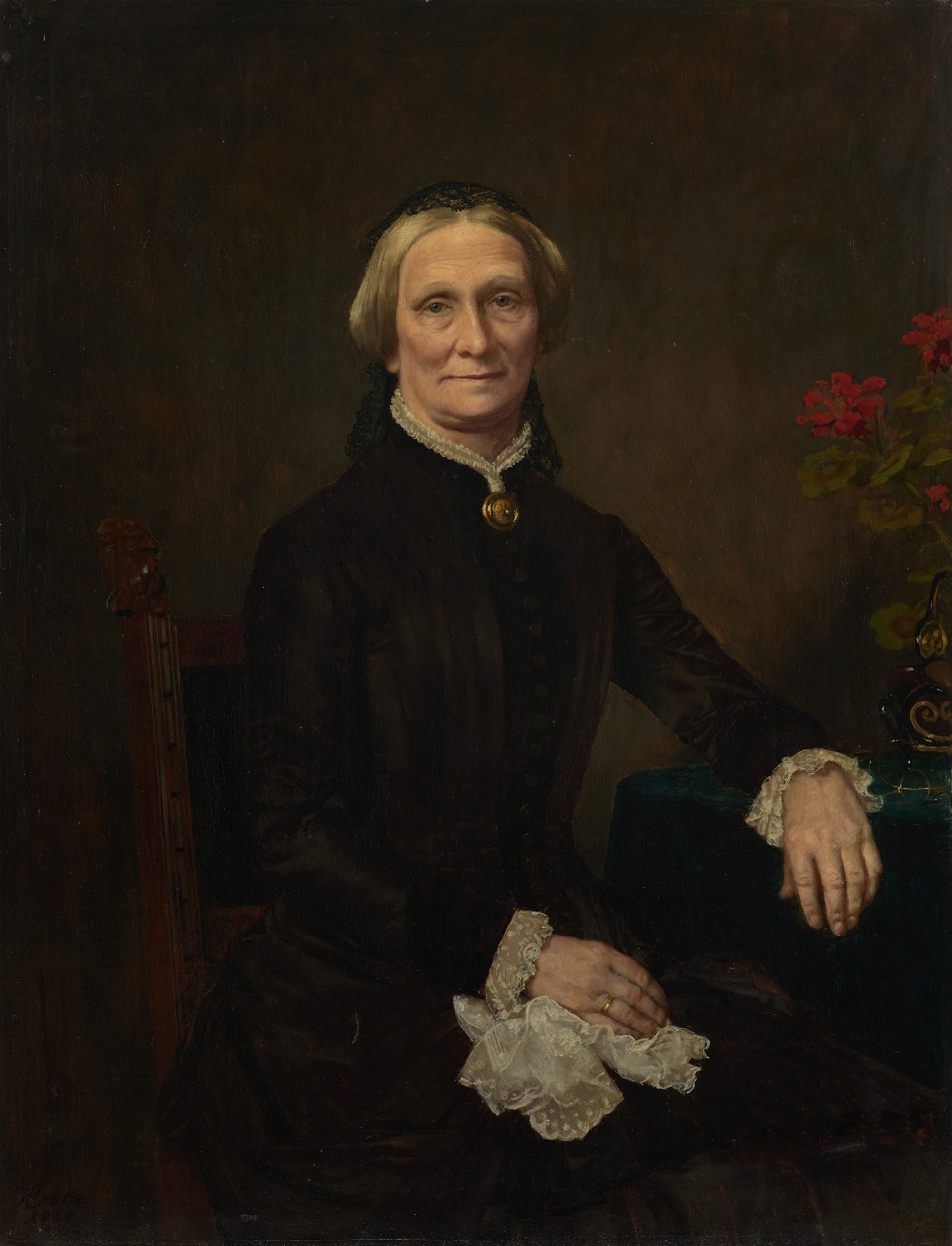 Portret przedstawia starszą kobietę o subtelnych rysach i wyrazistym, pełnym łagodności spojrzeniu, ukazaną na jednolitym, ciemnym szarozielonkawym tle, siedzącą na krześle przy niewielkim stoliku. Postać ubrana jest w ciemną suknię w tonie głębokiego fioletu, wykończoną małą krezą przy kołnierzu i białymi koronkowymi mankietami. Głowę kobiety zdobi niewielki, czarny koronkowy czepek. Widoczny po prawej stronie stół z leżącymi nań okularami oraz wazonem z czerwonymi pelargoniami dyskretnie podkreśla intymny charakter przedstawienia, budując nastrój zacisza domowego.