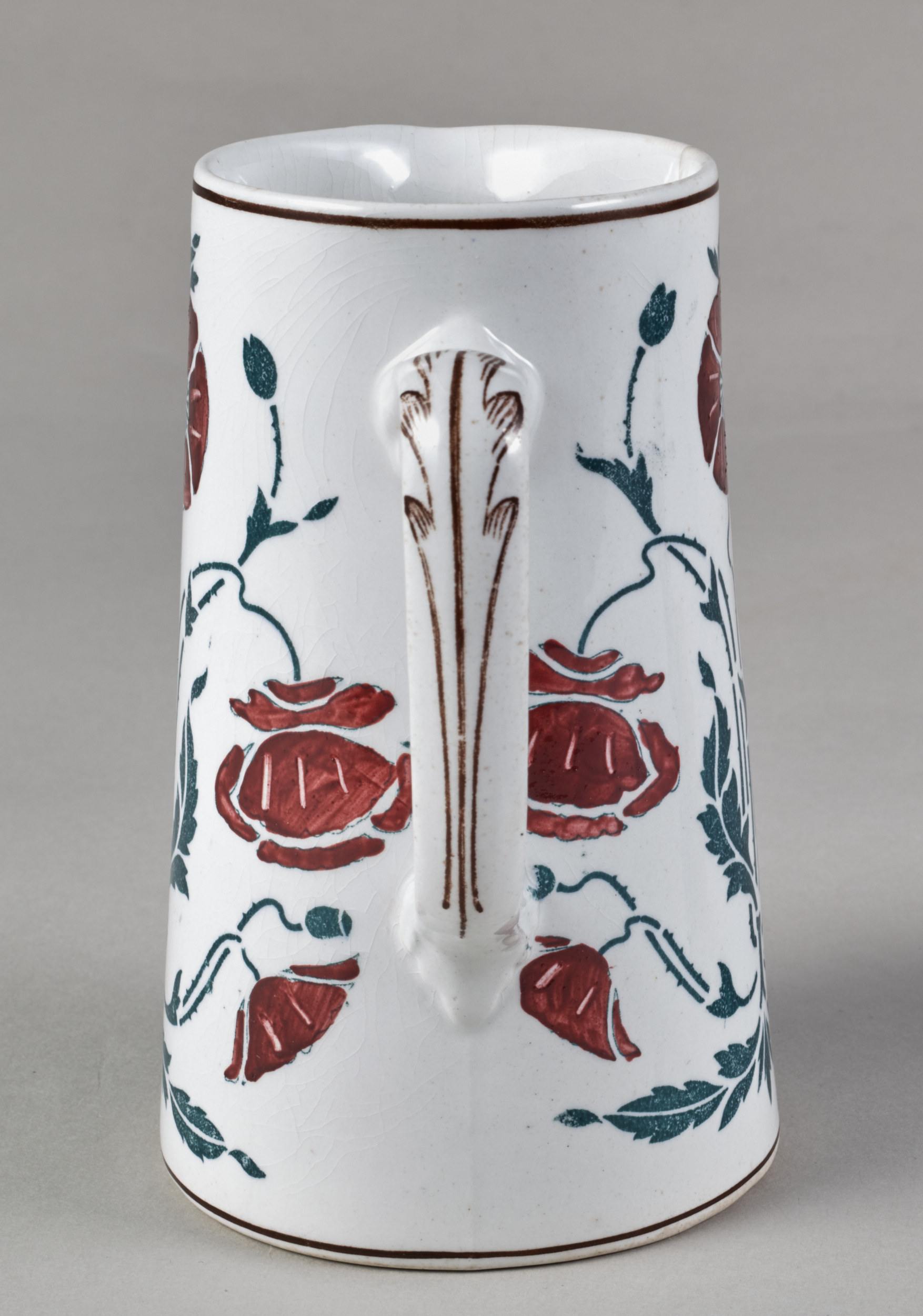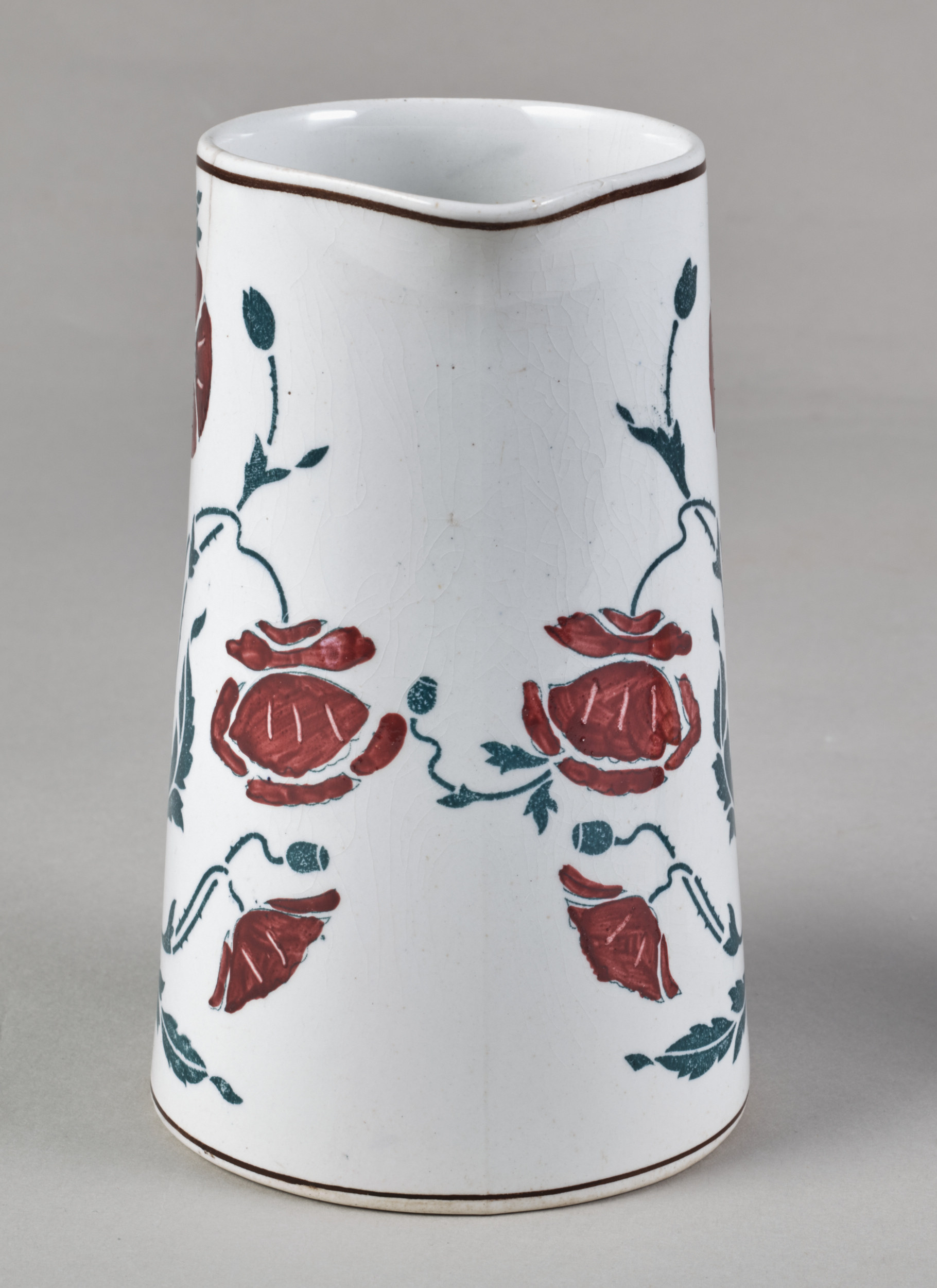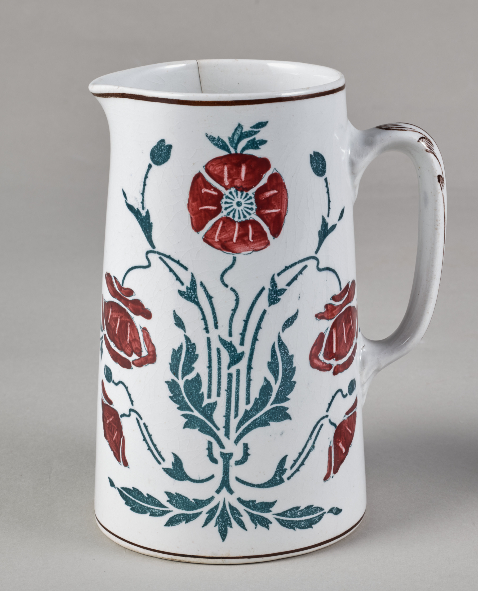Dzbanek - nieduży, fajansowy dzbanek w kształcie zwężającego się ku górze cylindra, z płytko wywiniętym wylewem. Na osi wylewu ustawione ucho, które przypomina nieco spłaszczona literę „C”. Po obydwu stronach płaszcza występuje jedna i ta sama kompozycja dwubarwna, przedstawiająca umowny, symetryczny bukiet maków, rozciągający się niemal na całej wysokości naczynia. Składa się on z 5 kwiatów, stylizowanych w duchu umiarkowanej secesji. Kwiaty ułożone w trzech poziomach, z tym że najwyższy, wieńczący łodygę osiową, jest nieparzysty i wyobrażony centralnie, podczas gdy pozostałe cztery maki, stanowiące dwie pary, przedstawione są w profilu bocznym. Na kompozycję składa się jeszcze para „ślepych” pąków na długich łodygach, które wraz z kwiatem centralnym wieńczą bukiet. Dołem wokół stopy i górą wokół brzegu przebiega brązowa obwódka. Grzbiet ucha zdobi długi, wyziębiony liść w kolorze brązowym, naniesiony przez szablon. Na odwrociu stopy występują dwa zielone maki w pieczętnym nadruku. Jeden to sygnatura firmy przedstawiająca kotwicę w owalu, pod nią napis: S. B. i S / ENGLAND”. Druga to sygnatura magazynu londyńskiego: „SOUTH AUDLEY ST./T GOODE CO/ LONDON. W. Obok ręcznie naniesiony bordową farbą znak malarza w postaci cyfry „2”.