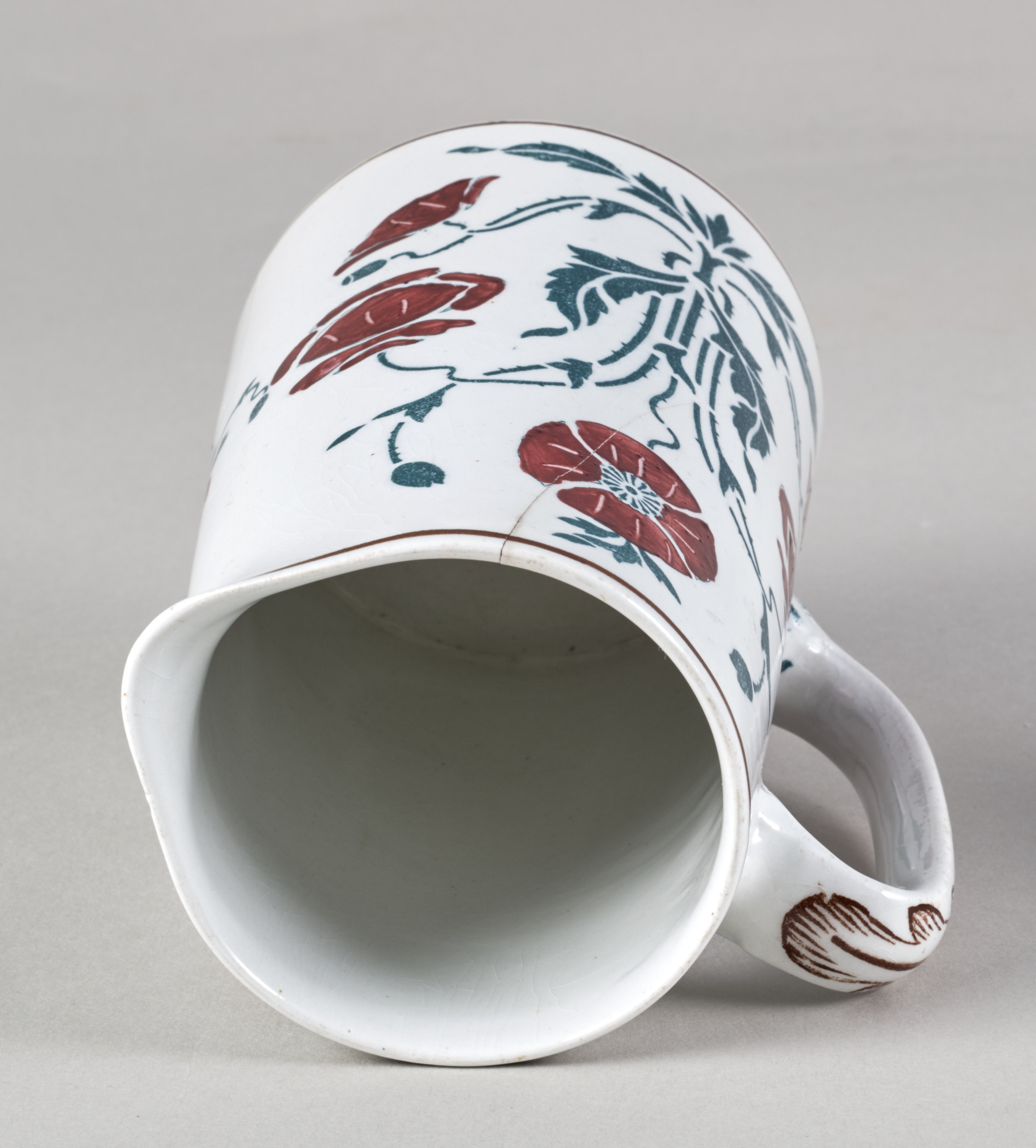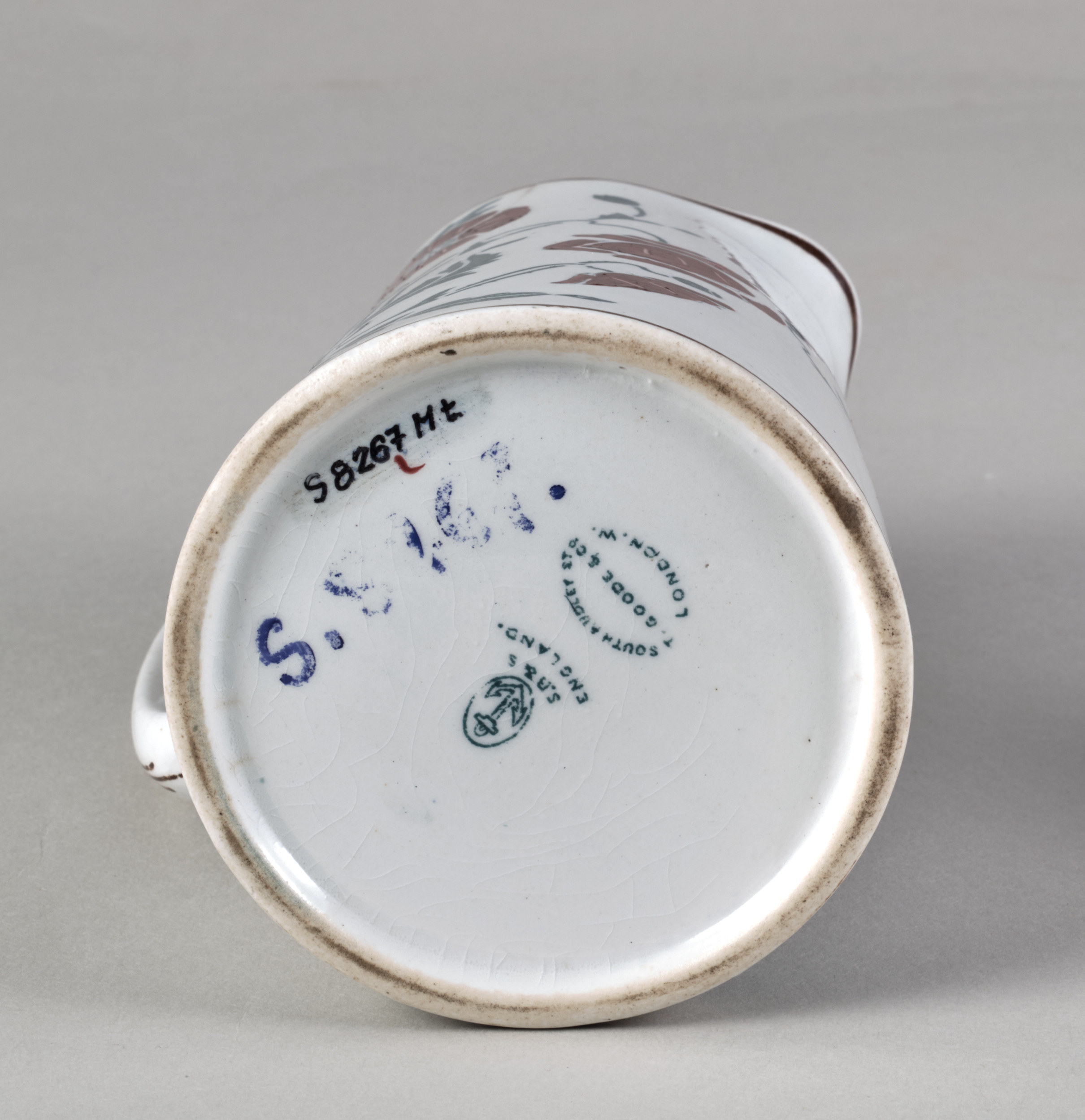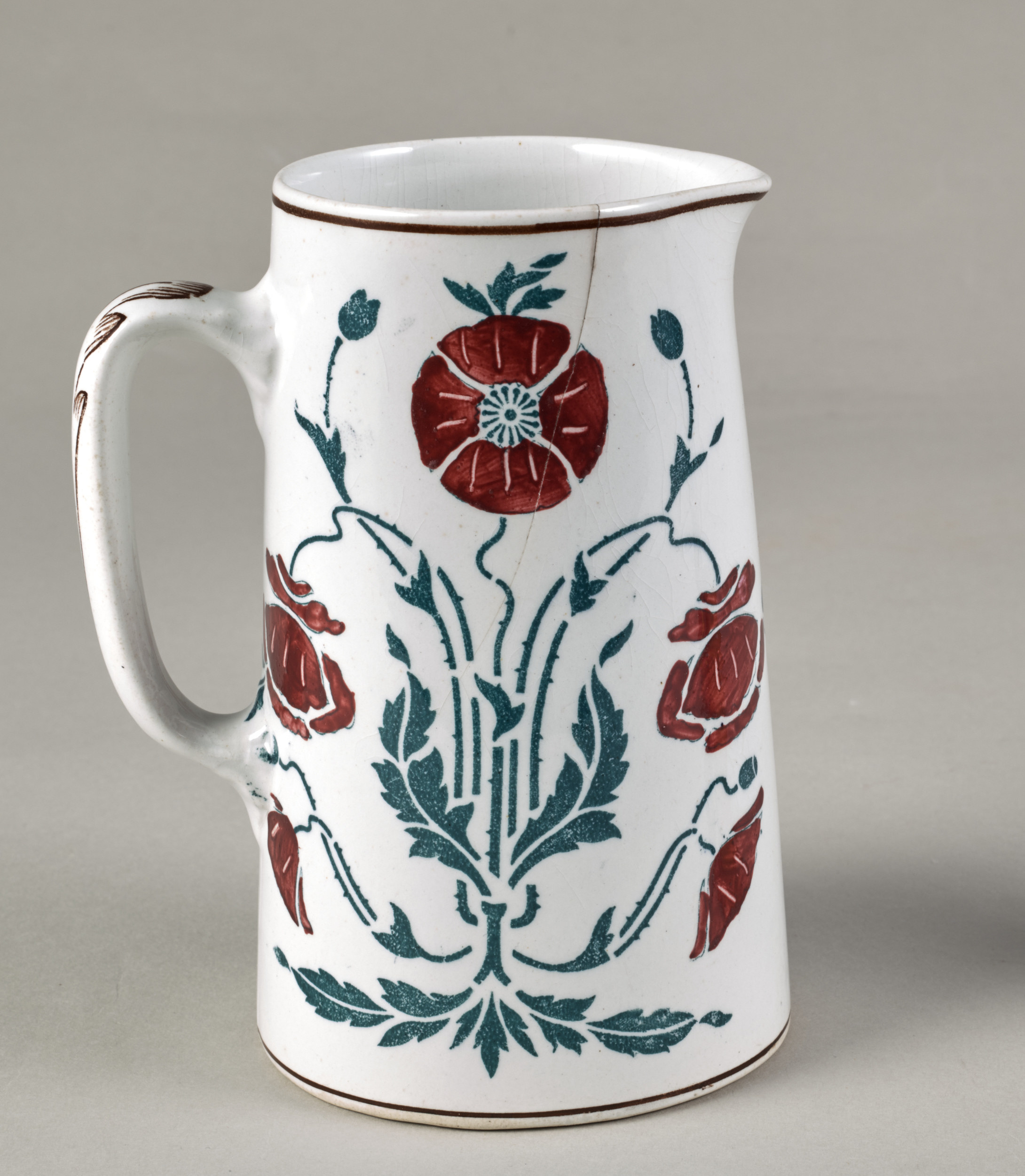 Dzbanek - nieduży, fajansowy dzbanek w kształcie zwężającego się ku górze cylindra, z płytko wywiniętym wylewem. Na osi wylewu ustawione ucho, które przypomina nieco spłaszczona literę „C”. Po obydwu stronach płaszcza występuje jedna i ta sama kompozycja dwubarwna, przedstawiająca umowny, symetryczny bukiet maków, rozciągający się niemal na całej wysokości naczynia. Składa się on z 5 kwiatów, stylizowanych w duchu umiarkowanej secesji. Kwiaty ułożone w trzech poziomach, z tym że najwyższy, wieńczący łodygę osiową, jest nieparzysty i wyobrażony centralnie, podczas gdy pozostałe cztery maki, stanowiące dwie pary, przedstawione są w profilu bocznym. Na kompozycję składa się jeszcze para „ślepych” pąków na długich łodygach, które wraz z kwiatem centralnym wieńczą bukiet. Dołem wokół stopy i górą wokół brzegu przebiega brązowa obwódka. Grzbiet ucha zdobi długi, wyziębiony liść w kolorze brązowym, naniesiony przez szablon. Na odwrociu stopy występują dwa zielone maki w pieczętnym nadruku. Jeden to sygnatura firmy przedstawiająca kotwicę w owalu, pod nią napis: S. B. i S / ENGLAND”. Druga to sygnatura magazynu londyńskiego: „SOUTH AUDLEY ST./T GOODE CO/ LONDON. W. Obok ręcznie naniesiony bordową farbą znak malarza w postaci cyfry „2”.