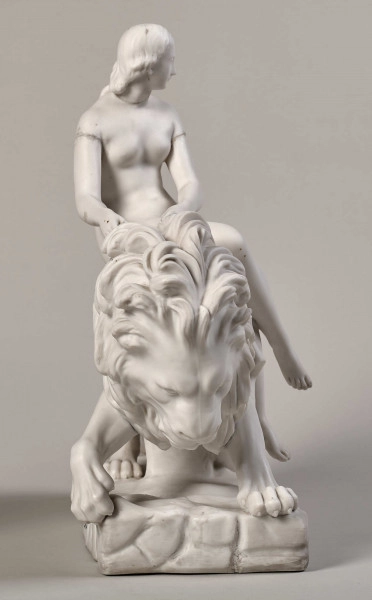 Figurka młodej, nagiej kobiety siedzącej na lwie. Wykonana została z parianu. Jest to odmiana biskwitu porcelanowego o kremowobiałej barwie, przypominająca wyglądem marmur paryjski. Parian rozpowszechniony został w Anglii, w latach czterdziestych XIXw. Stosowano go głównie w plastyce figuralnej. Z wyrobu figurek z parianu słynęła wytwórnia ceramiki Minton w Stoke-on-Trent. Figurka kobiety siedzącej na lwie wykonana została według modelu Johna Bella (1811 – 1895), angielskiego rzeźbiarza tworzącego w klasycystycznym stylu, pracującego dla firmy Minton.