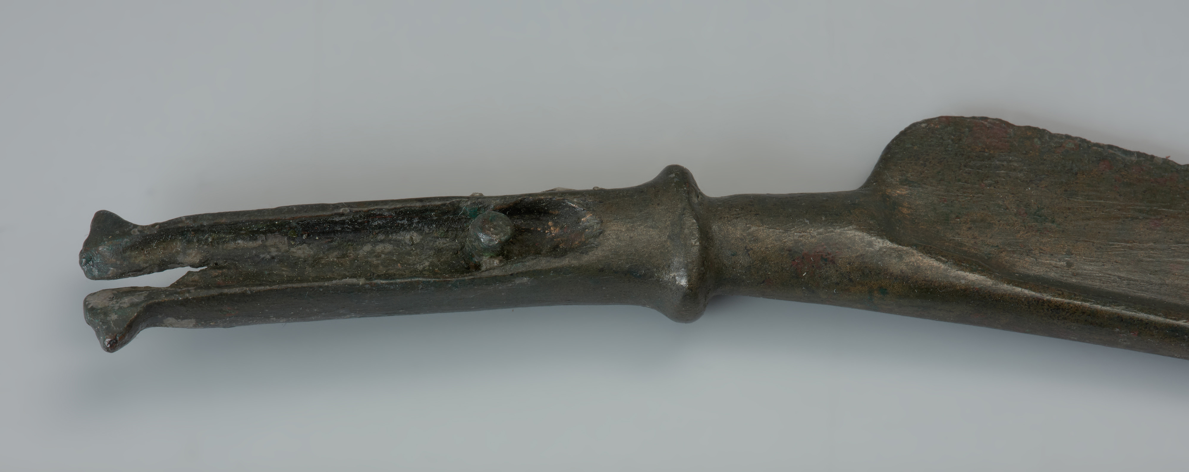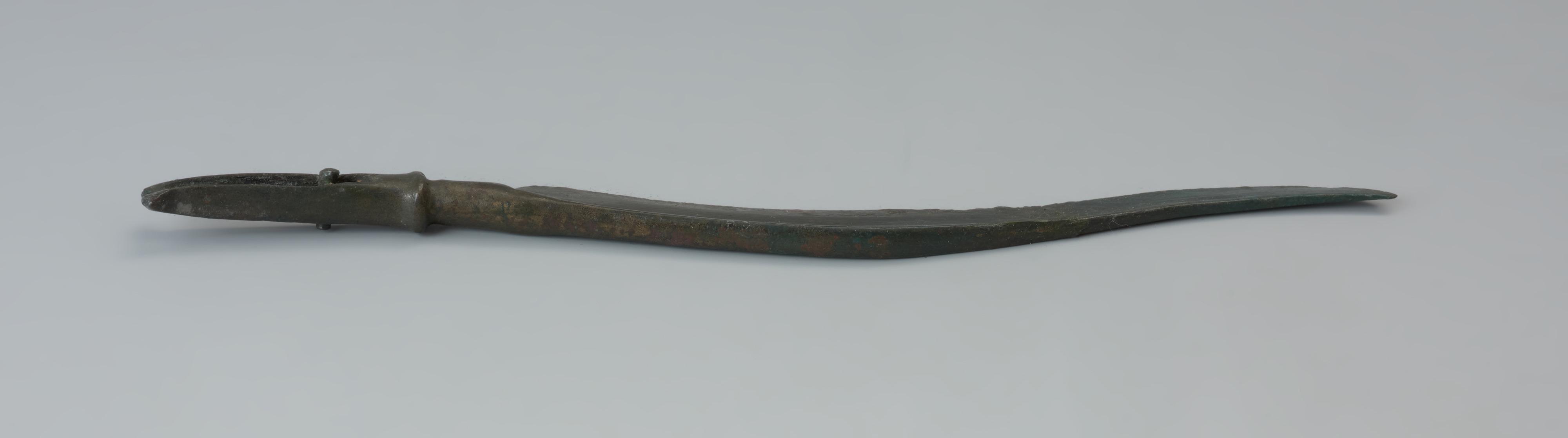 Jest to długi, smukły nóż z efektownie wygiętym ostrzem, zaopatrzony w wąską sztabę do rękojeści, w której zachował się jeden niewielki nit. Przy pomocy takich niewielkich brązowych „kołeczków” do uchwytu przytwierdzona była okładzina, wykonana najpewniej z poroża lub drewna. Nóż pochodzi z grobu kurhanowego odkrytego na początku grudnia 1935 roku w trakcie prac ziemnych w ogrodzie pana Bose. Z powodu silnych mrozów badania wykopaliskowe pod kierunkiem szczecińskiego archeologa Hansa Jürgena Eggersa podjęto dopiero wiosną 1936 roku. W ich wyniku odsłonięte zostały pozostałości prostokątnego bruku kamiennego o wymiarach 3 × 4 m, na którym znajdowały się przepalone szczątki kości ludzkich i dary grobowe – łącznie 62 przedmioty, w tym cztery naczynia gliniane oraz różne wyroby z brązu (m.in. kolia z paciorków, naszyjniki obręczowe, bransolety, szpile, zapinka, noże, szczypczyki, brzytwa, guziki, kółka). Całość przykrywała warstwa kamieni tworząca nasyp. Cały zespół trafił do zbiorów Muzeum Krajowego w Szczecinie (Pommersches Landesmuseum in Stettin), gdzie pozostał do momentu ewakuacji w głąb Niemiec pod koniec drugiej wojny światowej. Obecnie, od 2009 roku, wszystkie zabytki znajdują się w Muzeum Narodowym w Szczecinie. Kurhan z Bań, datowany na 2. połowę IV okresu epoki brązu (lata ok. 1000–900 BC), jest jedynym tego typu znaleziskiem archeologicznym z młodszej epoki brązu na Pomorzu. Z uwagi na bogactwo wyposażenia zyskał w literaturze naukowej miano grobu książęcego. Liczba i jakość darów wskazują, że pochowano w nim osobę o wysokiej randze społecznej. Zabytki brązowe wytworzone zostały w miejscowych pomorskich warsztatach metalurgicznych, ale wzorzec prezentowanego noża wywodzi się z odległej strefy zachodnioalpejskiej.