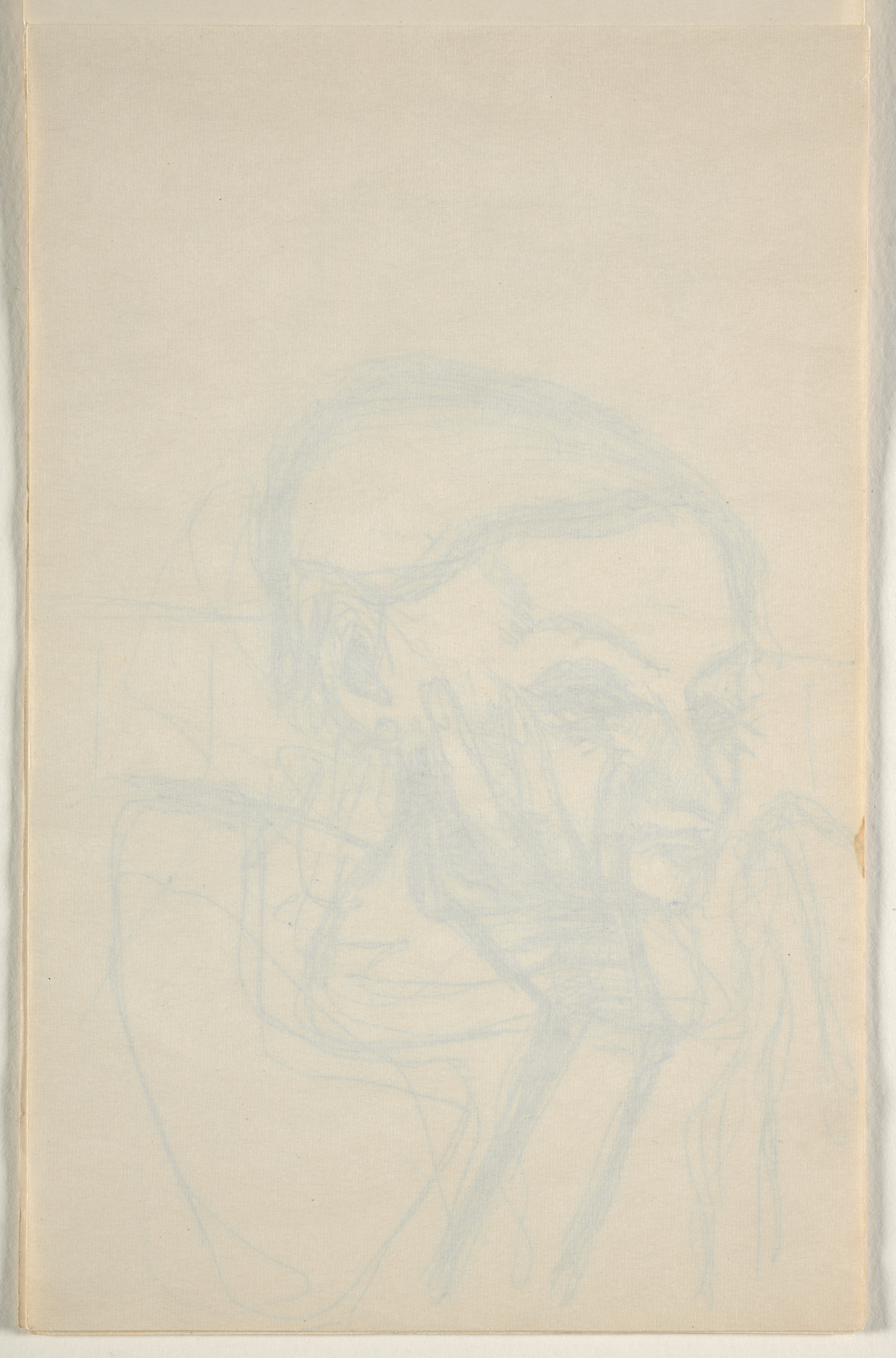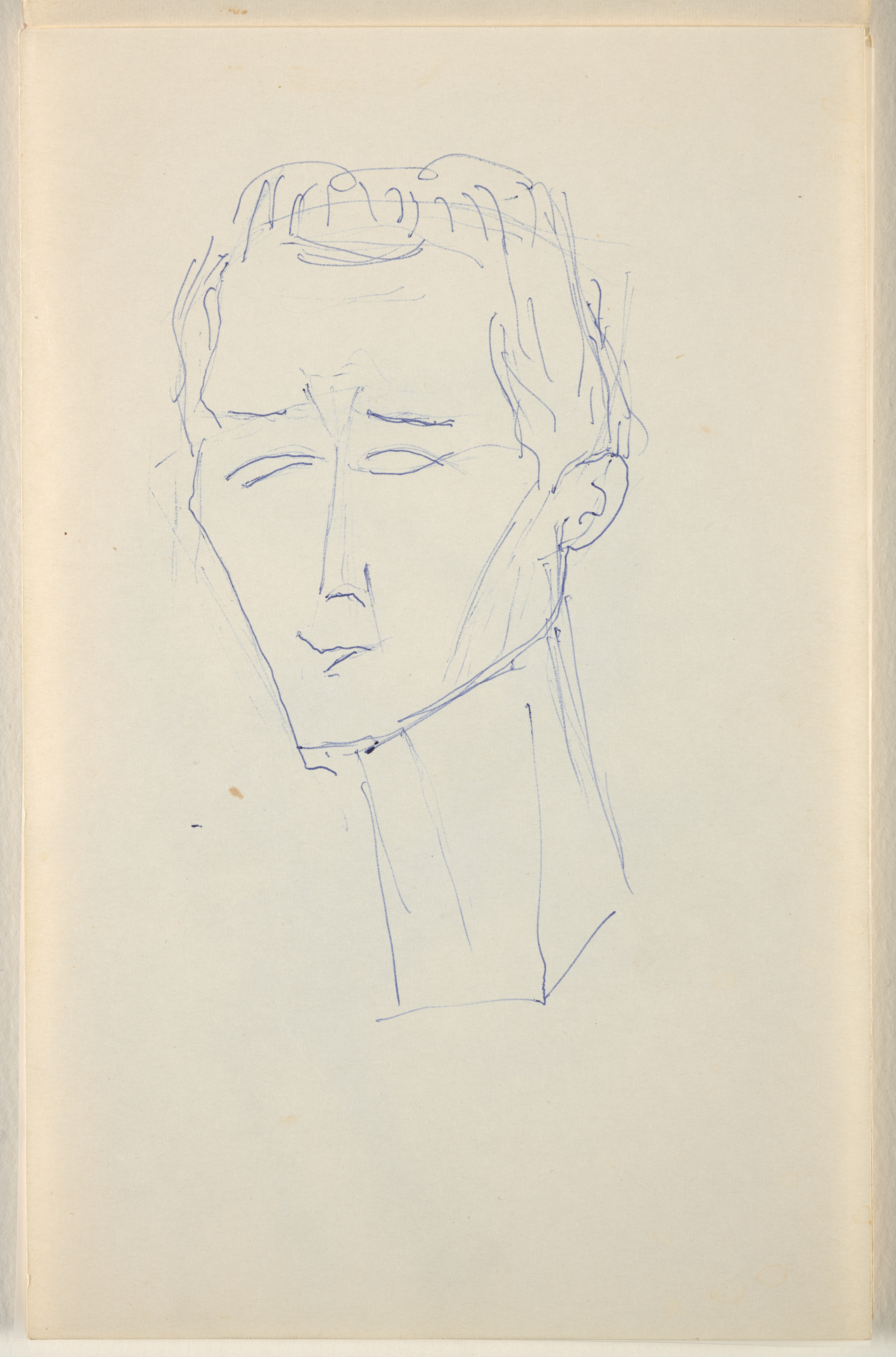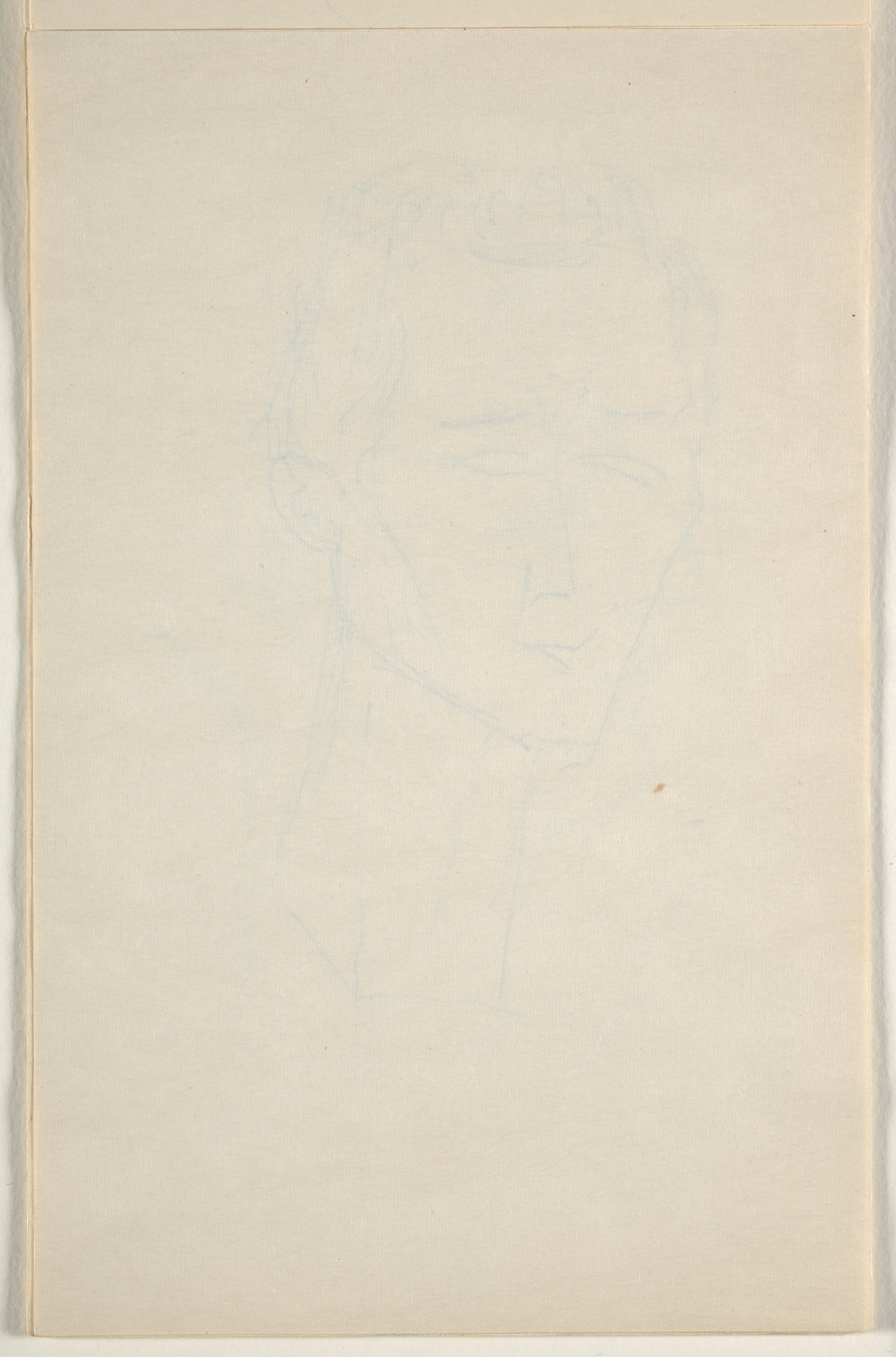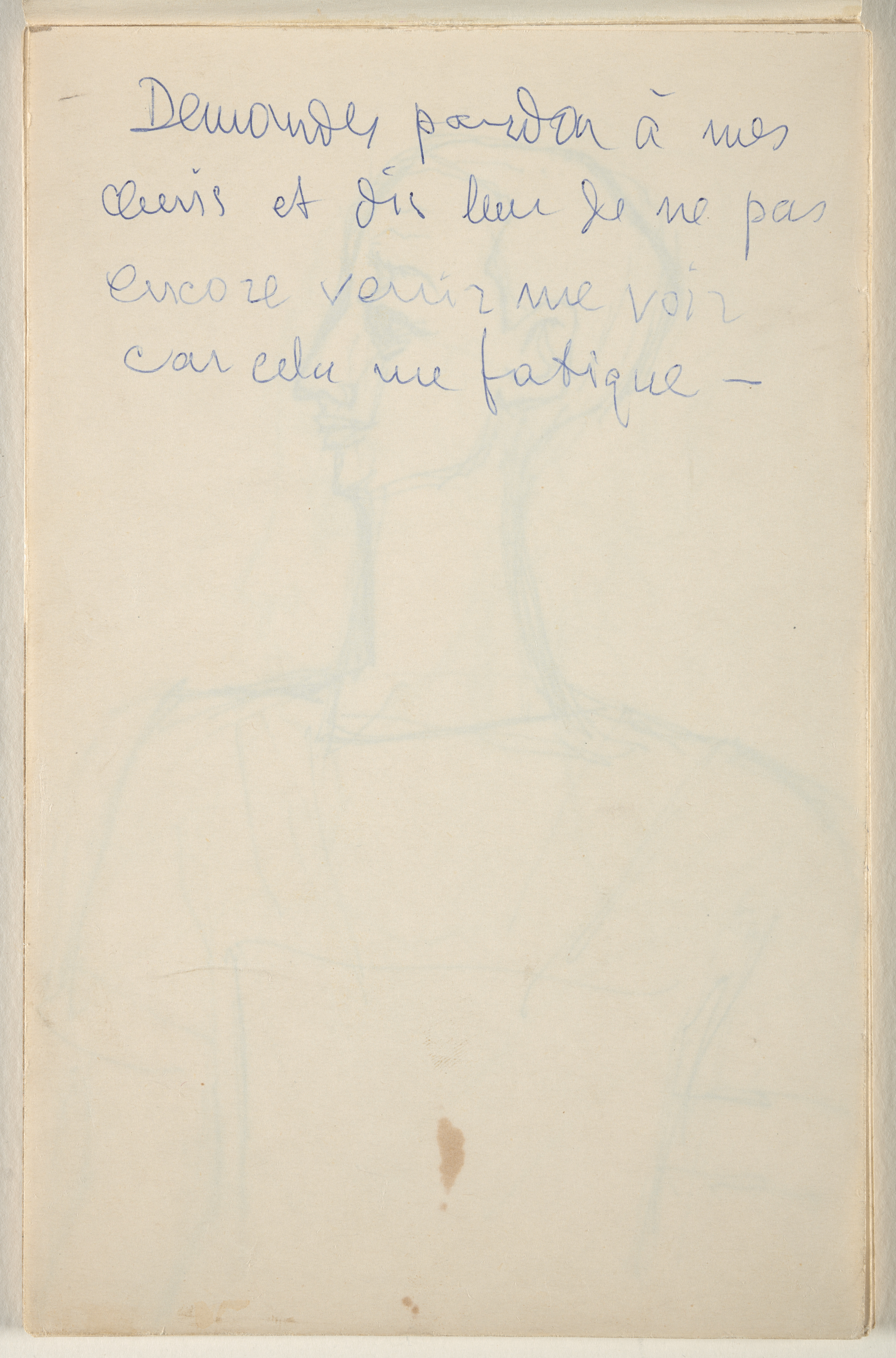 W środku na pojedynczych kartach znajdujemy 6 rysunków wykonanych niebieskim długopisem: autoportret artysty, portrety innych chorych, scenki ze szpitalnego dnia. I przejmującą prośbę słabnącego artysty, napisaną po francusku: „Demandez pardon à mes amis et dis eux de ne pas encore venir me voir car cela me fatigue” [Przeproście moich przyjaciół, ale niech nie przychodzą, ponieważ to mnie męczy].