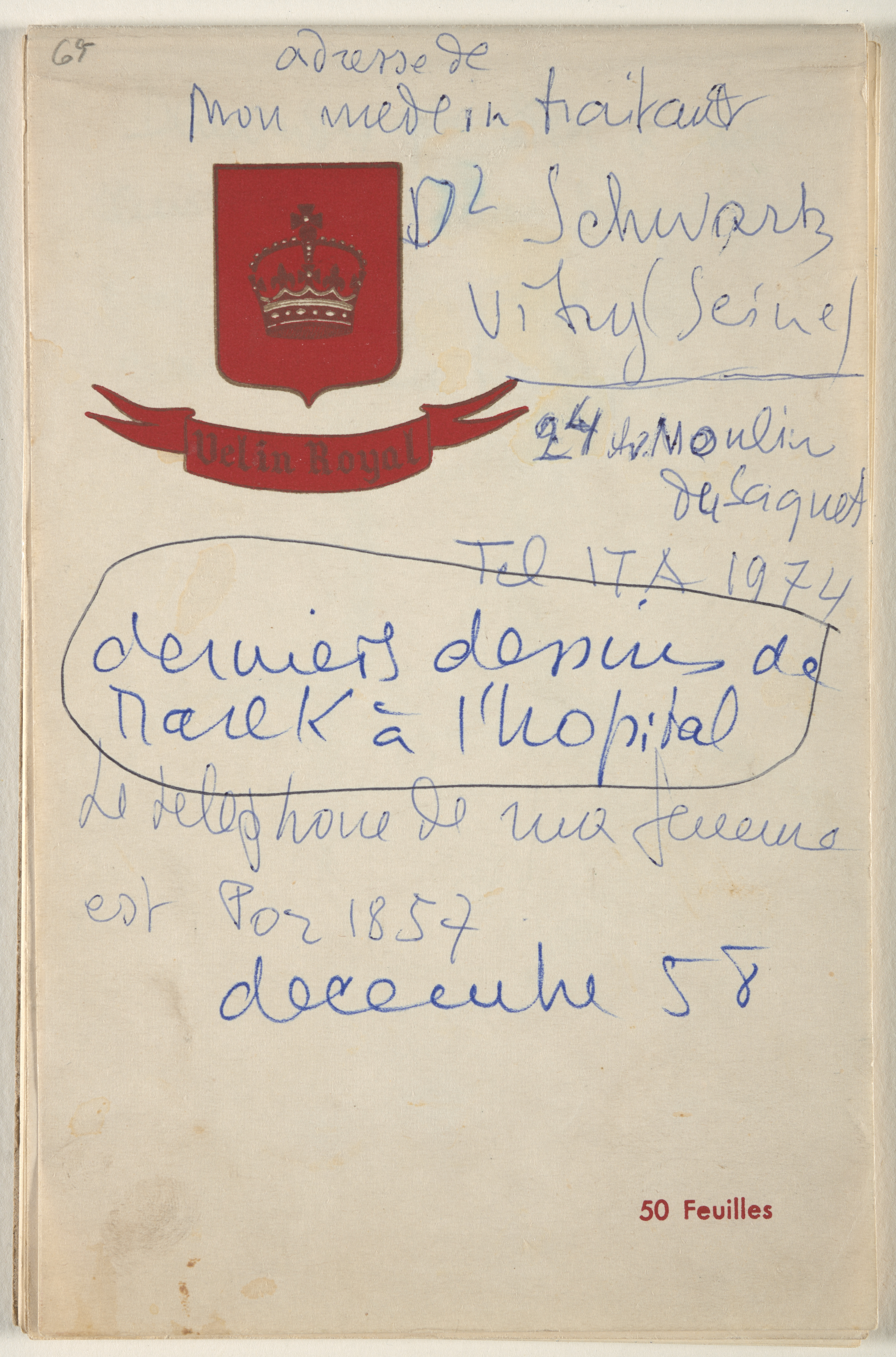 Ten zwyczajny notes zakupiony został zapewne przed pójściem Marka Szwarca do szpitala. Na okładce wypisano adresy i telefony: żony (Bulwar Arago 73) i lekarza, Alexandra Schwartza (bratanka artysty), później Gina Szwarc dopisała: „Dierniers dessins de Marek à l`hôpital / Decembre 58” [Ostatnie rysunki Marka w szpitalu, grudzień 58].