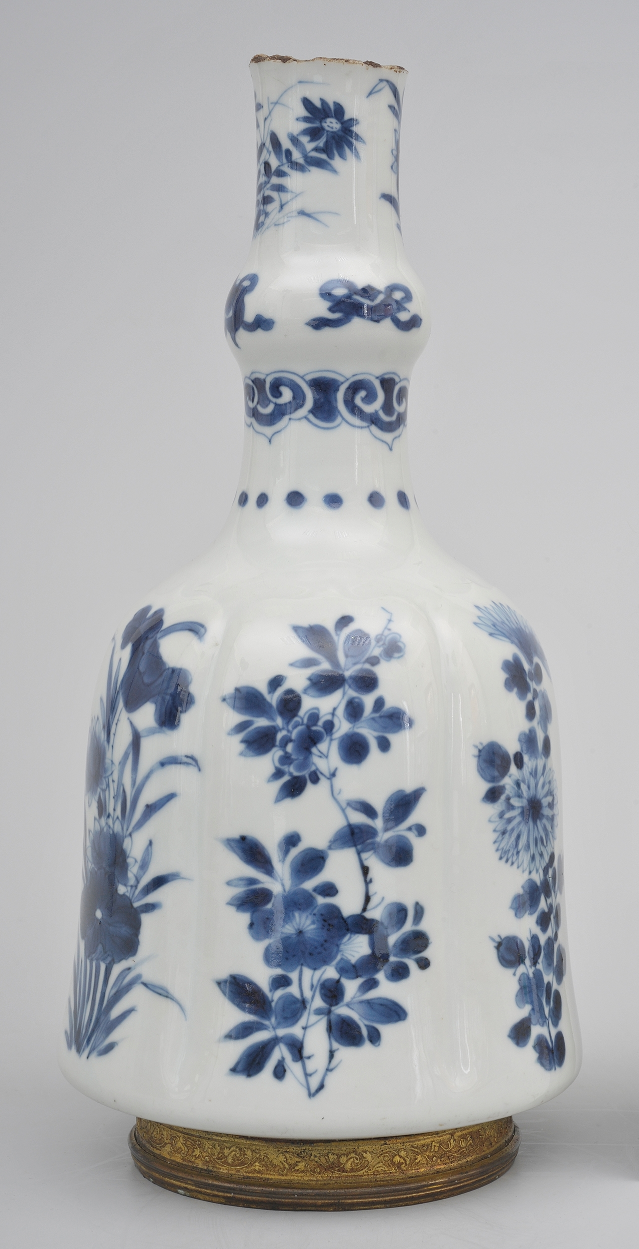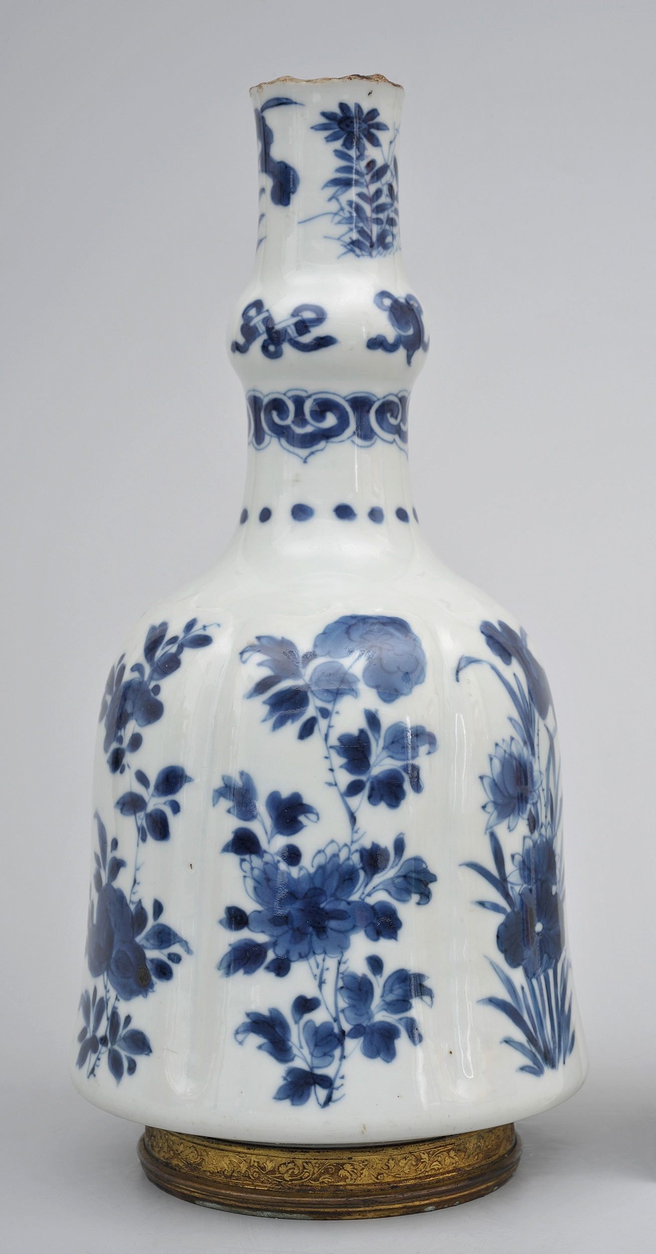 Porcelanowy wazon o dzwonowatym brzuścu, z wąską szyjką z pierścieniowatym wybrzuszeniem w połowie swej wysokości. Niska, okrągła stopka została opasana profilowanym pierścieniem z brązu. Brzusiec naczynia został podzielony na sześć analogicznych segmentów oddzielonych wąskimi wgłębieniami. Kobaltowa dekoracja odpowiada podziałom wazonu – każdą z płaszczyzn zdobi pionowa kompozycja kwiatowa. Szyjkę naczynia zdobią cztery ornamenty ciągłe o motywach kropek i powyżej główek chińskiego berła ruyi. Na wybrzuszeniu przedstawiono cztery symbole buddyjskie i powyżej niewielkie rzuty floralne.