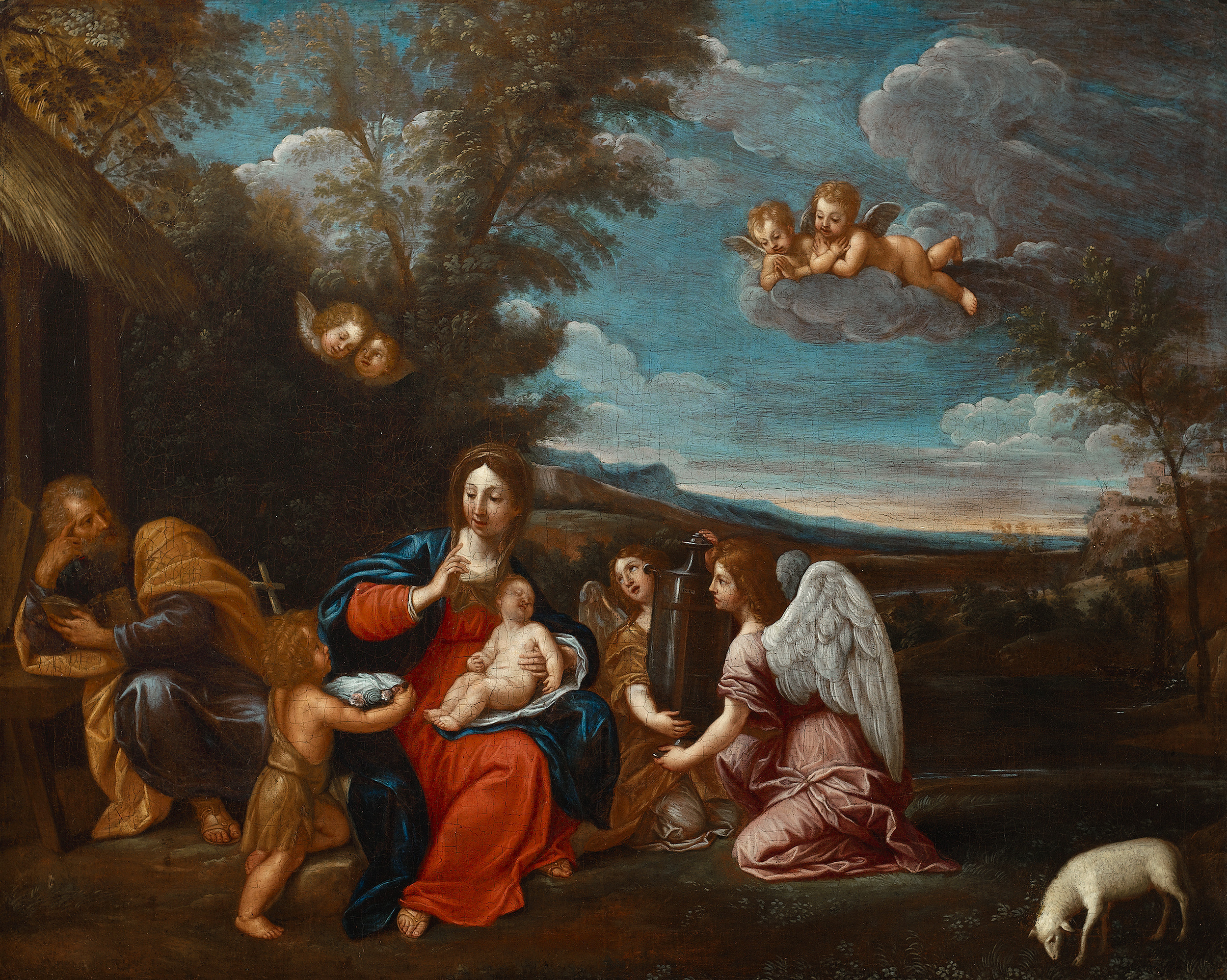 Żywa kolorystyka dzieła barokowego twórcy idealnie współgra z pogodnym charakterem scenki. Rysunek jest na tyle dokładny, że oddaje nawet na tak stosunkowo niewielkim formacie, poruszenie tak w geście, jak i powiewie wiatru. Święta Rodzina to mozaika motywów przewijających się niczym refren przez dzieła Albaniego, który dzięki swym urokliwym pejzażom ze sztafażem zaskarbił sobie miano Anakreonta malarstwa. Trzeba przyznać, że z niezrównanym wyczuciem potrafił wniknąć w atmosferę wydarzeń znanych z opowieści biblijnych, nadając im magiczną, baśniową jakość.