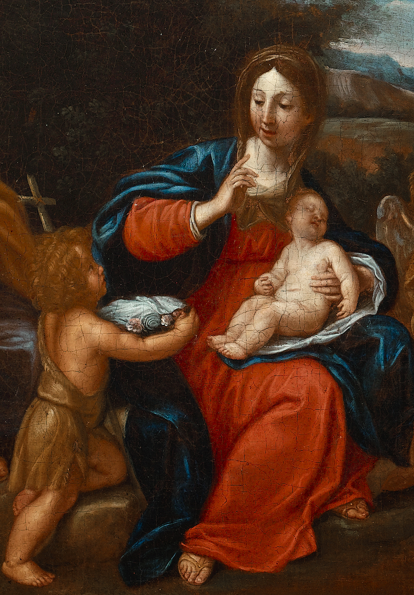 Intymność rodzinnego zgromadzenia ukazano z taką emfazą, że rzec by można iż ocierają się niebezpiecznie o zbytni patos, gdyby nie to, że taka właśnie była rola tych scenek – przeznaczone do prywatnej pobożności miały one poruszać, zaciekawiać, skłaniać do interakcji. Chodziło o taki dobór czytelnych znaków, z którymi ówczesny widz mógł się jasno identyfikować. Stąd widzimy tu tak charakterystyczne typy postaci-toposów: siedzący przy warsztacie ciesielskim św. Józef, medytujący nad Biblią, upozowany na myśliciela; Maryja zastygła w pozie do złudzenia przypominającej tę ze Zwiastowania; anioły adorujące małego Jezusa, zarówno te klęczące przy Nim – zawsze gotowi do usług akolici, jak te unoszące się w powietrzu na znak Bożej Opatrzności. Idylliczny nastrój sceny mącą niedostrzegalne zrazu, jednak obecne aluzje do przyszłej zbawczej Męki Chrystusa: sen Dzieciątka jako zapowiedź snu wiecznego, krzyż wyryty na kamiennej wazie trzymanej przez klęczące anioły czy pasący się nieopodal baranek.