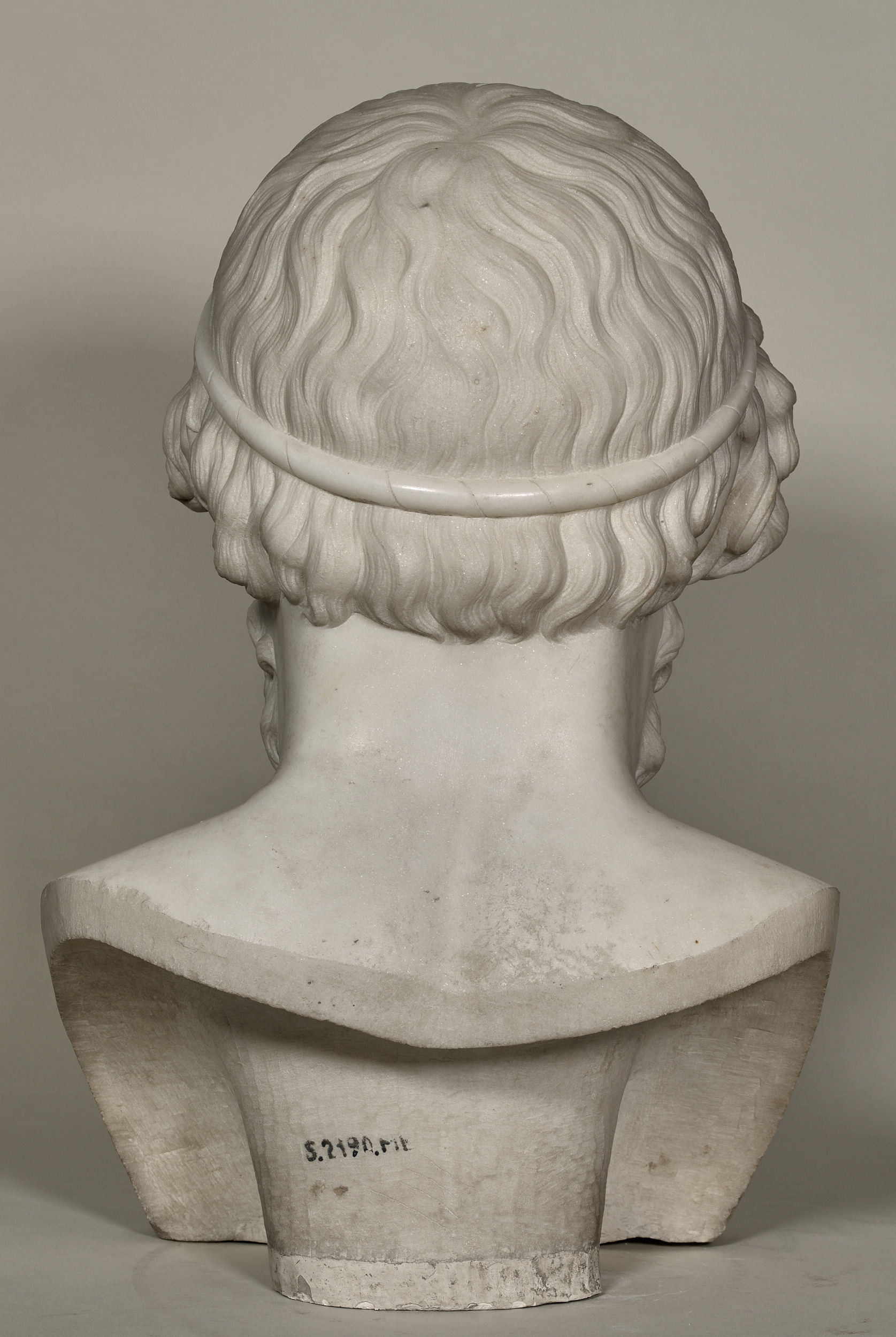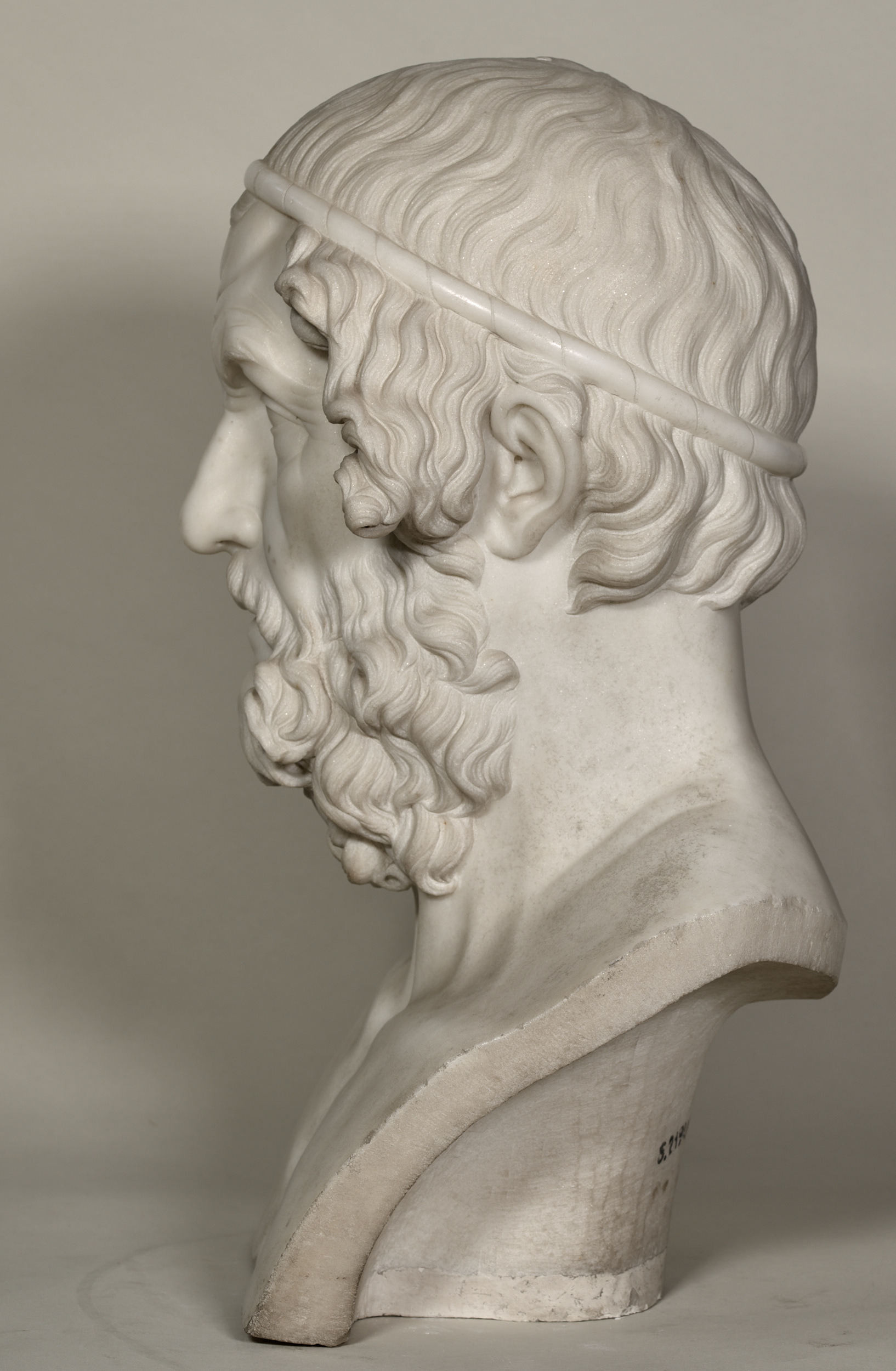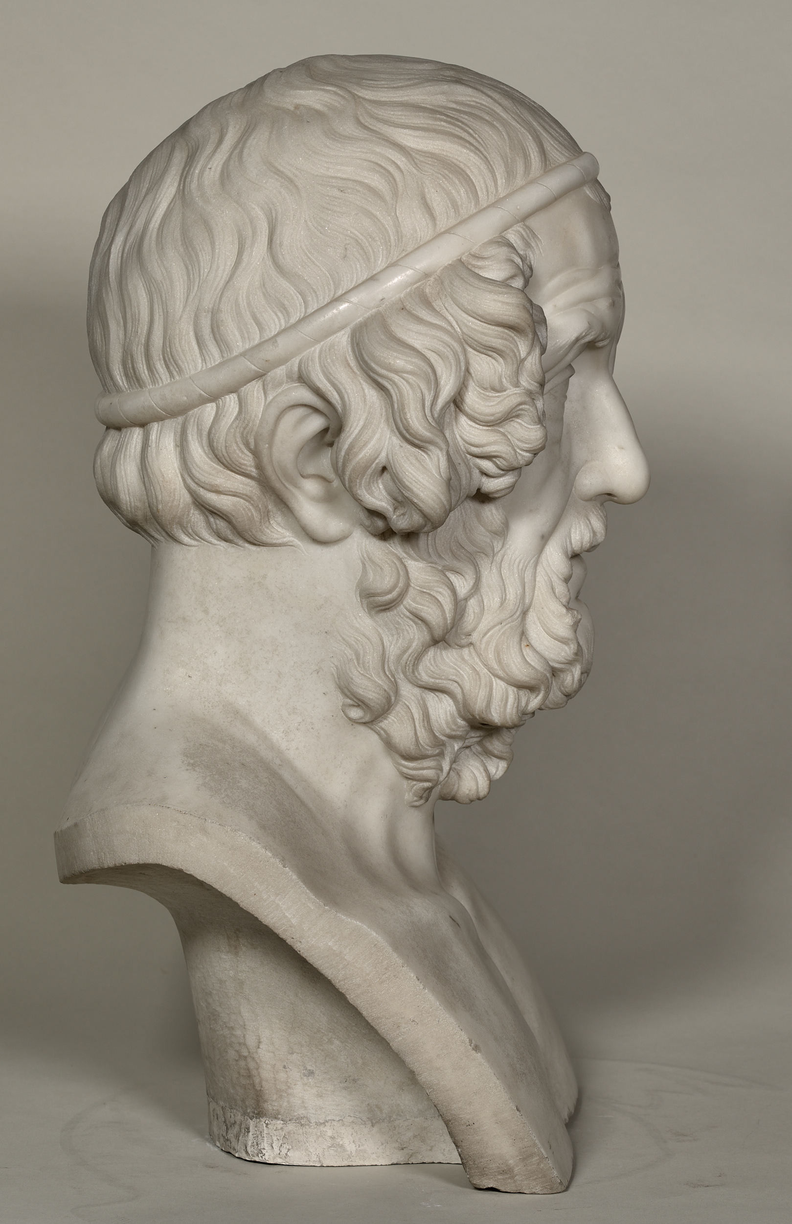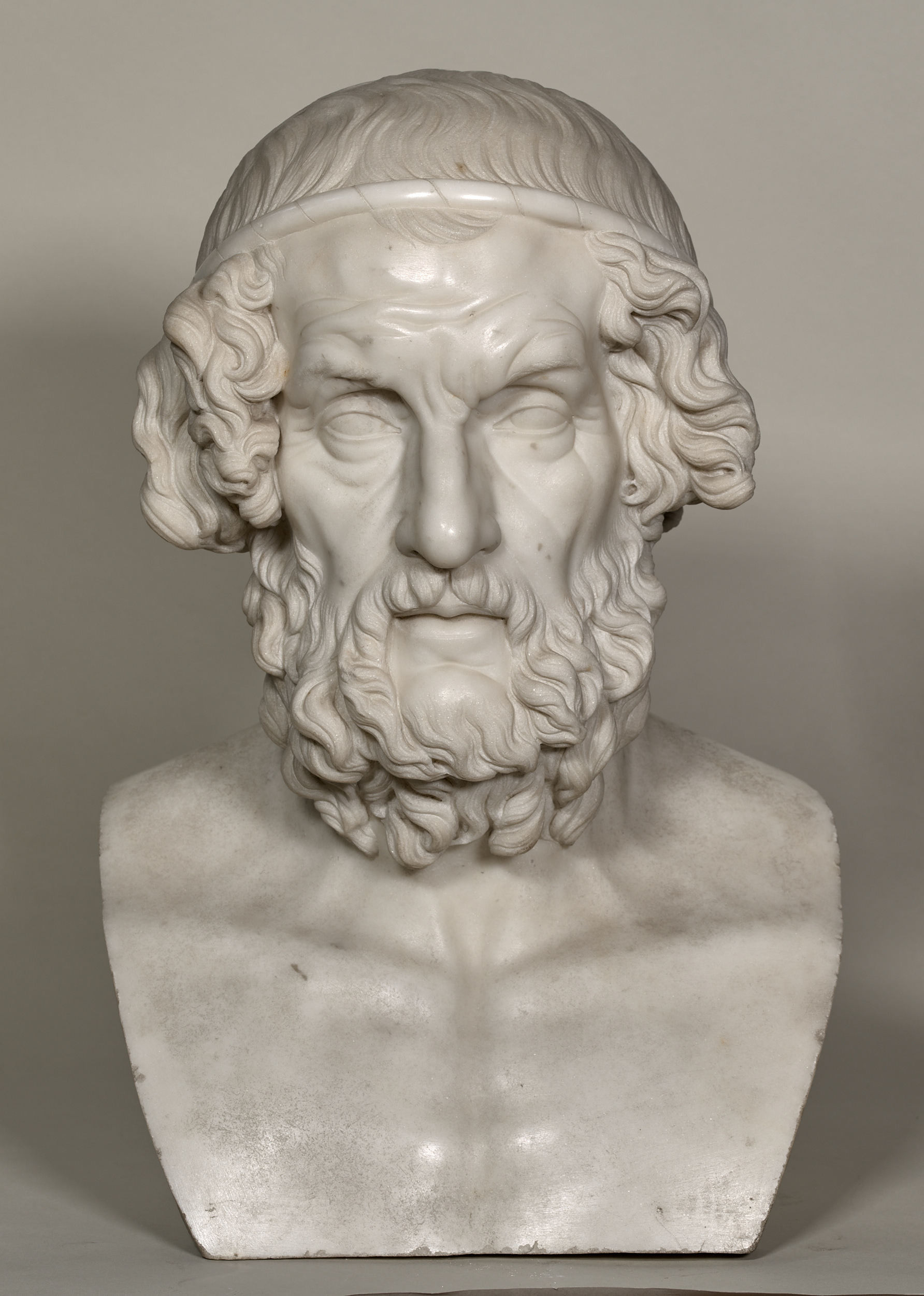 Homer to poeta grecki żyjący w VIII w. p.n.e., autor Iliady i Odysei. O jego życiu nic nie wiadomo, jego wyglądu nie utrwaliły żadne przekazy. W starożytności opowiadano o nim, że był ślepy. Łańcuckie marmurowe popiersie jest kopią antycznej, rzymskiej hermy marmurowej znajdującej się w zbiorach British Museum w Londynie wykonanej według rzeźby greckiej przypuszczalnie z II w. p.n.e. Jest to portret wyimaginowany, z okresu hellenistycznego, należący do typu portretów Homera przedstawiających go jako ślepca (por. popiersie Homera, nr inw. S. 2192 MŁ). Homer przedstawiony jest jako stary, łysiejący mężczyzna o twarzy z zapadniętymi policzkami i zmarszczkami, z małymi, gładkimi gałkami ocznymi w zapadniętych oczodołach, pod wysokimi, opadającymi łukami brwiowymi. Wąskie usta są rozchylone. Pukle brody wężowato skręcone sięgają policzków. Opadające spod opaski włosy tworzą przy twarzy zwartą masę plastycznie opracowanych wężowatych pukli układających się w różnych kierunkach. Twórca łańcuckiego popiersia Homera nie jest znany, powstało ono na przełomie XVIII i XIX w. W zbiorach łańcuckiego zamku znajduje się ono od 1948 r. Przejęte zostało przez muzeum ze Składnicy Muzealnej w Przeworsku utworzonej w upaństwowionym w 1944 r. pałacu Lubomirskich, obejmującej tamtejsze zbiory sztuki. Eksponowane jest w Galerii Rzeźb.
