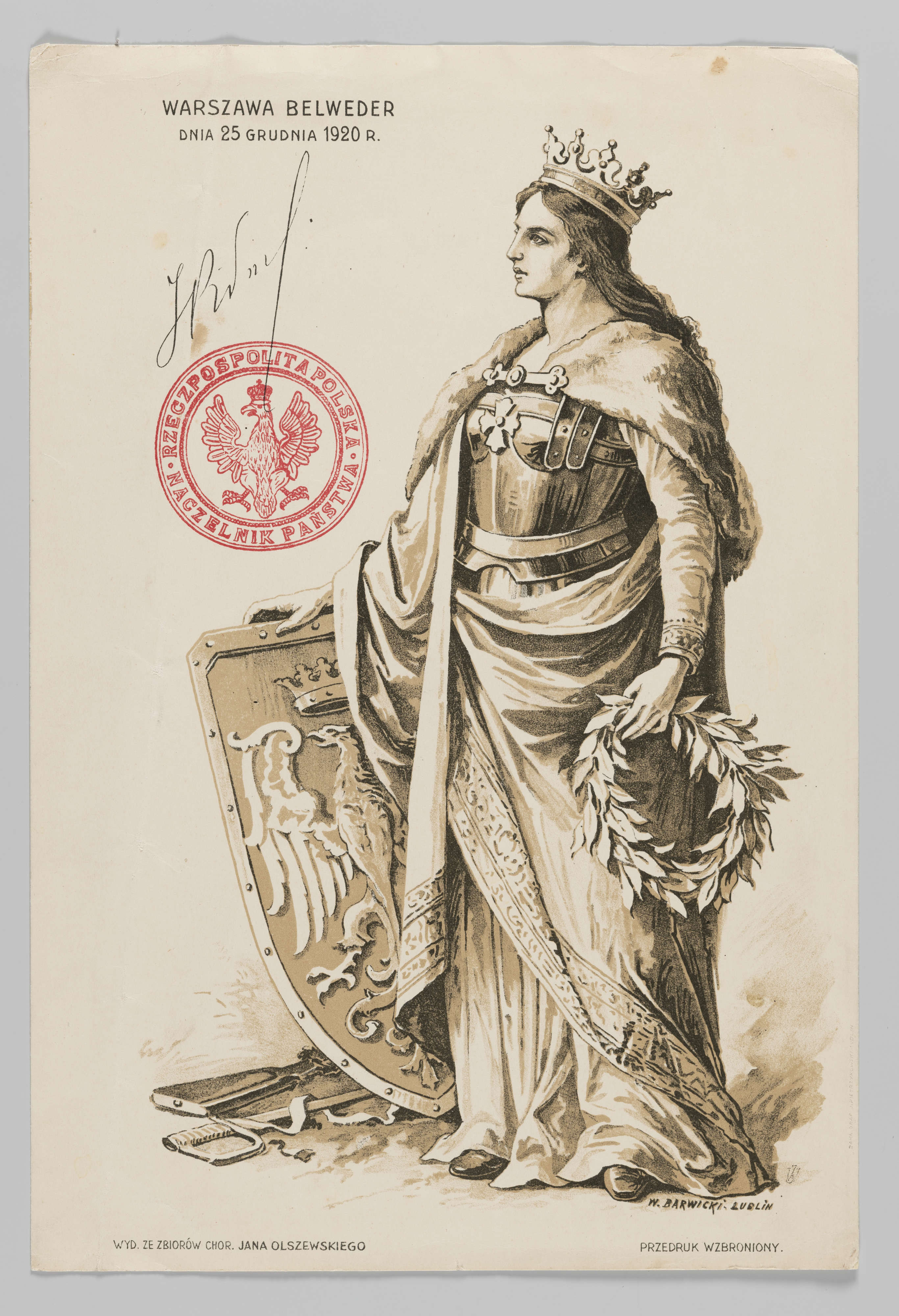 Przedstawienie Polski pod postacią królowej po odzyskaniu niepodległości było bardzo popularne, chociaż ten fakt historyczny niejako zwolnił artystów z obowiązku krzepienia serc. Uwolnieni od powinności wobec narodu zajęli się poszukiwaniem stylu narodowego w sztuce, czerpiąc ze zdobyczy francuskiego postimpresjonizmu i polskiej sztuki ludowej. Mimo to wciąż było duże zapotrzebowanie na treści patriotyczne w sztuce, które służyły budowaniu obrazu państwa tworzącego się na nowo. Dlatego z wizerunku Polonii przebija duma, spokój i potęga. Przedmioty, które towarzyszą kobiecie, jak: korona, zbroja, długi płaszcz, tarcza i wieniec laurowy, nie pozostawiają wątpliwości, że patrzymy na silną królową. Umieszczenie pieczęci i podpisu naczelnika państwa Józefa Piłsudskiego podkreśla znaczenie propagandowe grafiki.