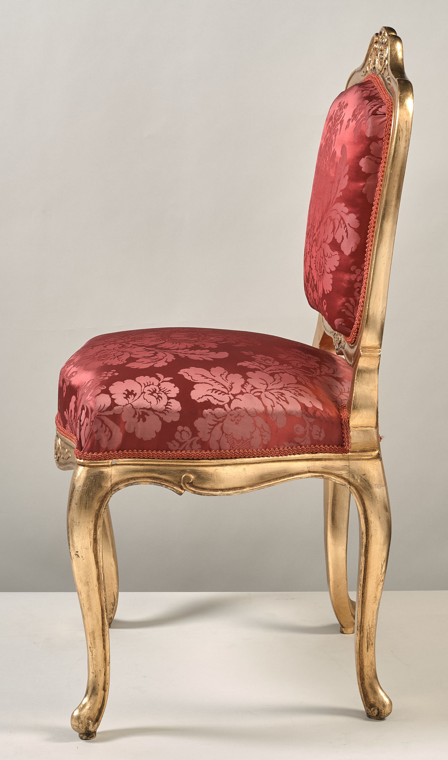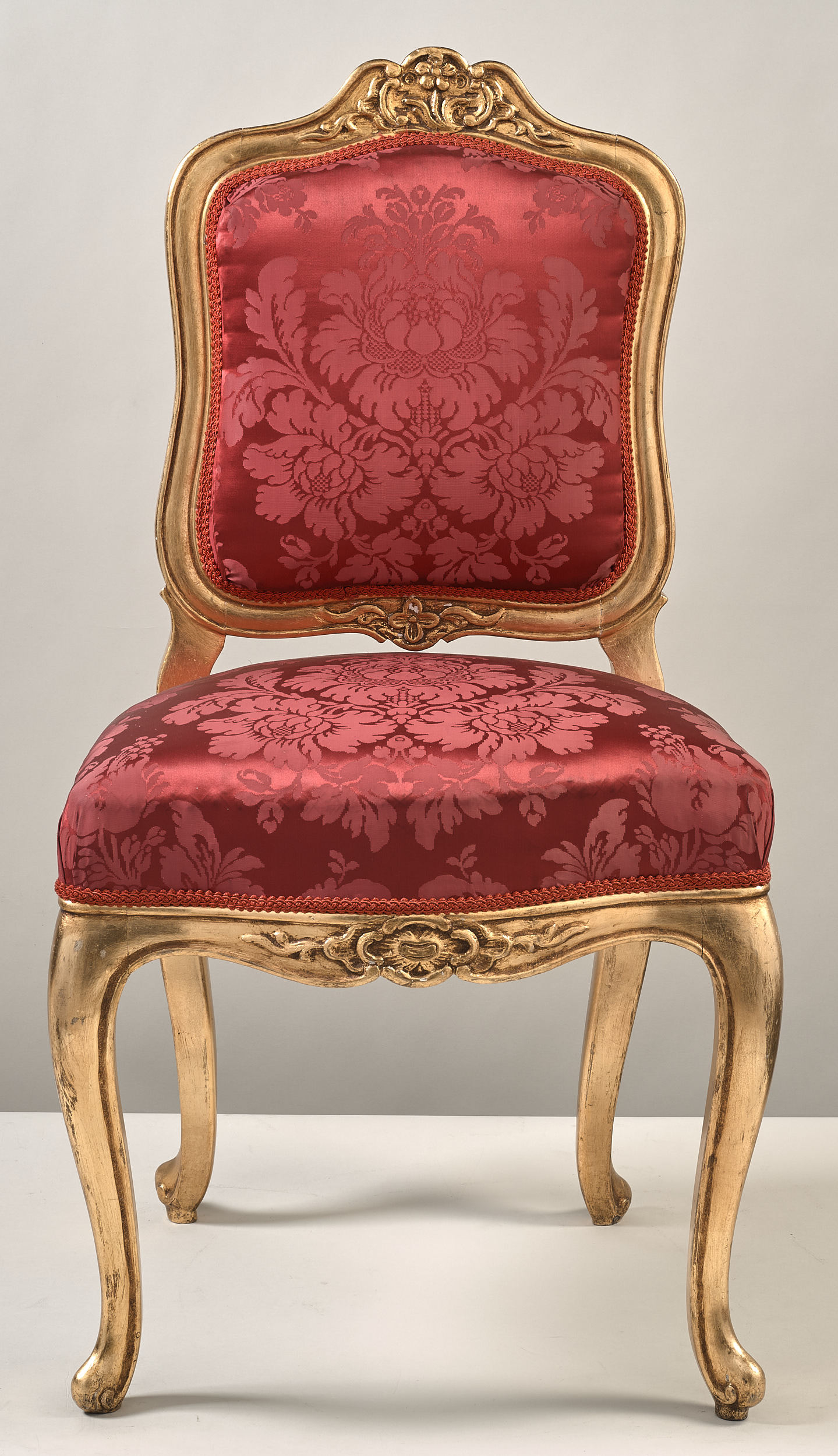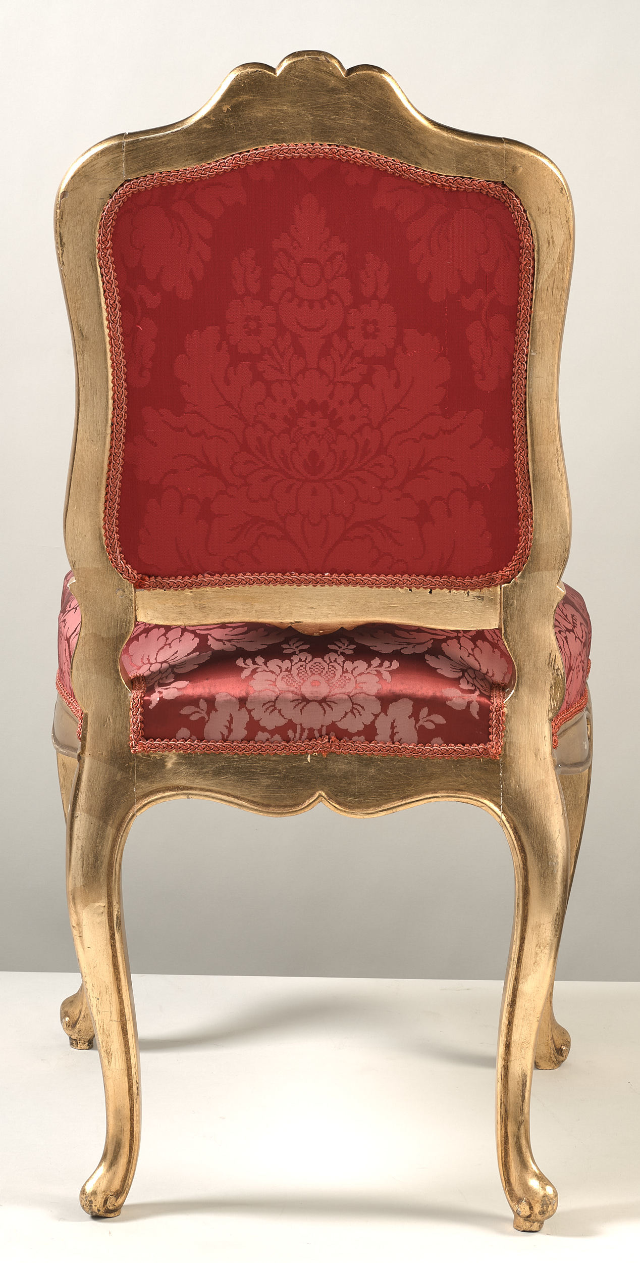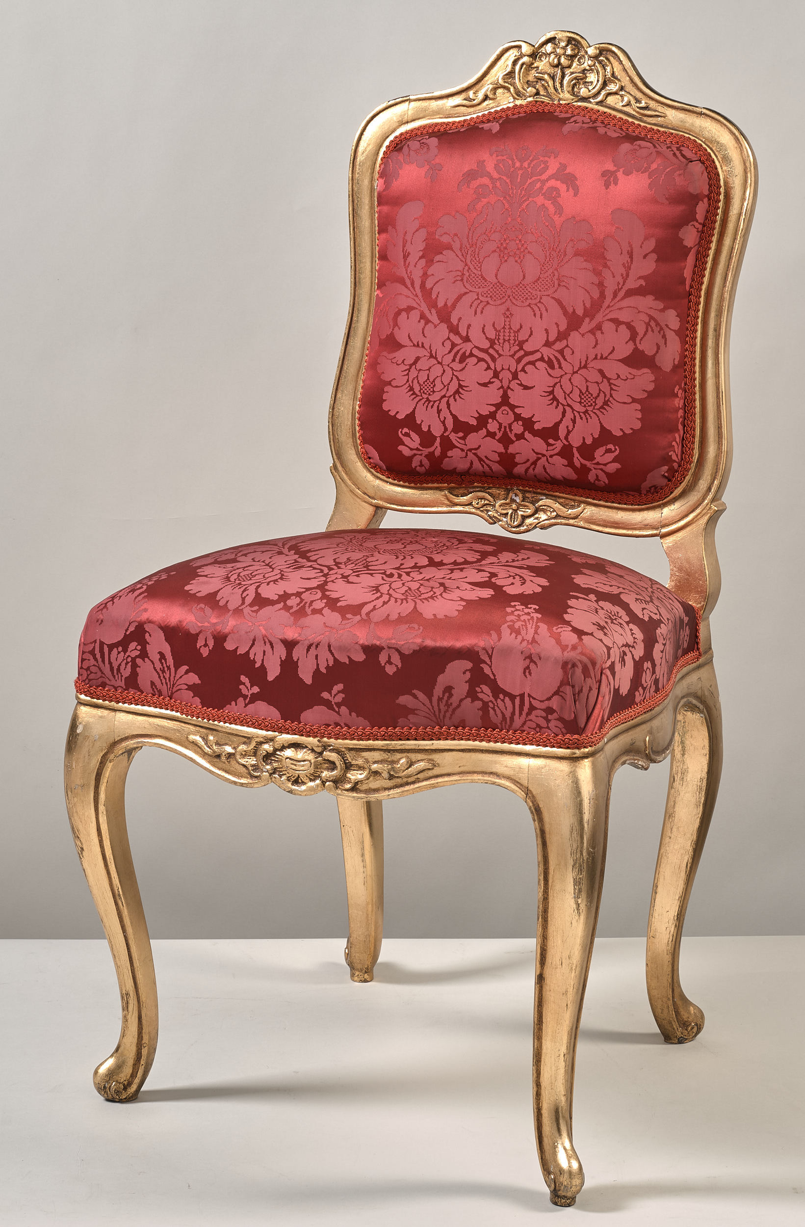 Prezentowane krzesło jest pochodzącym z darów nabytkiem Muzeum-Zamek w Łańcucie. Złocony, ozdobiony snycerką i tapicerowany mebel uzupełnił wyposażenie „Saloniku Rokokowego” na drugim piętrze zamku. W drugiej połowie XIX w. pomieszczenie wraz z sąsiadującymi wnętrzami należało do apartamentów kolejnych młodych małżeństw rodu Potockich, Alfreda II i jego żony Marii z Sanguszków oraz Romana i jego żony Elżbiety z Radziwiłłów. Skompletowany przez muzeum w saloniku zestaw francuskich mebli w stylu Ludwika XV (rokoko) uzupełnia klimat prywatnego mieszkania z czasów, gdy zapanowała moda na minione style historyczne, w tym przypadku – drugie rokoko. Na wyposażeniu „Saloniku Rokokowego” znajduje się komplet pięciu krzeseł sygnowanych znakiem wykonawcy: ujęta w owal litera „K” poprzedzona krzyżem łacińskim (S.10674MŁ; S.10675MŁ; S.10676MŁ; S.10677MŁ; S.10678MŁ). Jak dotąd nie udało się ustalić personaliów mistrza stolarskiego posługującego się tym podpisem.