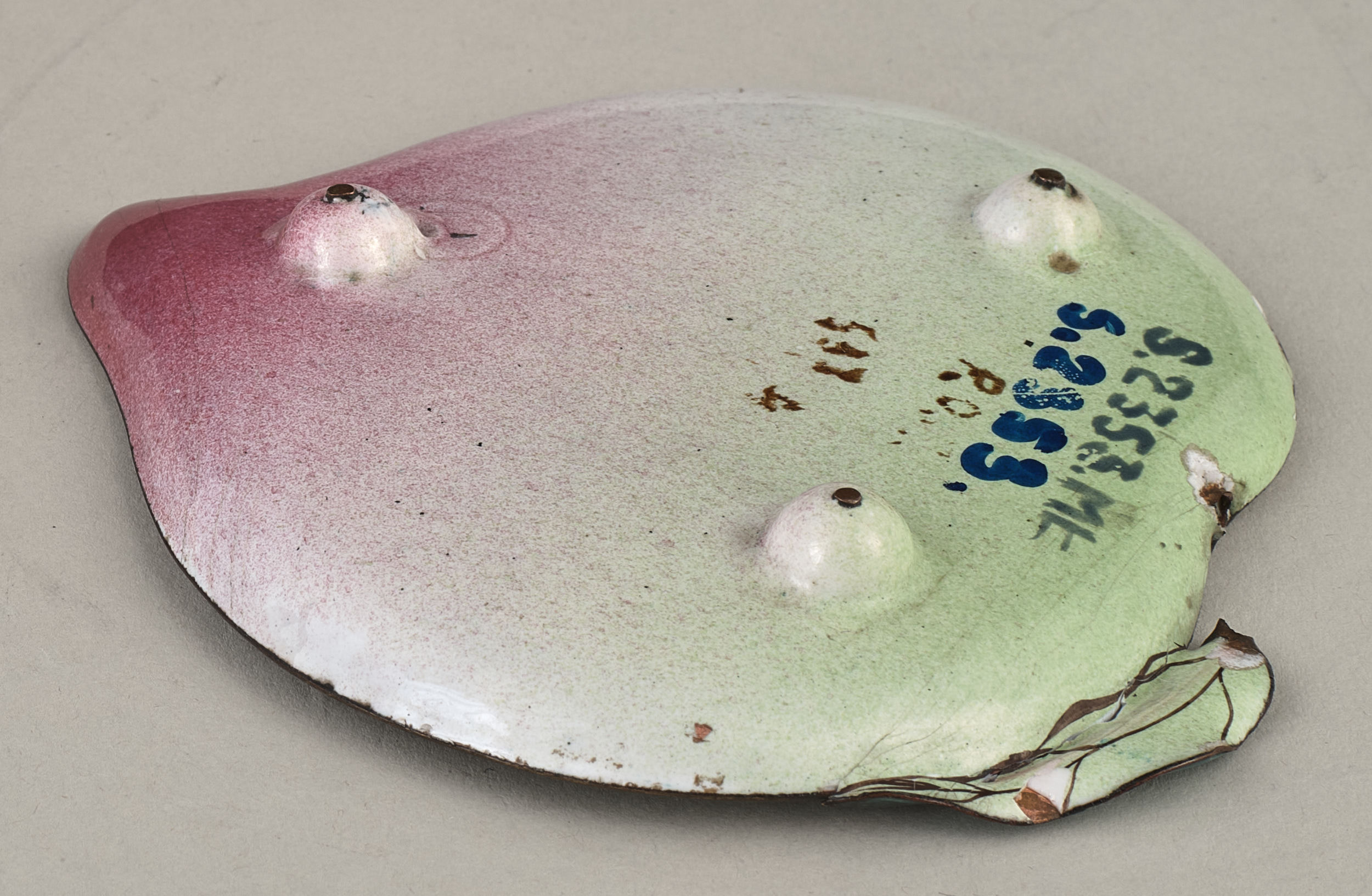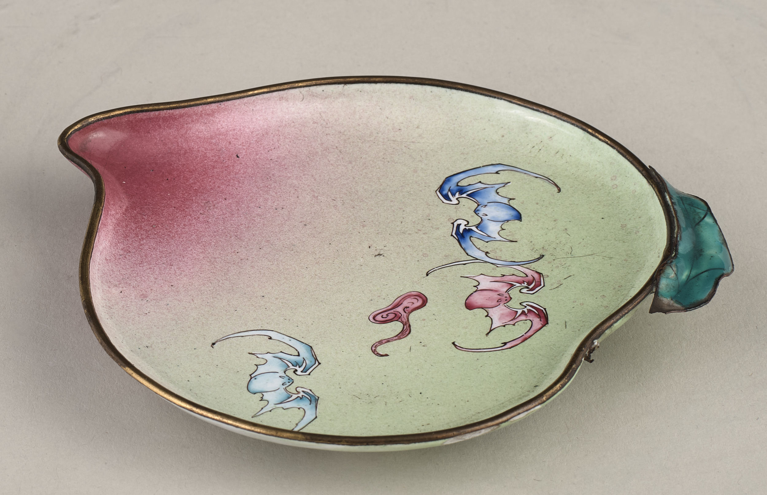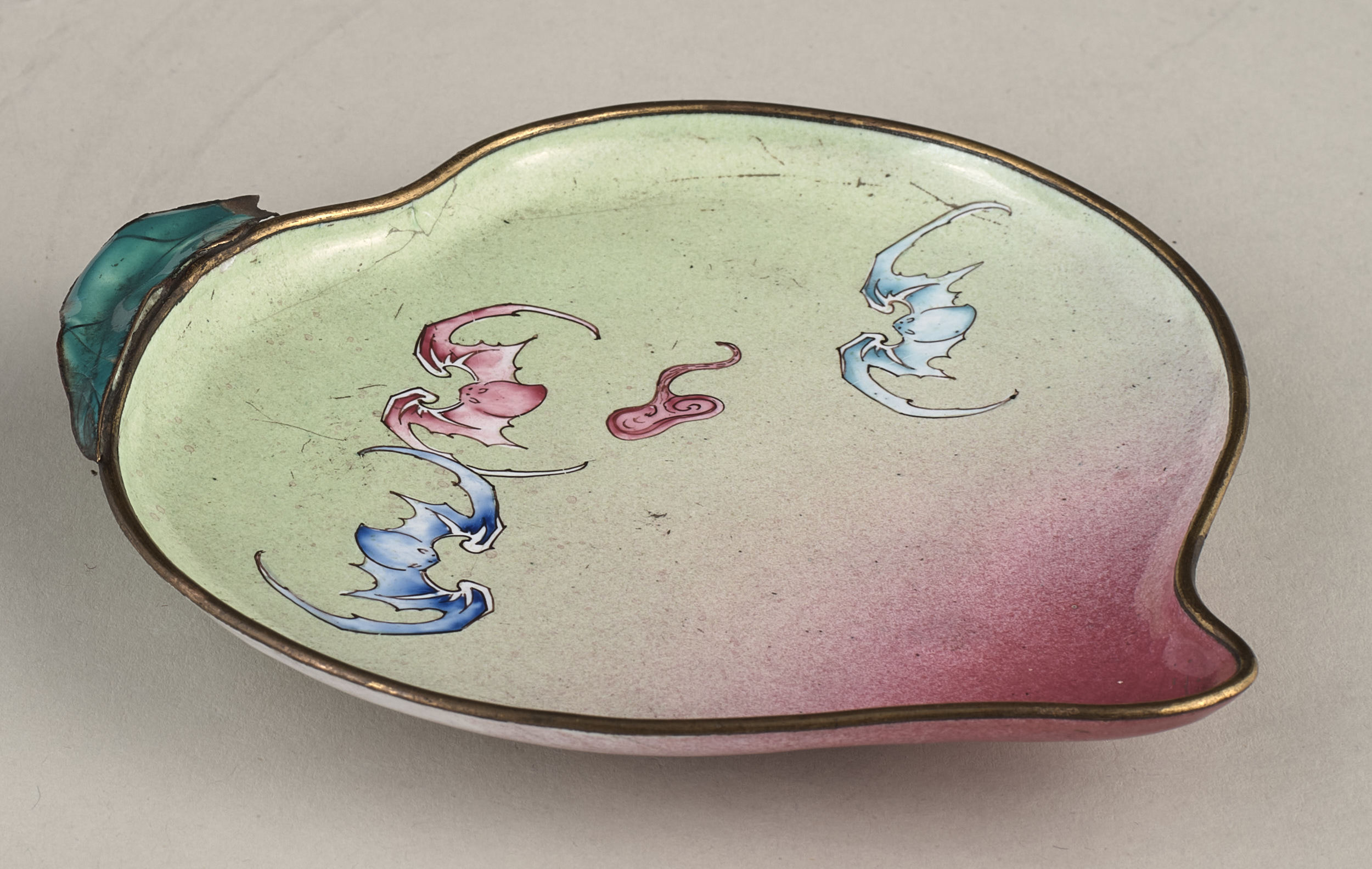 Spodek miedziany na trzech niskich nóżkach w kształcie przepołowionego owocu brzoskwini z uchwytem w formie gałązki. Pokryta została emalią typu fa-lang, z zewnątrz w kolorze zielonym przenikającym stopniowo w różowy, wewnątrz różowym. Lustro zdobione motywem trzech nietoperzy i stylizowanymi obłokami w kolorze silnego różu. Czareczka datowana jest na XVIII/XIX wiek. Według symboliki chińskiej nietoperz jest symbolem szczęścia  i długowieczności. Nietoperz w języku chińskim jest homonimem słowa „fu” - szczęście. Chiński podziw dla nietoperzy zaczął się tysiące lat przed Chrystusem. W ramach podziału świata ożywionego i nieożywionego, gdzie przeplatają się ze sobą pierwiastki męskie i żeńskie, dobro i zło, siły bierne i aktywne, nietoperzom przypisano związek z pierwiastkiem męskim, wręcz męskością jako taką. Dlatego też stworzenia te przedstawiano często w otoczeniu kwiatów i owoców związanych z pierwiastkiem żeńskim, ze światem kobiet. Nietoperze przedstawiano często z brzoskwinią, symbolem płodności. W okresie panowania Mandżurów nietoperze były w Chinach popularnym motywem zdobniczym. Dekorowano nimi wazy i czarki do herbaty, haftowano je na szatach cesarzy i rzeźbiono na meblach i tronach cesarskich.