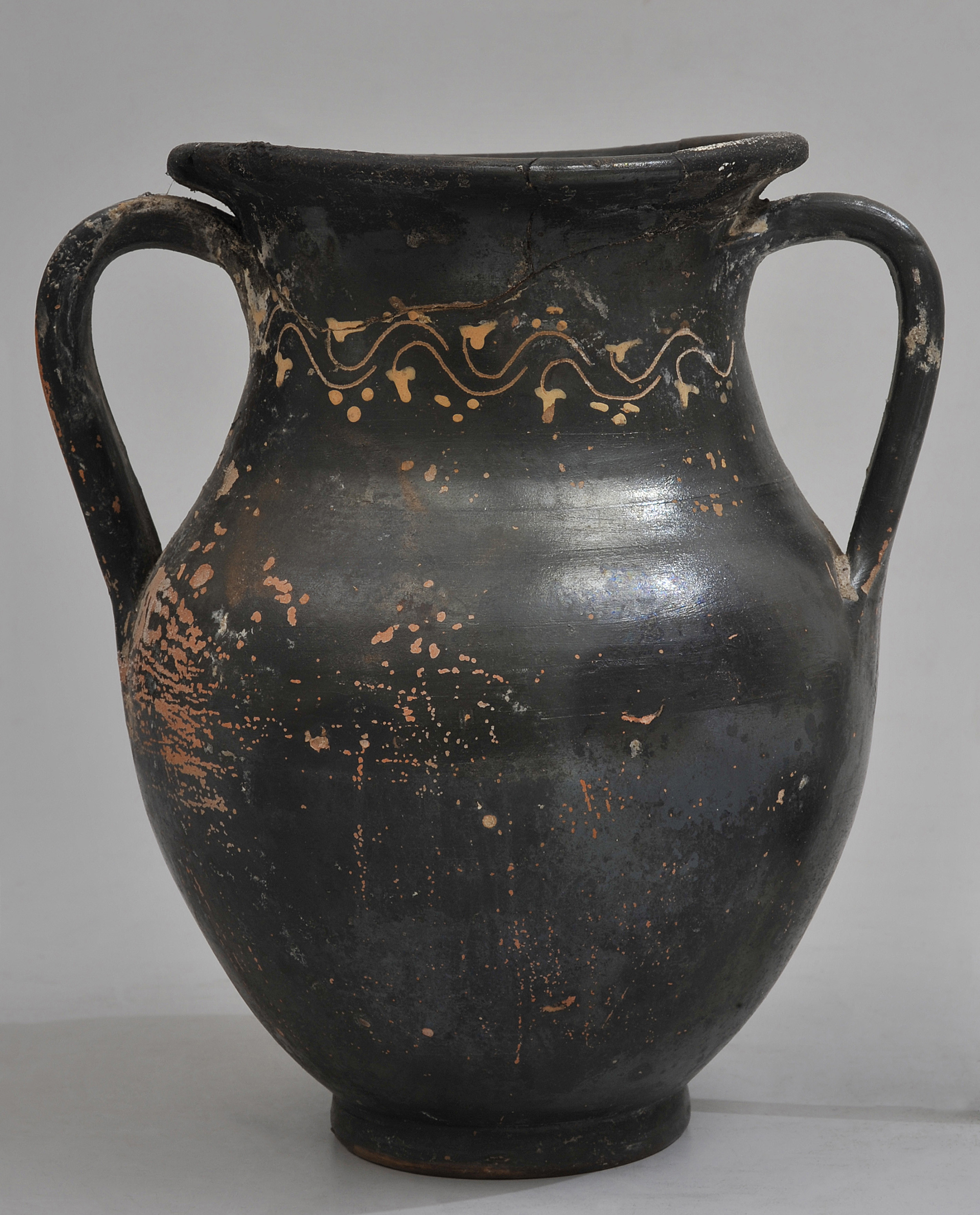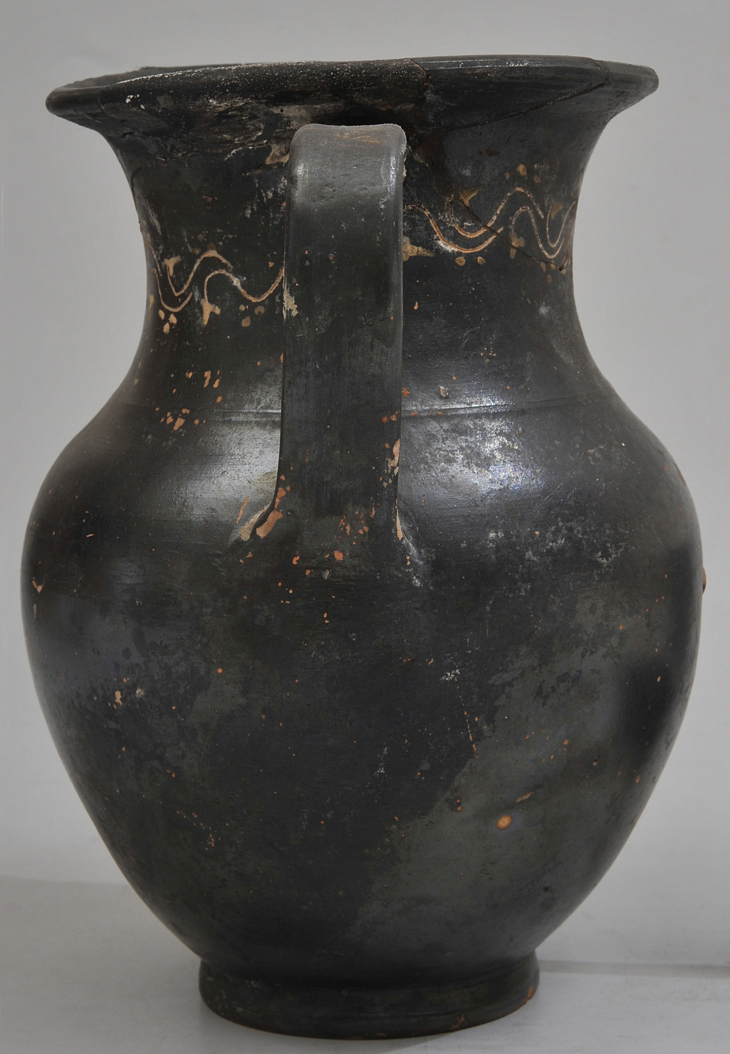 Pelike wykonano w technice często spotykanej w ceramice Starożytnej Grecji. Po lekkim podeschnięciu naczyń uformowanych najczęściej na kole garncarskim ich powierzchnię pokrywano firnisem, czyli delikatną, specjalnie przygotowaną i oczyszczoną glinką bogatą w żelazo. Na szyjce naczynia wydrapano w niej prostą dekorację – dwie falujące linie z odchodzącymi od nich liśćmi i uproszczonymi owocami. Czarny kolor pojawiał się na naczyniu dopiero po wypale w piecu. Najpierw wypalano je w atmosferze z dostępem tlenu, a po osiągnięciu odpowiedniej temperatury odcinano jego dopływ (zamykając otwory pieca i być może dokładając mokrego drewna), dzięki czemu zawarte w wierzchniej glince tlenki żelaza ulegały redukcji i zmieniały kolor z czerwonego na czarny. Glinka ta także lekko się nadtapiała – nadając naczyniom charakterystyczny, satynowy połysk. Dekoracja rytowana – niepokryta firnisem, odsłoniła natomiast kolor gliny.