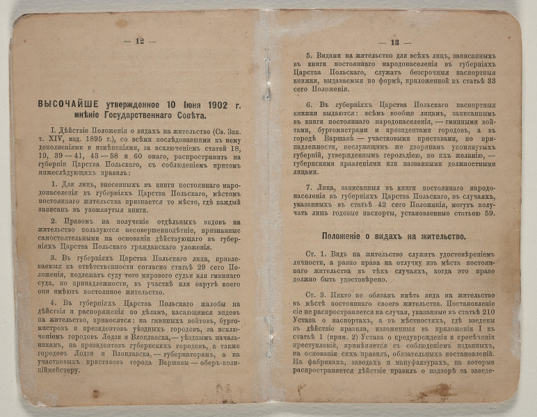 […] 1. Dla osób, wpisanych do ksiąg ludności stałej w guberniach Królestwa Polskiego, miejscem stałego zamieszkania jest to miejsce, gdzie każdy jest wpisany do wspomnianych ksiąg. [zob. Grzegorz Smyk, Instrumentalizacja procesu legislacyjnego w carskiej Rosji i jej wpływ na specyfikę rosyjskiego systemu źródeł prawa, „Czasopismo Prawno-Historyczne”, tom LXV, zeszyt 2, 2013.]
