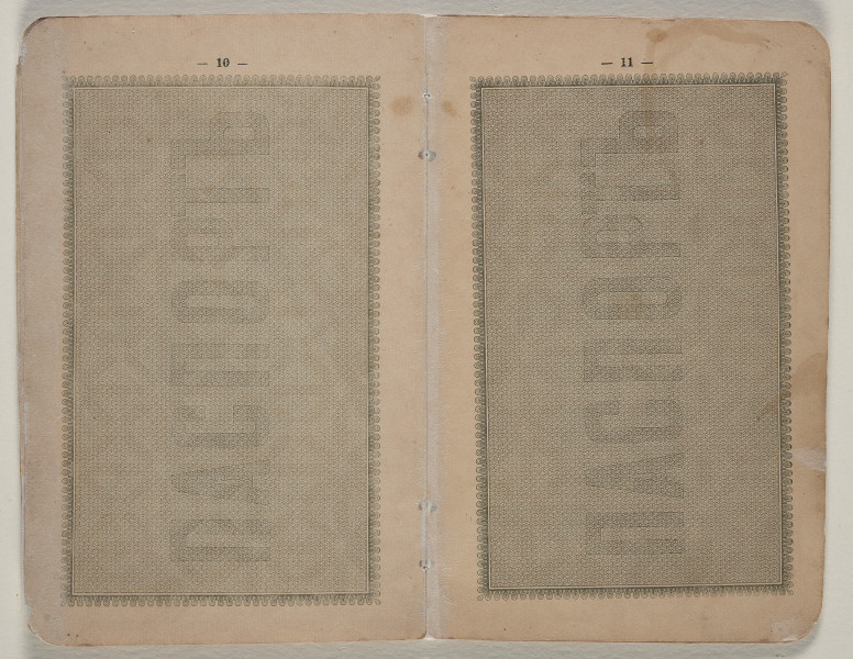 Na każdej stronie do s. 11 włącznie - nadrukowany szary (z drobnym wewnątrz wzorem dającym efekt zacienienia wnętrza) prostokąt tła, z ozdobną krawędzią, kończący się na około 1 cm od krawędzi karty. Bokiem napis przez całość prostokąta: PASZPORT