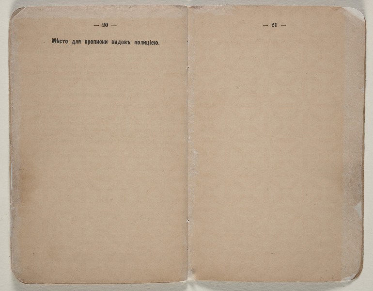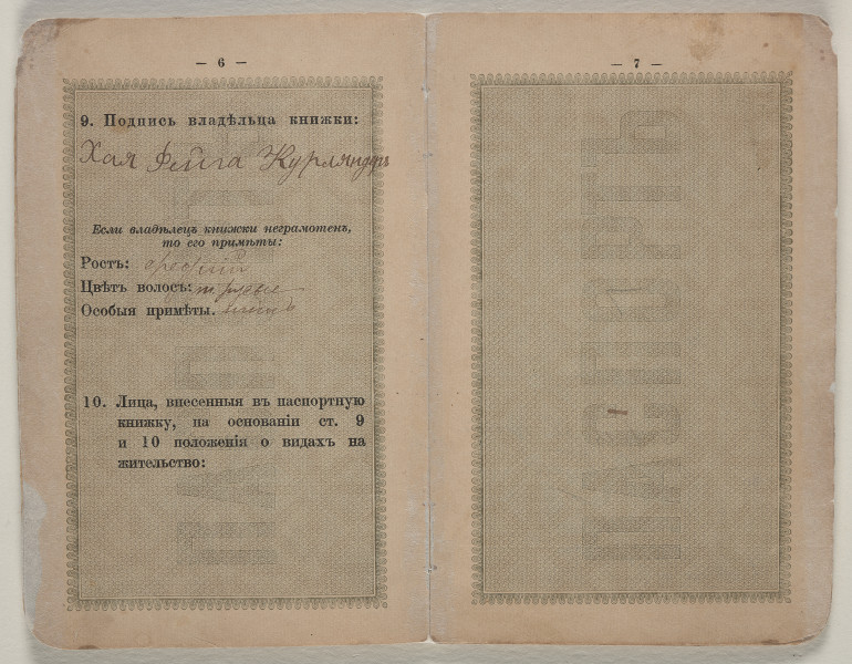 Paszport rosyjski (i rosyjskojęzyczny) Chai Fejgi Ariewnej Kurlander, polskiej Żydówki z Tykocina, która wyemigrowała do Stanów Zjednoczonych latem 1907 roku (Atlantyk przepłynęła duńskim statkiem Rijndam, do USA dopłynęła 27 sierpnia, po 10 dniach od wypłynięcia z Rotterdamu).