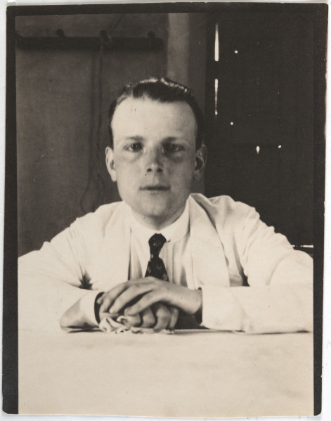 Fotografia przedstawiająca Alfreda Antoniego Potockiego, przyszłego IV ordynata łańcuckiego siedzącego przy stole w nieokreślonym wnętrzu. Alfred Potocki ukazany en face, w popiersiu, z rękami leżącymi przed nim na stole przykrytym białym obrusem. Alfred Potocki w białym smokingu i białej koszuli z ciemnym krawatem. W prawej dłoni trzyma zwiniętą biała serwetę Fotografia wykonana najprawdopodobniej podczas podróży do Indii w 1910 roku.