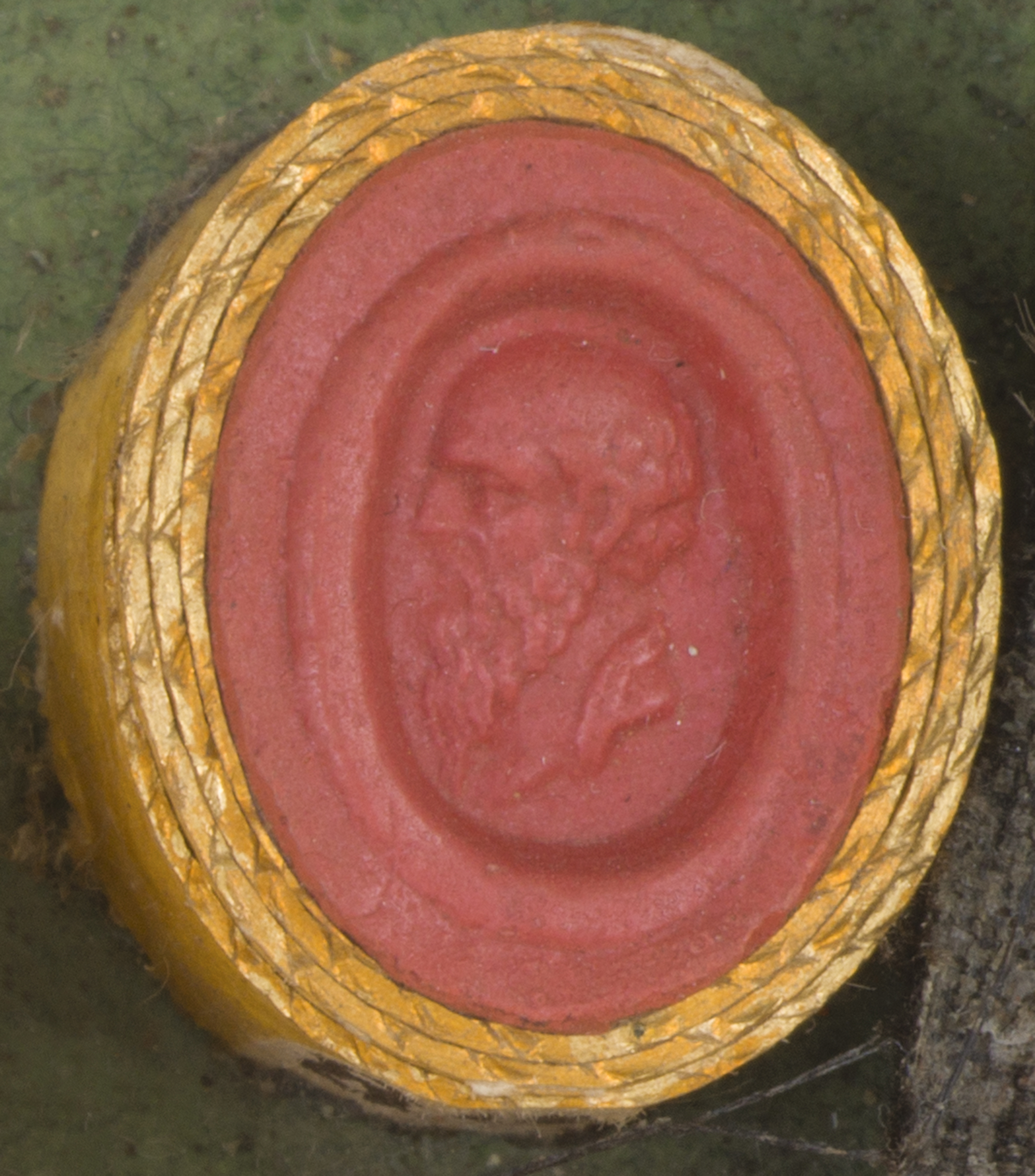 Prezentowany obiekt to owalny, wypukły wycisk na bardzo wklęsłym tle, otoczony grubym wałkiem z marginesem. Przedstawia on głowę starszego mężczyzny z lewego profilu, z krótkimi włosami i brodą. Widoczny jest fragment ubrania. Sposób przedstawienia pozwala przypuszczać, że może to być wizerunek starożytnego filozofa. Podobny wycisk jak opisany znajduje się w „Dactyliothecae universalis” Philippa Daniela Lipperta.